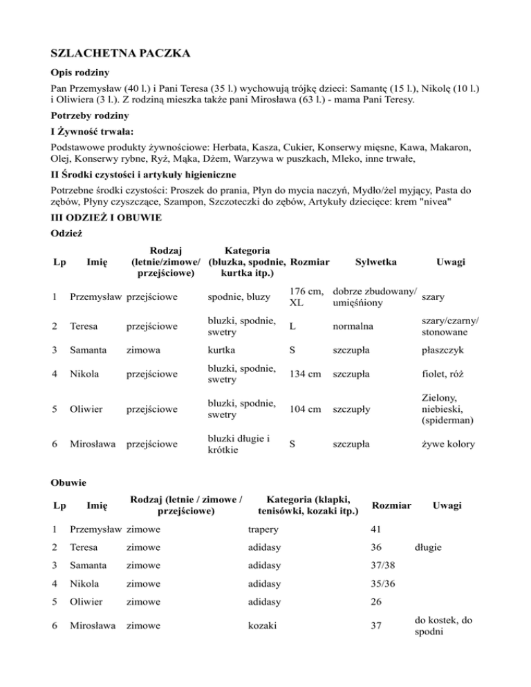 SZLACHETNA PACZKA Opis rodziny Pan Przemysław (40 l.) i Pani Teresa (35 l.) wychowują trójkę dzieci: Samantę (15 l.), Nikolę (10 l.) i Oliwiera (3 l.). Z rodziną mieszka także pani Mirosława (63 l.) - mama Pani Teresy. Potrzeby rodziny I Żywność trwała: Podstawowe produkty żywnościowe: Herbata, Kasza, Cukier, Konserwy mięsne, Kawa, Makaron, Olej, Konserwy rybne, Ryż, Mąka, Dżem, Warzywa w puszkach, Mleko, inne trwałe, II Środki czystości i artykuły higieniczne Potrzebne środki czystości: Proszek do prania, Płyn do mycia naczyń, Mydło/żel myjący, Pasta do zębów, Płyny czyszczące, Szampon, Szczoteczki do zębów, Artykuły dziecięce: krem "nivea" III ODZIEŻ I OBUWIE Odzież Lp Imię Rodzaj Kategoria (letnie/zimowe/ (bluzka, spodnie, Rozmiar przejściowe) kurtka itp.) Sylwetka Uwagi 1 Przemysław przejściowe spodnie, bluzy 176 cm, dobrze zbudowany/ szary XL umięśńiony 2 Teresa przejściowe bluzki, spodnie, swetry L normalna szary/czarny/ stonowane 3 Samanta zimowa kurtka S szczupła płaszczyk 4 Nikola przejściowe bluzki, spodnie, swetry 134 cm szczupła fiolet, róż 104 cm szczupły Zielony, niebieski, (spiderman) S szczupła żywe kolory 5 Oliwier przejściowe bluzki, spodnie, swetry 6 Mirosława przejściowe bluzki długie i krótkie Obuwie Lp Imię Rodzaj (letnie / zimowe / przejściowe) Kategoria (klapki, tenisówki, kozaki itp.) Rozmiar 1 Przemysław zimowe trapery 41 2 Teresa zimowe adidasy 36 3 Samanta zimowe adidasy 37/38 4 Nikola zimowe adidasy 35/36 5 Oliwier zimowe adidasy 26 6 Mirosława zimowe kozaki 37 Uwagi długie do kostek, do spodni IV Materiały szkolne: Zeszyty, Farbki, Papier kolorowy, Plecak, Bloki, Klej, Nożyczki, Przybory do pisania, Kredki, Plastelina, Piórnik V Wyposażenie mieszkania: Kołdra, Koc, Pościel, Poduszka VI Brakujące sprzęty gospodarstwa domowego: Pralka - pani Teresa ma stary i popsuty automat. VII Szczególne upominki świąteczne: Samanta - kosmetyki. Nikola - lalka Barbie z ubrankami. Oliwier - klocki Lego. Pan Przemysław zawsze marzył o elektrycznej maszynce do golenia. Pani Teresa zawsze chciała mieć robota kuchennego, zdaje sobie sprawę, że to drogi sprzęt dlatego dodała, że ucieszyłaby się z jakiegoś kosmetyku. Pani Mirosława lubi rozwiązywać krzyżówki. Najważniejsze potrzeby: Żywność Rodzina nie zawsze może sobie na wszystko pozwolić, a przecież żywność jest istotną potrzebą. Odzież i buty Zbliża się zima, rodzinie przyda się ciepła odzież i obuwie. Pralka Automat który ma rodzina jest już stary i popsuty, a nie stać rodziny na nowy.