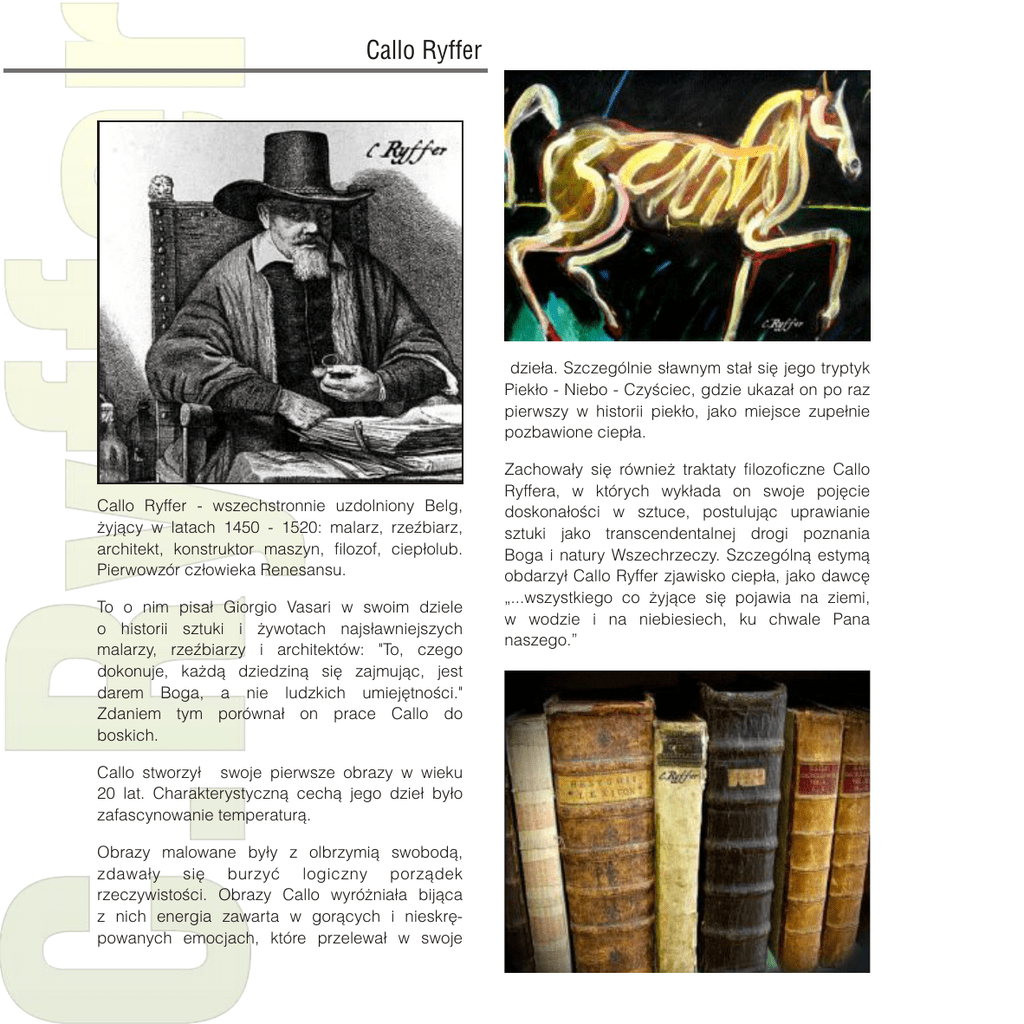 Callo Ryffer dzieła. Szczególnie sławnym stał się jego tryptyk Piekło - Niebo - Czyściec, gdzie ukazał on po raz pierwszy w historii piekło, jako miejsce zupełnie pozbawione ciepła. Callo Ryffer - wszechstronnie uzdolniony Belg, żyjący w latach 1450 - 1520: malarz, rzeźbiarz, architekt, konstruktor maszyn, filozof, ciepłolub. Pierwowzór człowieka Renesansu. To o nim pisał Giorgio Vasari w swoim dziele o historii sztuki i żywotach najsławniejszych malarzy, rzeźbiarzy i architektów: "To, czego dokonuje, każdą dziedziną się zajmując, jest darem Boga, a nie ludzkich umiejętności." Zdaniem tym porównał on prace Callo do boskich. Callo stworzył swoje pierwsze obrazy w wieku 20 lat. Charakterystyczną cechą jego dzieł było zafascynowanie temperaturą. Obrazy malowane były z olbrzymią swobodą, zdawały się burzyć logiczny porządek rzeczywistości. Obrazy Callo wyróżniała bijąca z nich energia zawarta w gorących i nieskrępowanych emocjach, które przelewał w swoje Zachowały się również traktaty filozoficzne Callo Ryffera, w których wykłada on swoje pojęcie doskonałości w sztuce, postulując uprawianie sztuki jako transcendentalnej drogi poznania Boga i natury Wszechrzeczy. Szczególną estymą obdarzył Callo Ryffer zjawisko ciepła, jako dawcę „...wszystkiego co żyjące się pojawia na ziemi, w wodzie i na niebiesiech, ku chwale Pana naszego.” Callo Ryffer Za cel i dzieło życia postawił on sobie uchwycenie idei ciepła i zatrzymanie, przedstawienie jej w jakiejkolwiek formie. Z tego okresu pochodzą pierwsze, genialne konstrukcje emitujące i przechowujące ciepło. Artysta zadziwił współczesnych instalując na targu rybnym w Rotterdamie pierwszą w historii instalację grzewczą na otwartej przestrzeni. Wtedy to wśród współczesnych zyskał przydomek „Instalatore”. Gdziekolwiek Callo użył swojego talentu wyprzedzał swój czas. Dlatego na ogół był niezrozumiany przez sobie współczesnych choć, pozostawał w ciepłych stosunkach z największymi umysłami swych czasów. Tymczasem „wielcy” malarze znani z podręczników byli tak naprawdę jego naśladowcami jak np. Leonardo da Vinci, który ideę człowieka witruwiańskiego zaczerpnął wprost ze szkicu ukochanego kota Callo. Dzieła Callo przekazywane w sekrecie z rąk do rąk wielkich artystów, wywierały na nich niezwykły wpływ. Często zatem powstawały trawestacje czy wręcz plagiaty dzieł Callo, czerpiące pełnymi garściami z jego oryginalnych pomysłów. Na skromnym pomniku w Brukseli, upamiętniającym postać Callo Ryffera zapisano jedynie dwa słowa, które Callo wypowiedział w chwili śmierci: „Więcej Ciepła”. Śledząc historię wydawałoby się, że pamięć o Callo rozpierzchła się w mgle minionych lat przyćmiona dziełami innych sławnych twórców . Tak się jednak nie stało. Otóż 14 lipca 1950 roku w Balceronie przychodzi na świat Xavier de Marcos - awangardowy współczesny artysta malarz, nowatorski designer, performer i prekursor warmizmu (od angielskiego: warm - ciepło). Jako jedyny syn arystokratycznej rodziny de Marcos. Ojciec: plantator wina i zamożny właściciel ziemski; matka: miłośniczka sztuki, mecenas artystów i nieoficjalna muza hiszpańskiej bohemy. Callo Ryffer Xavier od wczesnej młodości ogrzewa się pośród żaru zamiłowań matki i nasiąka gorącą atmosferą artystycznej awangardy, a wśród licznych gości domu de Marcos spotyka się między innymi z Pablo Picasso i Salvadore Dali. W 1965 roku, zainspirowany przeżyciami młodości, Xavier udaje się do Paryża, aby na tamtejszej Akademii studiować malarstwo. Tam, na fali rewolucyjnych nastrojów roku '68 publikuje swój manifest artystyczny: „Sztuka - Energia Ciepło”. Zawiera w nim rewolucyjne tezy, tworzące podwaliny warmizmu. Pisze tam między innymi: „ Sztuka to energia ujęta w strukturę kształtu, barwy, faktury. Zorganizowana energia zaś daje ciepło. Wielcy mistrzowie renesansu, baroku czy romantyzmu zachwycają wewnętrzną temperaturą ich dzieł. Ogrzewać umysły, ciała i dusze - oto prawdziwe zadania sztuki !” Pod koniec lat siedemdziesiątych Xavier de Marcos wyjechał z Francji w poszukiwaniu takich inspiracji. Podróżując po Europie przypadkowo natknął się na kilka zagubionych i niedocenionych dzieł w zakurzonych magazynach muzeów w Rotterdamie, Antwerpii i Dilsen. Po wielu dociekaniach Xavier odkrył, że te nieznane dzieła to prace zapomnianego Callo Ryffera. Xavier oczarowany tymi obrazami , dostrzegając bijącą z nich energię, zrozumiał, że obraz wiszący na ścianie, jest, bez względu na temat, martwy, a przeżycie słabe i w istocie nie przekazujące silniejszych emocji. „Sztuka, której nie można dotykać jest działaniem pozornym i w gruncie rzeczy salonowym” - pisał zbuntowany artysta w swoim dzienniku. Xavier de Marcos poszukiwał tworzywa, które zrealizuje jego marzenia silnego oddziaływania i prawdziwego przeżycia w kontakcie z dziełem sztuki. I tak, na początku lat osiemdziesiątych przyjmuje prowokacyjny pseudonim Callo Ryffer i nim podpisuje swój manifest. Idea Xaviera de Marcos natychmiast znajduje gorących zwolenników. Powstaje legendarna warmistyczna grupa artystyczna: CALORIA, która po roku działalności pod przywództwem Marcosa prezentuje wystawę prac zapomnianego Callo Ryffera. Są to dzieła malarstwa uzupełnione „elementami ciepła”. Jak sam pisze o tym: „Gorąco wierzyłem, że uzmysławiamy odbiorcom hermetyczny przekaz obecny w każdym genialnym dziele od początku istnienia sztuki: doskonałość tworzy ciepło, doskonałość ogrzewa !” W latach 90-tych Callo porzuca malarstwo i przenosi się do Mekki artystów Nowego Jorku, gdzie swój rozkwit przeżywa właśnie nowa forma wyrazu performance. Callo wpisuje się w ten nurt i już jako uznany, acz mocno elitarny artysta kontynuuje propagowanie warmizmu. Szczytowym osiągnięciem Callo Ryffera z tego