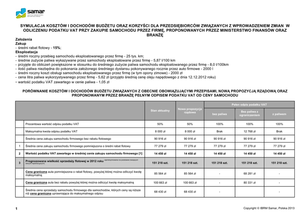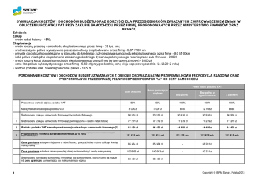 SYMULACJA KOSZTÓW I DOCHODÓW BUDŻETU ORAZ KORZYŚCI DLA PRZEDSIĘBIORCÓW ZWIĄZANYCH Z WPROWADZENIEM ZMIAN W ODLICZENIU PODATKU VAT PRZY ZAKUPIE SAMOCHODU PRZEZ FIRMĘ, PROPONOWANYCH PRZEZ MINISTERSTWO FINANSÓW ORAZ BRANŻĘ Założenia Zakup - średni rabat flotowy - 15%; Eksploatacja - średni roczny przebieg samochodu eksploatowanego przez firmę - 25 tys. km; - średnie zużycie paliwa wykazywane przez samochody eksploatowane przez firmę - 5,87 l/100 km - przyjęte do obliczeń powiększone w stosunku do średniego zużycie paliwa samochodu eksploatowanego przez firmę - 8,0 l/100km - ilość paliwa niezbędna do pokonania założonego średniego dystansu pokonywanego rocznie przez auto firmowe - 2000 l - średni roczny koszt obsługi samochodu eksploatowanego przez firmę (w tym opony zimowe) - 2000 zł - cena litra paliwa wykorzystywanego przez firmę - 5,62 zł (przyjęto średnią cenę oleju napędowego z dnia 12.12.2012 roku) - wartość podatku VAT zawartego w cenie paliwa - 1,05 zł PORÓWNANIE KOSZTÓW I DOCHODÓW BUDŻETU ZWIĄZANYCH Z OBECNIE OBOWIĄZUJĄCYMI PRZEPISAMI, NOWĄ PROPOZYCJĄ RZĄDOWĄ ORAZ PROPONOWANYM PRZEZ BRANŻĘ PEŁNYM ODPISEM PODATKU VAT OD CENY SAMOCHODU Pełen odpis podatku VAT Stan aktualny bez paliwa Bez paliwa z ograniczeniem z paliwem Procentowa wartość odpisu podatku VAT 50% 50% 100% 100% 100% Maksymalna kwota odpisu podatku VAT 8 000 zł 8 000 zł Brak 12 768 zł Brak Średnia cena zakupu samochodu firmowego bez rabatu flotowego 90 916 zł 90 916 zł 90 916 zł 90 916 zł 90 916 zł 1 Średnia cena zakupu samochodu firmowego pomniejszona o średni rabat flotowy 77 279 zł 77 279 zł 77 279 zł 77 279 zł 77 279 zł 2 Wartość podatku VAT zawartego w średniej cenie zakupu samochodu firmowego [1] 14 450 zł 14 450 zł 14 450 zł 14 450 zł 14 450 zł 151 218 szt. 151 218 szt. 151 218 szt. 151 218 szt. 151 218 szt. Cena graniczna auta pomniejszona o rabat flotowy, powyżej której można odliczyć kwotę maksymalną 85 564 zł 85 564 zł - 68 281 zł - Cena graniczna auta bez rabatu powyżej której można odliczyć kwotę maksymalną 100 663 zł 100 663 zł - 80 331 zł - Średnia cena sprzedaży samochodu firmowego dla samochodów, których ceny są niższe niż cena graniczna uprawniająca do maksymalnego odpisu 68 430 zł 68 430 zł - 3 1 Nowa propozycja rządowa Prognozowana wielkość sprzedaży flotowej w 2012 roku (aproksymowana na podstawie bieżących danych rejestracyjnych) - Copyright © IBRM Samar, Polska 2013 Pełen odpis podatku VAT Stan aktualny bez paliwa Bez paliwa z ograniczeniem z paliwem Średnia cena sprzedaży samochodu firmowego pomniejszona o rabat, dla samochodów, których ceny są niższe niż cena graniczna uprawniająca do maksymalnego odpisu 58 166 zł 58 166 zł - 60 389 zł - 4 Wartość podatku VAT dla samochodów, których ceny są niższe niż cena graniczna uprawniająca do maksymalnego odpisu 7 750 zł 10 877 zł - 11 292 zł - 5 Wartość podatku VAT do odpisu dla samochodów, których ceny są niższe niż cena graniczna uprawniająca do maksymalnego odpisu 4 650 zł 5 439 zł - 11 292 zł - 6 Liczba samochodów zakupionych przez firmy w 2012 roku, których ceny są niższe niż cena graniczna uprawniająca do maksymalnego odpisu 41 571 szt. 105 892 szt. - 86 248 szt. - Średnia cena sprzedaży samochodu firmowego dla samochodów, których ceny są wyższe niż cena graniczna uprawniająca do maksymalnego odpisu 106 344 zł 161 377 zł - Średnia cena sprzedaży samochodu firmowego pomniejszona o rabat, dla samochodów, których ceny są wyższe niż cena graniczna uprawniająca do maksymalnego odpisu 90 392 zł 137 170 zł - 131 081 zł - 7 Wartość podatku VAT dla samochodów, których ceny są wyższe niż cena graniczna uprawniająca do maksymalnego odpisu 16 903 zł 25 650 zł - 24 511 zł - 8 Wartość podatku VAT do odpisu dla samochodów, których ceny są wyższe niż cena graniczna uprawniająca do maksymalnego odpisu 6 000 zł 8 000 zł - 12 768 zł - 9 Liczba samochodów zakupionych przez firmy w okresie 1-12.2012, których ceny są wyższe niż cena graniczna uprawniająca do maksymalnego odpisu 109 647 szt. 45 326 szt. - 64 970 szt. - Ilość paliwa niezbędna do pokonania założonego rocznego przebiegu samochodu firmowego - 25 tys. km 2000 l 2000 l 2000 l 2000 l 2000 l Koszt zakupu paliwa niezbędnego do pokonania założonego rocznego przebiegu samochodu firmowego 11 240 zł 11 240 zł 11 240 zł 11 240 zł 11 240 zł Wartość podatku VAT zawartego w cenie zakupionego paliwa 2 102 zł 2 102 zł 2 102 zł 2 102 zł 2 102 zł Procentowa dopuszczalna wartość odpisu 0% 50% 0% 0% 100% Wartość podatku VAT do odpisu 0 zł 1 051 zł 0 zł 0 zł 2 102 zł 2 000 zł 2 000 zł 2 000 zł 2 000 zł 2 000 zł 10 11 Szacowany średni roczny koszt obsługi samochodów firmowych (w tym opony zimowe) 2 Nowa propozycja rządowa - Copyright © IBRM Samar, Polska 2013 Pełen odpis podatku VAT Stan aktualny 12 bez paliwa Bez paliwa z ograniczeniem z paliwem Wartość podatku VAT zawartego w cenie obsługi 374 zł 374 zł 374 zł 374 zł 374 zł Procentowa wartość odpisu [%] 100% 50% 100% 100% 100% 13 Wartość podatku VAT do odpisu 374 zł 187 zł 374 zł 374 zł 374 zł 14 Szacowana liczba samochodów wykorzystywanych przez firmy 1 000 000 szt. 1 000 000 szt. 1 000 000 szt. 1 000 000 szt. 1 000 000 szt. 15 Przychód budżetu przed odpisem dla samochodów kupionych przez firmy [2]x[3] + [10]x[3] + [12]x[3] + [14]x[10] + [14]x[12] 5 035 515 868 zł 5 035 515 868 zł 5 035 515 868 zł 5 035 515 868 zł 5 035 515 868 zł 16 Wartość odpisu (koszt budżetu) dla samochodów kupionych przez firmy [5]x[6] + [8]x[9] + [11]x[3] + [13]x[3] + [14]x[11] + [14]x[13] oraz w przypadku pełnego odpisu podatku VAT od samochodów [2]x[3] + [11]x[3] + [13]x[3] + [11]x[14] + [13]x[14] 1 281 742 682 zł 2 363 762 472 zł 2 612 480 054 zł 2 234 004 908 zł 5 032 340 290 zł 17 Wartość zmniejszenia podatku CIT (ko