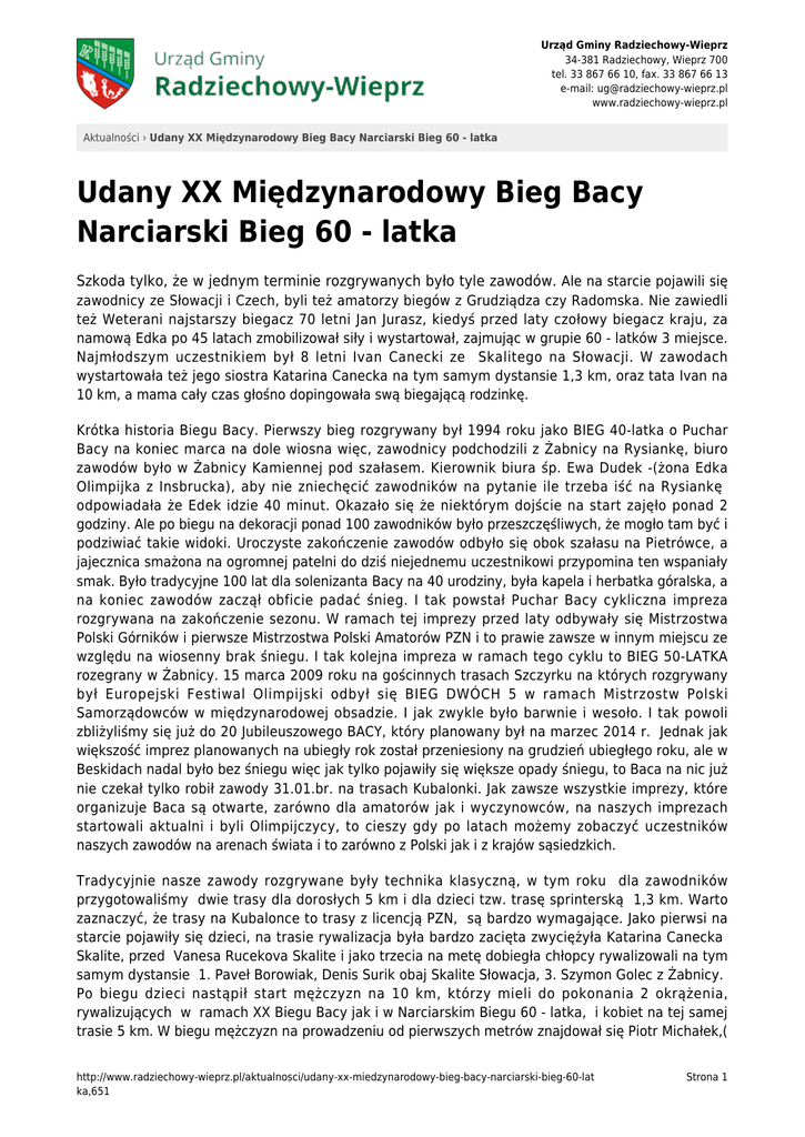 Urząd Gminy Radziechowy-Wieprz 34-381 Radziechowy, Wieprz 700 tel. 33 867 66 10, fax. 33 867 66 13 e-mail: [email protected] www.radziechowy-wieprz.pl Aktualności › Udany XX Międzynarodowy Bieg Bacy Narciarski Bieg 60 - latka Udany XX Międzynarodowy Bieg Bacy Narciarski Bieg 60 - latka Szkoda tylko, że w jednym terminie rozgrywanych było tyle zawodów. Ale na starcie pojawili się zawodnicy ze Słowacji i Czech, byli też amatorzy biegów z Grudziądza czy Radomska. Nie zawiedli też Weterani najstarszy biegacz 70 letni Jan Jurasz, kiedyś przed laty czołowy biegacz kraju, za namową Edka po 45 latach zmobilizował siły i wystartował, zajmując w grupie 60 - latków 3 miejsce. Najmłodszym uczestnikiem był 8 letni Ivan Canecki ze Skalitego na Słowacji. W zawodach wystartowała też jego siostra Katarina Canecka na tym samym dystansie 1,3 km, oraz tata Ivan na 10 km, a mama cały czas głośno dopingowała swą biegającą rodzinkę. Krótka historia Biegu Bacy. Pierwszy bieg rozgrywany był 1994 roku jako BIEG 40-latka o Puchar Bacy na koniec marca na dole wiosna więc, zawodnicy podchodzili z Żabnicy na Rysiankę, biuro zawodów było w Żabnicy Kamiennej pod szałasem. Kierownik biura śp. Ewa Dudek -(żona Edka Olimpijka z Insbrucka), aby nie zniechęcić zawodników na pytanie ile trzeba iść na Rysiankę odpowiadała że Edek idzie 40 minut. Okazało się że niektórym dojście na start zajęło ponad 2 godziny. Ale po biegu na dekoracji ponad 100 zawodników było przeszczęśliwych, że mogło tam być i podziwiać takie widoki. Uroczyste zakończenie zawodów odbyło się obok szałasu na Pietrówce, a jajecznica smażona na ogromnej patelni do dziś niejednemu uczestnikowi przypomina ten wspaniały smak. Było tradycyjne 100 lat dla solenizanta Bacy na 40 urodziny, była kapela i herbatka góralska, a na koniec zawodów zaczął obficie padać śnieg. I tak powstał Puchar Bacy cykliczna impreza rozgrywana na zakończenie sezonu. W ramach tej imprezy przed laty odbywały się Mistrzostwa Polski Górników i pierwsze Mistrzostwa Polski Amatorów PZN i to prawie zawsze w innym miejscu ze względu na wiosenny brak śniegu. I tak kolejna impreza w ramach tego cyklu to BIEG 50-LATKA rozegrany w Żabnicy. 15 marca 2009 roku na gościnnych trasach Szczyrku na których rozgrywany był Europejski Festiwal Olimpijski odbył się BIEG DWÓCH 5 w ramach Mistrzostw Polski Samorządowców w międzynarodowej obsadzie. I jak zwykle było barwnie i wesoło. I tak powoli zbliżyliśmy się już do 20 Jubileuszowego BACY, który planowany był na marzec 2014 r. Jednak jak większość imprez planowanych na ubiegły rok został przeniesiony na grudzień ubiegłego roku, ale w Beskidach nadal było bez śniegu więc jak tylko pojawiły się większe opady śniegu, to Baca na nic już nie czekał tylko robił zawody 31.01.br. na trasach Kubalonki. Jak zawsze wszystkie imprezy, które organizuje Baca są otwarte, zarówno dla amatorów jak i wyczynowców, na naszych imprezach startowali aktualni i byli Olimpijczycy, to cieszy gdy po latach możemy zobaczyć uczestników naszych zawodów na arenach świata i to zarówno z Polski jak i z krajów sąsiedzkich. Tradycyjnie nasze zawody rozgrywane były technika klasyczną, w tym roku dla zawodników przygotowaliśmy dwie trasy dla dorosłych 5 km i dla dzieci tzw. trasę sprinterską 1,3 km. Warto zaznaczyć, że trasy na Kubalonce to trasy z licencją PZN, są bardzo wymagające. Jako pierwsi na starcie pojawiły się dzieci, na trasie rywalizacja była bardzo zacięta zwyciężyła Katarina Canecka Skalite, przed Vanesa Rucekova Skalite i jako trzecia na metę dobiegła chłopcy rywalizowali na tym samym dystansie 1. Paveł Borowiak, Denis Surik obaj Skalite Słowacja, 3. Szymon Golec z Żabnicy. Po biegu dzieci nastąpił start mężczyzn na 10 km, którzy mieli do pokonania 2 okrążenia, rywalizujących w ramach XX Biegu Bacy jak i w Narciarskim Biegu 60 - latka, i kobiet na tej samej trasie 5 km. W biegu mężczyzn na prowadzeniu od pierwszych metrów znajdował się Piotr Michałek,( http://www.radziechowy-wieprz.pl/aktualnosci/udany-xx-miedzynarodowy-bieg-bacy-narciarski-bieg-60-lat ka,651 Strona 1 Urząd Gminy Radziechowy-Wieprz 34-381 Radziechowy, Wieprz 700 tel. 33 867 66 10, fax. 33 867 66 13 e-mail: [email protected] www.radziechowy-wieprz.pl Aktualności › Udany XX Międzynarodowy Bieg Bacy Narciarski Bieg 60 - latka przed laty reprezentant Polski, który już niejednokrotnie wygrywał te zawody) tuż za jego plecami trwała walka o podium pomiędzy Grzegorzem Legierskim, a Jackiem Mederskim, taka była kolejność po pierwszym okrążeniu . Wśród pań klasą dla siebie była Anna Słowik z Wisły ( jeszcze niedawno reprezentantka Polski w biegach narciarskich) druga finiszowała Maria Bujok Wisła i trzecia Aleksandra Marczak z Radomska. 10 kilometrów w ramach XX Biegu Bacy 1. Piotr Michałek, 2. Grzegorz Jegierski - obaj „Na Biegówkach Jaworzynka”, 3. Jacek Mederski - Grudziądz. Natomiast urodzinowy Bieg 60 - latka wygrał i z pięknym pucharem pojechał do Łodygowic Janusz Sobkowski, przed Andrzejem Figurą - Cięcina i Janem Juraszem z Ciśca. Dla każdego uczestnika przewidziano piękny okolicznościowy medal, były dyplomy, drobne upominki i tradycyjny poczęstunek, z kawą , herbatką, drożdżówką i grzańcem. Na zakończenie uczestnicy odśpiewali gromkie 100 lat dla Bacy na jego zaległe 60 urodziny. I z niedowierzaniem usłyszeli z ust Komandora że były to ostatnie organizowane przez niego zawody narciarskie. Organizatorem tegorocznej imprezy był RKB BACA Radziechowy, Śląsko- Beskidzki Związek Narciarski, Urząd Gminy Radziechowy-Wieprz, GCKPT Radziechowy-Wieprz, Starostwo Powiatowe Żywiec. Impreza pod Patronatem Polonia Sport z Wiednia. Komandor Edward Dudek http://www.radziechowy-wieprz.pl/aktualnosci/udany-xx-miedzynarodowy-bieg-bacy-narciarski-bieg-60-lat ka,651 Strona 2