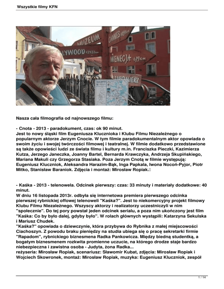 Wszystkie filmy KFN Nasza cała filmografia od najnowszego filmu: - Cnota - 2013 - paradokument, czas: ok 90 minut. Jest to nowy śląski film Eugeniusza Klucznioka i Klubu Filmu Niezależnego o popularnym aktorze Jerzym Cnocie. W tym filmie paradokumentalnym aktor opowiada o swoim życiu i swojej twórczości filmowej i teatralnej. W filmie dodatkowo przedstawione są także opowieści ludzi ze świata filmu i kultury m.in. Franciszka Pieczki, Kazimierza Kutza, Jerzego Janeczka, Joanny Bartel, Bernarda Krawczyka, Andrzeja Skupińskiego, Mariana Makuli czy Grzegorza Stasiaka. Poza Jerzym Cnotą w filmie występują: Eugeniusz Kluczniok, Aleksandra Harazim-Bąk, Inga Papkala, Iwona Nocoń-Pyjor, Piotr Mitko, Stanisław Baraniok. Zdjęcia i montaż: Mirosław Ropiak. - Kaśka - 2013 - telenowela. Odcinek pierwszy: czas: 33 minuty i materiały dodatkowe: 40 minut. W dniu 16 listopada 2013r. odbyła się internetowa premiera pierwszego odcinka pierwszej rybnickiej offowej telenoweli "Kaśka?". Jest to niekomercyjny projekt filmowy Klubu Filmu Niezależnego. Wszyscy aktorzy i realizatorzy uczestniczyli w nim "społecznie". Do tej pory powstał jeden odcinek serialu, a poza nim ukończony jest film "Kaśka: Co by było dalej, gdyby było". W rolach głównych wystąpili: Katarzyna Sekulska i Mariusz Chudek. "Kaśka?" opowiada o dziewczynie, która przybywa do Rybnika z małej miejscowości Ciachoszyn. Z powodu braku pieniędzy na studia ubiega się o pracę sekretarki firmie "Rapadom", rybnickiego biznesmena Radka Pankowicza. Między biedną studentką, a bogatym biznesmenem rozkwita promienne uczucie, na którego drodze staje bardzo niebezpieczna i zawistna osoba - Judyta, żona Radka... reżyseria: Mirosław Ropiak, scenariusz: Sławomir Kubat, zdjęcia: Mirosław Ropiak i Wojciech Skowronek, montaż: Mirosław Ropiak, muzyka: Eugeniusz Kluczniok, zespół 1 / 14 Wszystkie filmy KFN "Bebiki". >>zobacz pierwszy odcinek >>zobacz: "Kaśka?" Co by było dalej, gdyby było >>więcej o projekcie - Kabaret Derkacz: Ona tańczy dla mnie -2012. Teledysk. Parodia piosenki pt. "Ona tańczy dla mnie" zespołu Weekend. Realizacja dla Kabaretu "Derkacz". Pomysł: Arkadiusz Dera, realizacja: Mirosław Ropiak, czas: 3 min. >>zobacz - MB:2012: Całkowita zagłada - 2012. Komedia. reżyseria: Mirosław Ropiak, scenariusz: Szymon Stoczek, zdjęcia: Mirosław Ropiak, Wojciech Skowronek, montaż: Mirosław Ropiak, w rolach gł: Mariusz Groborz, teresa Seifert, Arkadiusz Dera, Szymon Stoczek, Jacek Klimek i inni. czas: 66 min. Luźna kontynuacja filmu "Dziewczyny lubią Blond". Tajny agent Mariusz Blond ma tylko 24 godziny by powstrzymać koniec świata. Blond musi dorwać demonicznego Klausa Ziemsena, który chce pomścić śmierć ojca. Naszemu bohaterowi pomaga zmysłowa agentka Francesca Poroniło. >>więcej >>oglądaj - Tu jest fajnie - 2012. Komedia. scenariusz i reżyseria: Eugeniusz Kluczniok, zdjęcia: Mirosław Ropiak, Wojciech Skowronek, montaż: Mirosław Ropiak. w rolach gł: Wiktoria Giemza, Marian Makula, Inga Papkala, Jerzy Cnota, Mariusz Groborz i inni. Czas: 72 min. Przygody ośmioletnie Viki, która po wielu latach przybywa na Śląsk w odwiedziny swojego wujka. Ósmy śląski film Eugeniusza Klucznioka i KFNu. >>więcej >>oglądaj - Śląskie Bajery: Kuplet o modzie - 2012. Teledysk. Realizacja: Mirosław Ropiak, czas: 4 min. >>zobacz - Jak chlebek wypiekamy i sami go zjadamy - 2011-2012,reportaż, realizacja: Mirosław Ropiak, Joanna Cichecka, czas: 9 min. > >zobacz - Tatapali: Apokalipsa - 2010-2012. Teledysk. Scenariusz: Szymon Stoczek. Realizacja: Mirosław Ropiak, czas. 4 min. >>zobacz - Powołanie - 2011 - Komedia. Siódmy śląski film KFNu w reżyserii Eugeniusza Klucznioka. Film o tematyce myśliwskiej i łowieckiej. Czas: 88 min. >> więcej >>oglądaj - Projekt Śruba - 2010-2012 - dziewięć filmów różnych autorów, których motywem przewodnim jest...śruba >> więcej >>film pt."Farmacji 2 / 14 Wszystkie filmy KFN blask" pt."Analiza" >>film - Fotograf i Telefony- 2010 - Nasze filmiki zrealizowane na konkurs "BGŻ-Konto z podwyżką." >>zobacz: Fotograf Telefony - IV Silesia Gospel Festival - 2010 - krótki film i prezentacja czwartej edycji festiwalu gospel. Realizacja: Mirosław Ropiak, czas: 6 minut. >>zobacz - Sprawa Adama F. - 2010 - Czteroczęściowy miniserial. Realizacja: Mirosław Ropiak, Słavek Kubat, Szymon Stoczek i inni. >>zobacz - South Silesian Brass Band PROMO - 2010 - Film promocyjny zespołu SSBB. Materiał został nakręcony podczas dwóch edycji Festiwalu Jazzu Tradycyjnego w latach 2009 i 2010. Realizacja: Mirosław Ropiak. >>zobacz - Koncert zespołu Roberta Czecha - 2010- Koncert odbył się w RCK w ramach Silesian Jazz Meeting. Realizacja: Mirosław Ropiak, Wojciech Skowronek, Aleksander Fojcik. czas: 90 minut - Koncert Jacka Glenca. Religioso E Poetico - 2010 - Koncert odbył się w ramach VI edycji Rybnickiej Jesieni Chóralnej. realizacja: Mirosław Ropiak, czas: 30 minut >>zobacz - Koncert Jubileuszowy zespołu Kurcbend - 2010- Realizacja: Mirosław Ropiak, Aleksander Fojcik, Wojciech Skowronek. czas. 120 minut. - Byzuch 2: Rewizyta - 2010 - komedia. Szósty film KFN o śląskiej tematyce. i druga część pupularnego "Byzucha" Ślązacy wyruszają do Niemiec z rewizytą ! Jorg i Andreas będą zmuszeni porządnie ugościć Gienka, Jurka, Marzenę (siostrę Gienka), Irka (szwagra Gienka) i barwnego ojca Maryjana... W Polsce pozostają sąsiedzi, Grejta i Jerzy, którzy pilnują domostwa i ... psów. Dawny kościelny zostaje nowym burmistrzem i ma problemy z podejmowaniem różnych decyzji, a jego mentor o. Maryjan jest przez tydzień w Niemczech. Może nowy kościelny pomoże burmistrzowi? Reżyseria, scenariusz, muzyka: Eugeniusz Kluczniok, Zdjęcia i montaż: Mirosław Ropiak, występują: Jerzy Cnota, Marzena Kipiel-Sztuka, Jerzy Janeczek i inni czas: 108 minut. >>strona filmu >>oglądaj -Rozjazdy 2010 - 2010 - Film reklamowy Festiwalu Podróżnikó