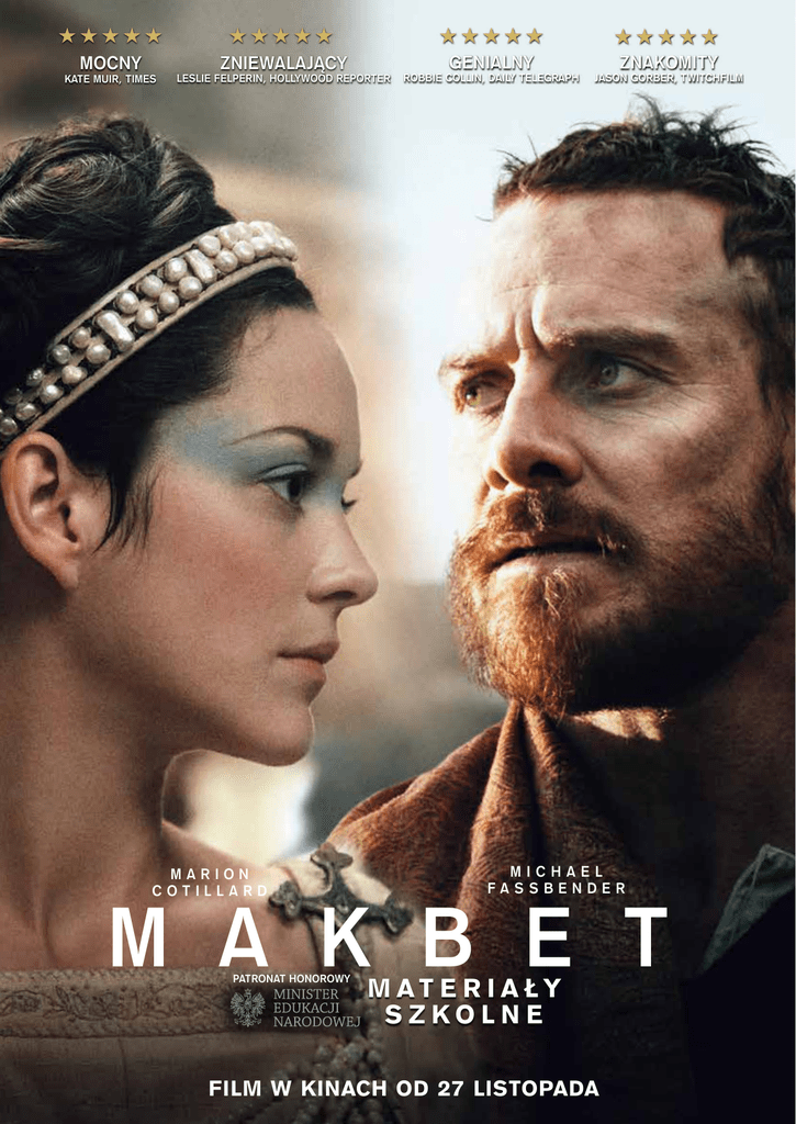 MOCNY KATE MUIR, TIMES ZNIEWALAJACY LESLIE FELPERIN, HOLLYWOOD REPORTER MARION COTILLARD GENIALNY ROBBIE COLLIN, DAILY TELEGRAPH ZNAKOMITY JASON GORBER, TWITCHFILM MICHAEL FASSBENDER M A K B E T PATRONAT HONOROWY MATERIAŁY SZKOLNE FILM W KINACH OD 27 LISTOPADA F ilm to środek dydaktyczny, którym można się posłużyć na wielu przedmiotach – uczy uważnego postrzegania świata, analizy, wyciągania wniosków, krytycznego myślenia, wrażliwości emocjonalnej, konstruowania swobodnych, ale spójnych wypowiedzi. Tylko od nauczyciela zależy, na ile wykorzysta potencjał tkwiący w tym medium. Na zajęcia z filmem trzeba mieć jednak pomysł. Niniejsza publikacja zawiera scenariusze zajęć dla szkół ponadgimnazjalnych i scenariusze zajęć dodatkowych dla gimnazjum zainspirowane filmem Makbet w reżyserii Justina Kurzela. Skierowane są do nauczycieli języka polskiego, języka angielskiego, historii, wiedzy o kulturze i etyki, a także do wychowawców, nauczycieli prowadzących zajęcia teatralne i szukających pomysłu na międzyprzedmiotowy projekt edukacyjny. Część scenariuszy można z powodzeniem zrealizować „z kredą w ręku”, inne wymagają zastosowania urządzeń multimedialnych, takich jak: tablica interaktywna, projektor, komputer, tablet czy smartfon. Zarówno scenariusze dotyczące przedmiotów obowiązkowych, jak i propozycje poświęcone uzupełniającym warsztatom teatralnym czy projektowi edukacyjnemu, uwzględniają w swoich treściach komentarz metodyczny z podstawy programowej kształcenia ogólnego, cele zajęć, formy pracy z uczniami i niezbędne środki dydaktyczne. Wszyscy autorzy zachęcają do nauczania nastawionego na angażowanie swoich podopiecznych w proces kształcenia, co zapewnia opanowanie wiadomości lub umiejętności określonych w wymaganiach ogólnych i szczegółowych podstawy programowej, rozbudza zainteresowanie tematem, pobudza aktywność intelektualną, kreatywność, wyobraźnię, motywuje uczniów do dalszej nauki i podejmowania działań twórczych, rozwija zmysł obserwacji oraz kompetencje związane z wyszukiwaniem, porządkowaniem i selekcjonowaniem informacji, a także dostarcza uczniom okazji do pracy zespołowej. Autorzy, odwołując się do nauczania wielozmysłowego i koncepcji inteligencji wielorakich, sięgają do różnego typu tekstów źródłowych i proponują uczniom rozmaite formy aktywności, m.in.: gry i zabawy edukacyjne, obserwacje i wnioskowanie, analizy porównawcze i SWOT, interpretacje na różnych płaszczyznach, szukanie analogii i informacji oraz scenki dramowe. W przypadku zajęć artystycznych i projektu na uwagę zasługuje położenie nacisku na zachęcanie ucznia do dzielenia się emocjami i dokonywania samooceny, co nauczy go świadomie kierować procesem samorozwoju. Scenariusze są inspirujące i przemyślane. Stanowią źródło cennych wskazówek oraz niebanalnych pomysłów. Skupiają się na potrzebach uczniów, nauczyciela obsadzają zaś w roli przewodnika, który wprowadza swoich podopiecznych w świat literatury, sztuki, historii lub etyki, pomaga im stać się świadomymi odbiorcami dóbr kultury. Dyrektor Mazowieckiego Samorządowego Centrum Doskonalenia Nauczycieli Tematy, koordynacja prac i konsultacja metodyczna – Anna Równy Opracowanie redakcyjne – Maria Białek Opracowanie graficzne i skład – Tomasz Treszczyński, Activa Studio Scenariusze są zgodne z podstawą programową (Rozporządzenie Ministra Edukacji Narodowej z dn. 27 sierpnia 2012 r.). Aktualność adresów do wymienionych w scenariuszach serwisów i stron internetowych została sprawdzona przed ich opublikowaniem. Wydawca nie ponosi odpowiedzialności za zawartość tych stron i stron, do których linki tam się znajdują. JĘZYK POLSKI Szkoła ponadgimnazjalna Czas trwania lekcji: 45 minut Temat: Dlaczego filmowcy lubią Szekspira? Makbet w reżyserii Justina Kurzela. Cele lekcji: 3) dostrzega w świecie konflikty wartości (np. równości Uczeń: i wolności, sprawiedliwości i miłosierdzia) oraz rozumie - poznaje zagadnienia z zakresu teorii filmu i teorii teatru; źródła tych konfliktów1. - odbiera komunikaty audiowizualne; - poddaje analizie i interpretacji teksty kultury; Przebieg lekcji: - ćwiczy umiejętność analizy kadru filmowego. FAZA WSTĘPNA Nauczyciel podaje uczniom temat lekcji, po czym za- Metody: pisuje na tablicy hasło: „dramat szekspirowski” i pro- - mapa myśli; si uczniów o stworzenie mapy myśli – dodanie odpo- - burza mózgów; wiednich cech. - praca indywidualna i w grupach. Przykładowe odpowiedzi Środki dydaktyczne: - karty pracy; - Internet; - rzutnik multimedialny lub tablica interaktywna. ELEMENTY FANTASTYCZNE, NIE TYLKO „PRAWDOPODOBNE” ODEJŚCIE OD ZASADY JEDNOŚCI MIEJSCA ODEJŚCIE OD ZASADY JEDNOŚCI CZASU Przygotowanie do lekcji: Lekcję należy przeprowadzić po obejrzeniu filmu Makbet w reżyserii Justina Kurzela. WPROWADZENIE SCEN ZBIOROWYCH DRAMAT SZEKSPIROWSKI ODEJŚCIE OD ZASADY JEDNOŚCI AKCJI Powiązanie z podstawą programową z języka polskiego: II. Analiza i interpretacja tekstów kultury. Uczeń zna teksty literackie i inne teksty kultury wskazane przez nauczyciela. 1. Wstępne rozpoznanie. Uczeń: 1) prezentuje własne przeżycia wynikające z kontaktu WPROWADZENIE BOHATERA DYNAMICZNEGO BRAK CHÓRU KOMENTUJĄCEGO WYDARZENIA z dziełem sztuki; ODEJŚCIE OD ZASADY DECORUM WŁASNE WYBORY JAKO OPOZYCJA WOBEC FATUM 2) określa problematykę utworu. 2. Analiza. Uczeń: Po utrwaleniu wiadomości dotyczących dramatu szek- 1) wskazuje zastosowane w utworze środki wyrazu arty- spirowskiego nauczyciel pyta uczniów, czy w świetle fil- stycznego i ich funkcje […]. mu Justina Kurzela i fotografii przedstawiających spek- 3. Interpretacja. Uczeń: takl Makbet w reżyserii Mariusza Grzegorzka z Teatru 1) wykorzystuje w interpretacji elementy znaczące dla Jaracza w Łodzi (patrz s. 4) sztuka filmowa ułatwia, czy odczytania sensu utworu […]; też utru
