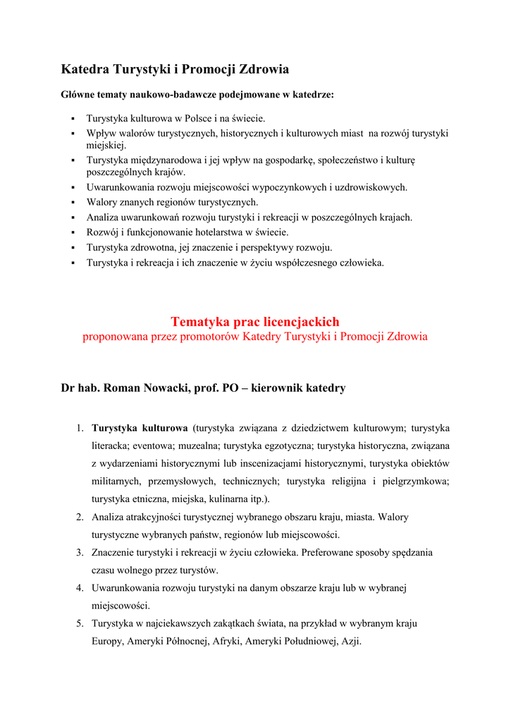 Katedra Turystyki i Promocji Zdrowia Główne tematy naukowo-badawcze podejmowane w katedrze: Turystyka kulturowa w Polsce i na świecie. Wpływ walorów turystycznych, historycznych i kulturowych miast na rozwój turystyki miejskiej. Turystyka międzynarodowa i jej wpływ na gospodarkę, społeczeństwo i kulturę poszczególnych krajów. Uwarunkowania rozwoju miejscowości wypoczynkowych i uzdrowiskowych. Walory znanych regionów turystycznych. Analiza uwarunkowań rozwoju turystyki i rekreacji w poszczególnych krajach. Rozwój i funkcjonowanie hotelarstwa w świecie. Turystyka zdrowotna, jej znaczenie i perspektywy rozwoju. Turystyka i rekreacja i ich znaczenie w życiu współczesnego człowieka. Tematyka prac licencjackich proponowana przez promotorów Katedry Turystyki i Promocji Zdrowia Dr hab. Roman Nowacki, prof. PO – kierownik katedry 1. Turystyka kulturowa (turystyka związana z dziedzictwem kulturowym; turystyka literacka; eventowa; muzealna; turystyka egzotyczna; turystyka historyczna, związana z wydarzeniami historycznymi lub inscenizacjami historycznymi, turystyka obiektów militarnych, przemysłowych, technicznych; turystyka religijna i pielgrzymkowa; turystyka etniczna, miejska, kulinarna itp.). 2. Analiza atrakcyjności turystycznej wybranego obszaru kraju, miasta. Walory turystyczne wybranych państw, regionów lub miejscowości. 3. Znaczenie turystyki i rekreacji w życiu człowieka. Preferowane sposoby spędzania czasu wolnego przez turystów. 4. Uwarunkowania rozwoju turystyki na danym obszarze kraju lub w wybranej miejscowości. 5. Turystyka w najciekawszych zakątkach świata, na przykład w wybranym kraju Europy, Ameryki Północnej, Afryki, Ameryki Południowej, Azji. 6. Turystyka zdrowotna (m.in. lecznictwo uzdrowiskowe, funkcjonowanie uzdrowisk, gabinetów odnowy biologicznej, atrakcje turystyczne i zagospodarowanie znanych miejscowości uzdrowiskowych) 7. Motywy i cele podróży w starożytności, średniowieczu, czasach nowożytnych; Sposoby podróżowania i rola transportu morskiego, lądowego i lotniczego w rozwoju turystyki w XIX i XX wieku. Dzieje turystyki w wybranym regionie, województwie, powiecie, gminie, miejscowości. 8. Zmiany w zagospodarowaniu turystycznym polskich miejscowości wypoczynkowych, na przykład wybranej miejscowości nadmorskiej, podgórskiej, górskiej. 9. Turystyka międzynarodowa (np. atrakcje turystyczne znanych miejscowości turystycznych, regionów, państw, międzynarodowy ruch turystyczny itp.). 10. Hotelarstwo w Polsce i na świecie (np. kierunki rozwoju hotelarstwa, jego rola w turystyce, organizacja i funkcjonowanie wybranych hoteli i innych zakładów hotelowych w wybranych miejscowościach itp.). Prof. dr Olga Żdanowa, prof. PO 1. Czas wolny różnych grup społecznych 2. Znaczenie turystyki i rekreacji w życiu człowieka 3. Walory turystyczne wybranych obszarów turystycznych 4. Organizacje turystyczne, krajoznawcze, rekreacyjne i sportowe – historia, działalność, znaczenie społeczne Dr Ksawery Jasiak 1. Historia uzdrowisk, dzieje i funkcjonowanie uzdrowisk na przełomie dziejów. 2. Historia turystyki, dzieje turystyki w wybranych miejscowościach 3. Historia alpinizmu i himalaizmu. Wybitni sportowcy i globtroterzy, zdobywcy korony ziemi. 4. Dziedzictwo kulturowe na przykładzie Śląska Opolskiego 5. Wpływ walorów historycznych na rozwój miast i wsi w Polsce 6. Miejsca pamięci narodowej i ich wpływ na rozwój turystyki w Unii Europejskiej Dr Grzegorz Rak 1. Polskie i zagraniczne sieci hotelarskie w Polsce – stan rozwoju, rozmieszczenie przestrzenne, segmentacja rynku. 2. Baza noclegowa województwa opolskiego (lub innego) – wielkość, struktura, rozmieszczenie przestrzenne, czynniki lokalizacji. 3. Zagrożone dziedzictwo kulturowe i przyrodnicze według UNESCO – rozmieszczenie przestrzenne, typologia i geneza zagrożeń, metody przeciwdziałania zagrożeniom. 4. Obiekty kulturowe Listy Światowego Dziedzictwa Kulturowego i Przyrodniczego Ludzkości UNESCO w Europie – rozmieszczenie przestrzenne i jego geneza, typologia obiektów, segmentacja rynku odbiorców, udostępnienie dla turystyki. 5. Obiekty przyrodnicze Listy Światowego Dziedzictwa Kulturowego i Przyrodniczego Ludzkości UNESCO w Europie – rozmieszczenie przestrzenne i jego geneza, typologia obiektów, segmentacja rynku odbiorców, udostępnienie dla turystyki, ochrona przyrody. 6. Motywy oraz cele podróży turystycznych w starożytności i średniowieczu 7. Rola transportu morskiego, kolejowego i lotniczego w rozwoju turystyki w XIX i XX wieku 8. Nadmorskie ośrodki wypoczynkowe turystyki masowej – lokalizacja, geneza, cechy charakterystyczne 9. Rozwój zrównoważony w turystyce – idea, cele, formy działań, przykłady 10. Turystyka masowa – cechy charakterystyczne, geneza, źródła zagrożeń, obszary występowania 11. Pojęcie atrakcyjności turystycznej, metody jej oceny, przykładowa analiza atrakcyjności turystycznej wybranego obszaru 12. Pojęcie funkcji turystycznej, metody określania jej wielkości, przykładowa analiza przestrzennego zróżnicowania funkcji turystycznej wybranego obszaru 13. Teoria cyklu życiowego obszaru turystycznego – istota i przykłady 14. Agroturystyka i turystyka na obszarach wiejskich – podobieństwa i różnice, przykłady 15. Pozytywny i negatywny wpływ turystyki na środowisko kulturowe – istota i przykłady 16. Pozytywny i negatywny wpływ turystyki na środowisko przyrodnicze – istota i przykłady 17. Czynniki przyrodnicze turystycznego, przykłady decydujące o przestrzennym rozmieszczeniu ruchu 18. Czynniki społeczno-ekonomiczne decydujące o przestrzennym rozmieszczeniu ruchu turystycznego 19. Wskaż podmioty znajdujące się na łańcuchu dystrybucji pakietu turystycznego – jakie są ich zadania oraz podobieństwa i różnice. 20. Turystyczna baza towarzysząca – definicja, funkcje i przykłady Dr Andrzej Romanowski Zagadnienia z zakresu: 1. Agroturystyki 2. 