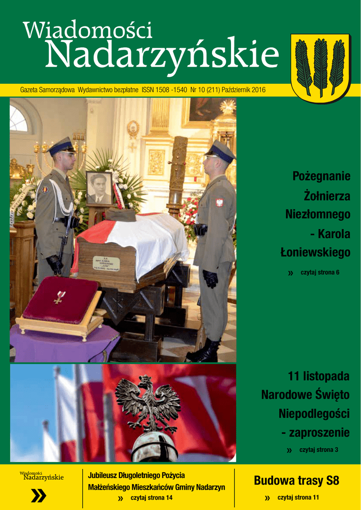 Gazeta Samorządowa Wydawnictwo bezpłatne ISSN 1508 -1540 Nr 10 (211) Październik 2016 Pożegnanie Żołnierza Niezłomnego - Karola Łoniewskiego czytaj strona 6 11 listopada Narodowe Święto Niepodlegości - zaproszenie czytaj strona 3 Jubileusz Długoletniego Pożycia Małżeńskiego Mieszkańców Gminy Nadarzyn czytaj strona 14 Budowa trasy S8 czytaj strona 11 Wiadomości Nadarzyńskie Zapra szamy Bawim na ba y się w 2 l sylw stylu wesel estrow nym y! 10 (211) październik 2016 Wiadomości Nadarzyńskie 11 listopada - Narodowe Święto Niepodległości Przewodnicząca Rady Gminy Nadarzyn i Wójt Gminy Nadarzyn zapraszają do uczestnictwa w obchodach upamiętniających 98. rocznicę odzyskania przez Polskę niepodległości. Uroczystości rozpoczną się w dniu 11 listopada o godz. 10.30 Mszą św. odprawioną w intencji Ojczyzny w kościele pw. św. Klemensa w Nadarzynie. Popiersie Marszałka Józefa Piłsudskiego wraz z pamiątkową tablicą znajdują się w nadarzyńskim rynku. Treść napisu na tablicy: „W X rocznicę odzyskania niepodległości Polski Pierwszemu Marszałkowi Józefowi Piłsudskiemu - Rodacy (11. XI.1928)”. W tym symbolicznym miejscu od wielu lat odbywają się najważniejsze uroczystości państwowe. Program obchodów: 10.30 - Msza św. w kościele pw. św. Klemensa w Nadarzynie; 11.30 - Program okolicznościowy przygotowany przez uczniów Gimnazjum im. św. Jana Pawła II w Nadarzynie; 12.00 - Przemarsz na rynek w Nadarzynie i złożenie wieńców w Miejscach Pamięci Narodowej. WAŻNE SPRAWY NA BIEŻĄCO... Szanowni Mieszkańcy Gminy Nadarzyn, oddajemy do Państwa rąk październikowy numer Wiadomości Nadarzyńskich. Zachęcam do przeczytania wspomnień o naszym lokalnym bohaterze Karolu Łoniewskim, w którego pogrzebie miałem zaszczyt uczestniczyć wraz z licznie przybyłymi mieszkańcami Gminy Nadarzyn. Zamordowany bestialsko za walkę o wolną Polskę, po wielu latach, spoczął w rodzinnym grobie przy swoich najbliższych. W tym numerze znajdą Państwo również artykuł dotyczący przebudowy „trasy katowickiej” i utrudnień w ruchu towarzyszących tej inwestycji. Przedstawiamy także relację z uroczystości Jubileuszowych Długoletniego Pożycia Par Małżeńskich z terenu naszej gminy. Zapraszam do zapoznania się z prowadzonymi przez gminę i planowanymi w najbliższym czasie zadaniami inwestycjnymi. Z pewnością interesujące i warte uwagi mieszkańców są, jak zawsze, bardzo różnorodne zaproszenia kulturalne oraz sportowe. Sporą dawkę emocji kibicom zagwarantują kolejne mecze naszych zawodniczek tenisa stołowego grających w ekstarklasie. Z racji zbliżającącego się Narodowego Święta Niepodległości - 11 listopada serdecznie zapraszam na uroczyste obchody i zachęcam do wywieszenia tego dnia flag państwowych. Z wyrazami szacunku, Janusz Grzyb - Wójt Gminy Nadarzyn 10 (211) październik 2016 3 Wiadomości Nadarzyńskie Inwestycje gminne Drogi i chodniki Roboty drogowe związane z budową nakładki bitumicznej ul. Słonecznej w Nadarzynie mają zakończyć się do 31 października 2016 r. Inwestycja ta jest realizowana w ramach Funduszu Sołeckiego. Zakończyły się prace związane z budową chodnika przy ul. Jodłowej w Strzeniówce. Obecnie trwają prace odbiorowe. Jeśli chodzi o budowę chodnika przy ul. Osiedlowej w Ruścu roboty zostały wstrzymane do czasu uzyskania zamiennego pozwolenia na budowę, (ul. Osiedlowej od posesji nr 52 do nr 68). Kompleks oświatowy w Ruścu Obecnie kontynuowane są prace związane z budową części gimnazjalnej oraz pełnowymiarowej hali widowiskowo - sportowej. Inwestycja realizowana jest planowo, dzięki płynności finansowej gminy, a przewidywany termin jej ukończenia to koniec sierpnia 2017 roku. Wykonywana jest elewacja na części dydaktycznej gimnazjum i hali sportowej. Trwają również prace związane z wykonaniem tynków wewnętrznych. Kontynuowane jest zagospodarowanie terenu przy nowopowstającej cześci kompleksu. Ponadto na ukończeniu jest montaż instalacji sanitarnych i elektrycznych. Zakończono także prace związane z pokryciem dachowym. Została podpisana umowa na przebudowę drogi gminnej w Krakowianach (droga na Nowiny). Roboty drogowe rozpoczną się na początku listopada br. Umowny termin realizacji do 5 grudnia br. Rozpoczął się remont łącznika między ul. Poświętną, a Pl. Poniatowskiego w Nadarzynie. Termin realizacji do 31 października 2016 r. Prace związane z profilowaniem dróg gminnych zostaną wznowione na początku listopada (o ile warunki pogodowe będą korzystne). Elewacja na części gimnazjalnej. Świetlica w Urzucie Zakończyły się prace budowlane związane z przebudową i rozbudową budynku świetlicy w Urzucie. Obecnie trwają prace odbiorowe. Świetlica w Parolach Trwają roboty wykończeniowe wewnętrzne oraz prace związane z zagospodarowaniem terenu zewnętrznego (w tym m.in. budowa dróg wewnętrznych i parkingów, montaż oświetlenia zewnętrznego). Wykonanie warstw konstrukcyjnych podbudowy boiska i placu zabaw. Termin realizacji zgodnie z umową do 10 sierpnia 2017 r. 4 Budowa kompleksu oświatowego w Ruścu - Projekt realizowany w ramach programu priorytetowego „Efektywne wykorzystanie energii” LEMUR – Energooszczędne Budynki Użyteczności Publicznej Narodowego Funduszu Ochrony Środowiska i Gospodarki Wodnej w Warszawie 10 (211) październik 2016 Wiadomości Nadarzyńskie Oczyszczalnia ścieków w Kostowcu Zakończono rozbudowę oczyszczalni ścieków wraz z budową kanalizacji sanitarnej w granicy pasa drogowego drogi krajowej nr 8 (przejście poprzeczne) w Kostowcu. Koszt tego przedsięwzięcia 2.373.900,00 zł. Dofinansowanie z Wojewódzkiego Funduszu Ochrony Środowiska i Gospodarki Wodnej w Warszawie, w formie pożyczki, w kwocie 2.147.600,00 zł. Nowa oczyszczalnia ścieków w Kostowcu. Oświetlenie Obecnie trwają prace związane z realizacją zaprojektowania i budowy oświetlenia ulicznego w Nadarzyni