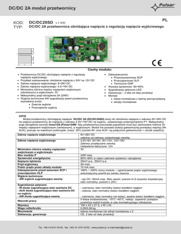 Pulsar DC/DC 2A moduł przetwornicy DC/DC20SD KOD: TYP: PL v.1.0/III W H DC/DC 2A przetwornica obniżająca napięcie z regulacją napięcia wyjściowego L Cechy modułu: · Przetwornica DC/DC obniżająca napięcie z regulacją napięcia wyjściowego · Przykład zastosowania: obniżenie napięcia z 24V na 12V DC · Zakres napięcia wejściowego: 8÷28V DC · Zakres napięcia wyjściowego: 4,5÷19V DC · Minimalna różnica między napięciem wejściowym (obniżanym) a wyjściowym: 3V · Maksymalny prąd obciążenia 2A (24W) · Wyjście techniczne AW sygnalizacji awarii przetwornicy wyzwalane przez: · Zwarcie wyjścia · Przeciążenie wyjścia · Zabezpieczenia: · Przeciwzwarciowe SCP · Przeciążeniowe OLP · Termiczne OHP · Wysoka sprawność: 80÷90% · Sygnalizacja optyczna LED · Gwarancja – 2 lata od daty produkcji · Montaż: · listwa montażowa z taśmą samoprzylepną · wkręty montażowe OPIS Moduł przetwornicy obniżającej napięcie DC/DC 2A (DC/DC20SD) służy do obniżenia napięcia z zakresu 8V÷28V DC na wejściu przetwornicy do napięcia z zakresu 4,5V÷19V DC na wyjściu, ustawionego potencjometrem P1. Maksymalny prąd obciążenia wynosi) Imax=2A (Pmax=24W. Aby przetwornica pracowała poprawnie musi być zachowana różnica 3V między napięciem wejściowym (obniżanym), a wyjściowym. Moduł nie posiada izolacji galwanicznej pomiędzy wej/wyj (INAUX), pracuje na wspólnym potencjale „masy” (0V) (zaciski IN- oraz AUX- są połączone galwanicznie = zacisk wspólny). Zakres napięcia wejściowego Zakres napięcia wyjściowego Minimalna różnica między napięciem wejściowym a wyjściowym Moc modułu P Sprawność energetyczna Napięcie tętnienia Prąd wyjściowy Pobór prądu przez układy modułu Zabezpieczenie przed zwarciem SCP i przeciążeniem OLP Wyjścia techniczne - AW wyjście sygnalizujące awarię: Sygnalizacja optyczna - IN dioda sygnalizująca stan zasilania DC - AUX dioda sygnalizująca stan zasilania DC na wyjściu - AW dioda sygnalizująca awarię Warunki pracy Wymiary Waga netto/brutto Mocowanie Deklaracje, gwarancja 8V÷28V DC zależne od zakresu ustawionego zworką 4,5V÷6V, 6V÷9V, 9V÷13V, 13V÷19V Zakresy przełączane zworką Ustawienie fabryczne: 12V 3V 24W max. 80%÷90% w całym zakresie zasilania i obciążenia 20mV p-p...50mV p-p 2A max. 10 mA max. 180% ÷ 200% mocy modułu – ograniczenie prądu wyjściowego, automatyczny powrót po zaniku zwarcia - typ OC, 50mA max. Stan awarii: poziom hi-Z (wysoka impedancja), stan normalny: poziom L (0V) - czerwona, stan normalny świeci światłem ciągłym - zielona, stan normalny świeci światłem ciągłym - czerwona, stan normalny nie świeci, awaria świeci światłem ciągłym II klasa środowiskowa, -10°C ÷40°C, należy zapewnić przepływ powietrza wokół modułu w celu konwekcyjnego chłodzenia 100 x 43 x 27 (L x W x H) 0,05/0,08 kg taśma montażowa lub wkręt montażowy x 2 CE, 2 lata od daty produkcji Tel. +48-14-610-19-40, fax: +48-14- 610-19-50, www.pulsar.pl, e-mail:[email protected] ®
