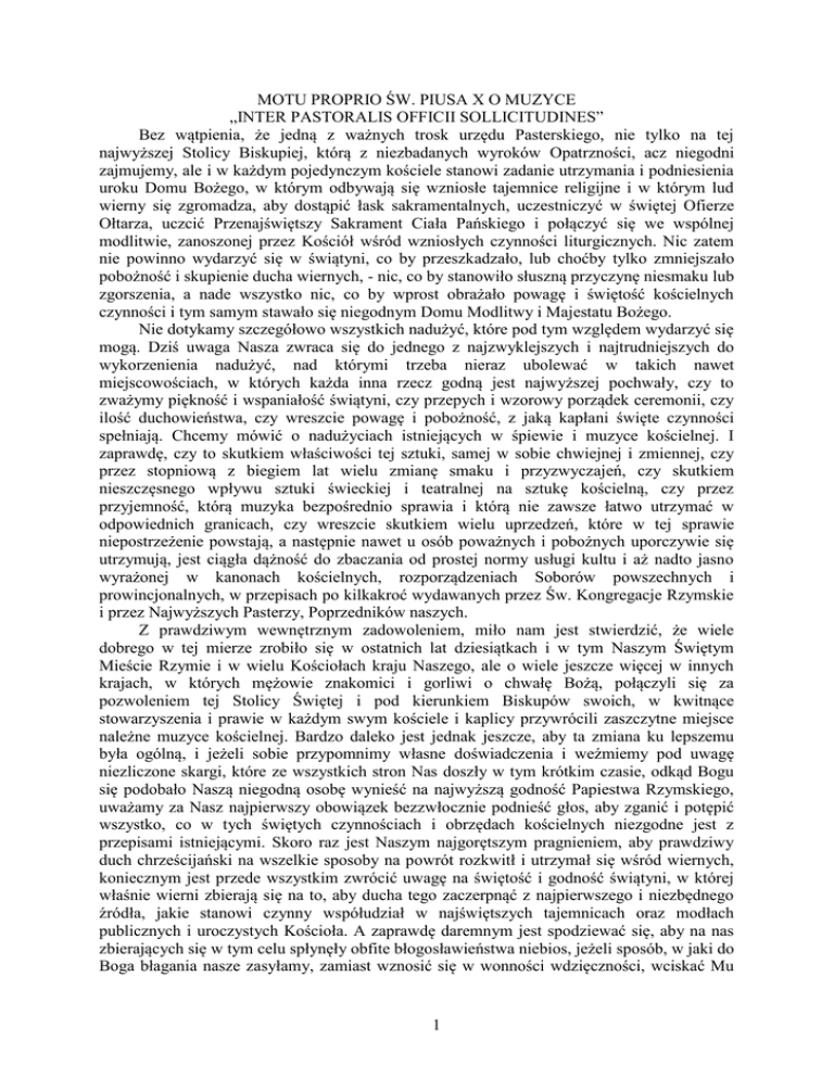 MOTU PROPRIO ŚW. PIUSA X O MUZYCE „INTER PASTORALIS OFFICII SOLLICITUDINES” Bez wątpienia, że jedną z ważnych trosk urzędu Pasterskiego, nie tylko na tej najwyższej Stolicy Biskupiej, którą z niezbadanych wyroków Opatrzności, acz niegodni zajmujemy, ale i w każdym pojedynczym kościele stanowi zadanie utrzymania i podniesienia uroku Domu Bożego, w którym odbywają się wzniosłe tajemnice religijne i w którym lud wierny się zgromadza, aby dostąpić łask sakramentalnych, uczestniczyć w świętej Ofierze Ołtarza, uczcić Przenajświętszy Sakrament Ciała Pańskiego i połączyć się we wspólnej modlitwie, zanoszonej przez Kościół wśród wzniosłych czynności liturgicznych. Nic zatem nie powinno wydarzyć się w świątyni, co by przeszkadzało, lub choćby tylko zmniejszało pobożność i skupienie ducha wiernych, - nic, co by stanowiło słuszną przyczynę niesmaku lub zgorszenia, a nade wszystko nic, co by wprost obrażało powagę i świętość kościelnych czynności i tym samym stawało się niegodnym Domu Modlitwy i Majestatu Bożego. Nie dotykamy szczegółowo wszystkich nadużyć, które pod tym względem wydarzyć się mogą. Dziś uwaga Nasza zwraca się do jednego z najzwyklejszych i najtrudniejszych do wykorzenienia nadużyć, nad którymi trzeba nieraz ubolewać w takich nawet miejscowościach, w których każda inna rzecz godną jest najwyższej pochwały, czy to zważymy piękność i wspaniałość świątyni, czy przepych i wzorowy porządek ceremonii, czy ilość duchowieństwa, czy wreszcie powagę i pobożność, z jaką kapłani święte czynności spełniają. Chcemy mówić o nadużyciach istniejących w śpiewie i muzyce kościelnej. I zaprawdę, czy to skutkiem właściwości tej sztuki, samej w sobie chwiejnej i zmiennej, czy przez stopniową z biegiem lat wielu zmianę smaku i przyzwyczajeń, czy skutkiem nieszczęsnego wpływu sztuki świeckiej i teatralnej na sztukę kościelną, czy przez przyjemność, którą muzyka bezpośrednio sprawia i którą nie zawsze łatwo utrzymać w odpowiednich granicach, czy wreszcie skutkiem wielu uprzedzeń, które w tej sprawie niepostrzeżenie powstają, a następnie nawet u osób poważnych i pobożnych uporczywie się utrzymują, jest ciągła dążność do zbaczania od prostej normy usługi kultu i aż nadto jasno wyrażonej w kanonach kościelnych, rozporządzeniach Soborów powszechnych i prowincjonalnych, w przepisach po kilkakroć wydawanych przez Św. Kongregacje Rzymskie i przez Najwyższych Pasterzy, Poprzedników naszych. Z prawdziwym wewnętrznym zadowoleniem, miło nam jest stwierdzić, że wiele dobrego w tej mierze zrobiło się w ostatnich lat dziesiątkach i w tym Naszym Świętym Mieście Rzymie i w wielu Kościołach kraju Naszego, ale o wiele jeszcze więcej w innych krajach, w których mężowie znakomici i gorliwi o chwałę Bożą, połączyli się za pozwoleniem tej Stolicy Świętej i pod kierunkiem Biskupów swoich, w kwitnące stowarzyszenia i prawie w każdym swym kościele i kaplicy przywrócili zaszczytne miejsce należne muzyce kościelnej. Bardzo daleko jest jednak jeszcze, aby ta zmiana ku lepszemu była ogólną, i jeżeli sobie przypomnimy własne doświadczenia i weźmiemy pod uwagę niezliczone skargi, które ze wszystkich stron Nas doszły w tym krótkim czasie, odkąd Bogu się podobało Naszą niegodną osobę wynieść na najwyższą godność Papiestwa Rzymskiego, uważamy za Nasz najpierwszy obowiązek bezzwłocznie podnieść głos, aby zganić i potępić wszystko, co w tych świętych czynnościach i obrzędach kościelnych niezgodne jest z przepisami istniejącymi. Skoro raz jest Naszym najgorętszym pragnieniem, aby prawdziwy duch chrześcijański na wszelkie sposoby na powrót rozkwitł i utrzymał się wśród wiernych, koniecznym jest przede wszystkim zwrócić uwagę na świętość i godność świątyni, w której właśnie wierni zbierają się na to, aby ducha tego zaczerpnąć z najpierwszego i niezbędnego źródła, jakie stanowi czynny współudział w najświętszych tajemnicach oraz modłach publicznych i uroczystych Kościoła. A zaprawdę daremnym jest spodziewać się, aby na nas zbierających się w tym celu spłynęły obfite błogosławieństwa niebios, jeżeli sposób, w jaki do Boga błagania nasze zasyłamy, zamiast wznosić się w wonności wdzięczności, wciskać Mu 1 będzie do ręki powrozy, którymi ongi Boski Zbawiciel wyganiał ze świątyni niegodnych, co ją bezcześcili. Dlatego też, aby nikt od tej chwili nie mógł się tłumaczyć, że nie zna dokładnie swego obowiązku i aby znikła wszelka niepewność w tłumaczeniu niektórych już wydanych przepisów, uznaliśmy za potrzebne wskazać w krótkości te zasady, które kierować winny Muzyką Kościelną w świętych obrzędach, oraz zebrać w jedną całość ogólną główne przepisy Kościoła, wydane przeciw najpospolitszym nadużyciom w tej sprawie. I dlatego z własnej woli i z pełnym zrozumieniem rzeczy ogłaszamy tę naszą Instrukcję, której jako Ustawie prawomocnej dla muzyki kościelnej, chcemy z pełności Władzy Naszej Apostolskiej nadać moc prawną i zarazem tym Naszym odręcznym pismem wszystkich zobowiązać do najściślejszego jej przestrzegania. I. ZASADY OGÓLNE 1. Muzyka kościelna, jako część składowa uroczystej liturgii, dzieli z nią cel ogólny, jakim jest chwała Boża, uświęcenie i zbudowanie wiernych. Ona to się przyczynia do pomnożenia powagi i wspaniałości ceremonii kościelnych i tak, jak głównym jej zadaniem jest odpowiednią melodią przyodziać tekst liturgiczny, przedstawiony zrozumieniu wiernych, tak znowu właściwym jej celem jest dodać większej siły tekstowi samemu, aby za jej pośrednictwem wierni byli łatwiej jeszcze pobudzeni do pobożności i lepiej usposobieni do zebrania w sobie owoców łaski, powstających przy sprawowaniu Przenajświętszych Tajemnic. 2. Dlatego to muzyka kościelna p