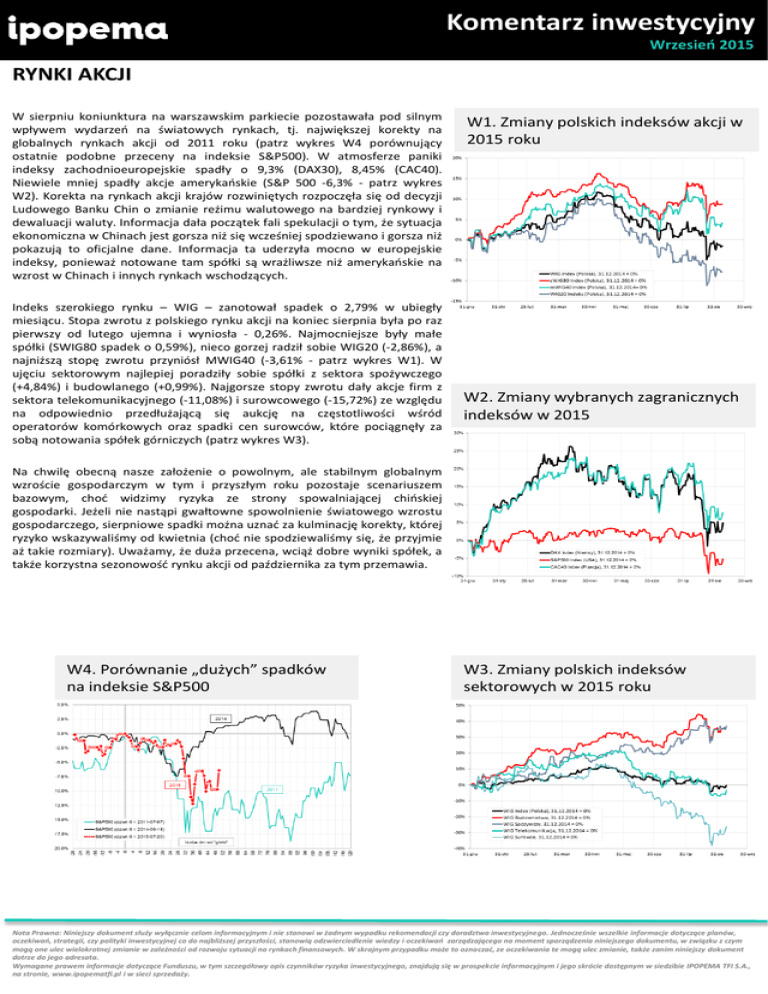 Komentarz inwestycyjny Wrzesień 2015 RYNKI AKCJI W sierpniu koniunktura na warszawskim parkiecie pozostawała pod silnym wpływem wydarzeń na światowych rynkach, tj. największej korekty na globalnych rynkach akcji od 2011 roku (patrz wykres W4 porównujący ostatnie podobne przeceny na indeksie S&P500). W atmosferze paniki indeksy zachodnioeuropejskie spadły o 9,3% (DAX30), 8,45% (CAC40). Niewiele mniej spadły akcje amerykańskie (S&P 500 -6,3% - patrz wykres W2). Korekta na rynkach akcji krajów rozwiniętych rozpoczęła się od decyzji Ludowego Banku Chin o zmianie reżimu walutowego na bardziej rynkowy i dewaluacji waluty. Informacja dała początek fali spekulacji o tym, że sytuacja ekonomiczna w Chinach jest gorsza niż się wcześniej spodziewano i gorsza niż pokazują to oficjalne dane. Informacja ta uderzyła mocno w europejskie indeksy, ponieważ notowane tam spółki są wrażliwsze niż amerykańskie na wzrost w Chinach i innych rynkach wschodzących. Indeks szerokiego rynku – WIG – zanotował spadek o 2,79% w ubiegły miesiącu. Stopa zwrotu z polskiego rynku akcji na koniec sierpnia była po raz pierwszy od lutego ujemna i wyniosła - 0,26%. Najmocniejsze były małe spółki (SWIG80 spadek o 0,59%), nieco gorzej radził sobie WIG20 (-2,86%), a najniższą stopę zwrotu przyniósł MWIG40 (-3,61% - patrz wykres W1). W ujęciu sektorowym najlepiej poradziły sobie spółki z sektora spożywczego (+4,84%) i budowlanego (+0,99%). Najgorsze stopy zwrotu dały akcje firm z sektora telekomunikacyjnego (-11,08%) i surowcowego (-15,72%) ze względu na odpowiednio przedłużającą się aukcję na częstotliwości wśród operatorów komórkowych oraz spadki cen surowców, które pociągnęły za sobą notowania spółek górniczych (patrz wykres W3). W1. Zmiany polskich indeksów akcji w 2015 roku W2. Zmiany wybranych zagranicznych indeksów w 2015 Na chwilę obecną nasze założenie o powolnym, ale stabilnym globalnym wzroście gospodarczym w tym i przyszłym roku pozostaje scenariuszem bazowym, choć widzimy ryzyka ze strony spowalniającej chińskiej gospodarki. Jeżeli nie nastąpi gwałtowne spowolnienie światowego wzrostu gospodarczego, sierpniowe spadki można uznać za kulminację korekty, której ryzyko wskazywaliśmy od kwietnia (choć nie spodziewaliśmy się, że przyjmie aż takie rozmiary). Uważamy, że duża przecena, wciąż dobre wyniki spółek, a także korzystna sezonowość rynku akcji od października za tym przemawia. W4. Porównanie „dużych” spadków na indeksie S&P500 W3. Zmiany polskich indeksów sektorowych w 2015 roku Nota Prawna: Niniejszy dokument służy wyłącznie celom informacyjnym i nie stanowi w żadnym wypadku rekomendacji czy doradztwa inwestycyjnego. Jednocześnie wszelkie informacje dotyczące planów, oczekiwań, strategii, czy polityki inwestycyjnej co do najbliższej przyszłości, stanowią odzwierciedlenie wiedzy i oczekiwań zarządzającego na moment sporządzenia niniejszego dokumentu, w związku z czym mogą one ulec wielokrotnej zmianie w zależności od rozwoju sytuacji na rynkach finansowych. W skrajnym przypadku może to oznaczać, ze oczekiwania te mogą ulec zmianie, także zanim niniejszy dokument dotrze do jego adresata. Wymagane prawem informacje dotyczące Funduszu, w tym szczegółowy opis czynników ryzyka inwestycyjnego, znajdują się w prospekcie informacyjnym i jego skrócie dostępnym w siedzibie IPOPEMA TFI S.A., na stronie, www.ipopematfi.pl i w sieci sprzedaży. Komentarz inwestycyjny Wrzesień 2015 RYNEK DŁUGU W skali całego miesiąca rentowności krajowych obligacji skarbowych pozostały stabilne (patrz wykres W5), jednakże mieliśmy do czynienia z wysoką zmiennością na rynku długu. Początek miesiąca przyniósł umocnienie obligacji w ślad za rynkami bazowymi, a druga połowa miesiąca była całkowitym przeciwieństwem tej tendencji. Powodem przeceny było ogłoszenie decyzji Ludowego Banku Chin o zmianie reżimu walutowego na bardziej rynkowy i dewaluacji waluty (patrz wykres W6). Informacja dała początek fali spekulacji o tym, że sytuacja ekonomiczna w Chinach jest gorsza niż się wcześniej spodziewano i gorsza niż pokazują to oficjalne dane. Informacja ta uderzyła mocno w rynki krajów wschodzących, w tym nasz krajowy rynek obligacji. W najbliższych tygodniach oczekujemy, że rentowności krajowych obligacji z krótkiego końca krzywej będą determinowane doniesieniami z kraju oraz ze strefy euro. W tym segmencie krzywej, spodziewamy się niskiej zmienności głównie za sprawą zakotwiczenia oczekiwań inflacyjnych na niskim poziomie. Niskie oczekiwania inflacyjne są dodatkowo wspierane przez spadki cen surowców na rynkach światowych (głównie ropy naftowej - patrz wykres W7). W5. Rentowność polskich obligacji 2, 5 i 10-letnich w 2015 roku W6. Dewaluacja chińskiej waluty w sierpniu 2015 roku Rentowności obligacji ze środka i długiego końca krzywej dochodowości będą w głównej mierze determinowane poprzez napływające dane z gospodarki amerykańskiej (patrz wykres W8 pokazujący różne średnie z wskaźników wyprzedających dla gospodarki amerykańskiej). W pozostałej części roku spodziewamy się dalszego wzrostu cen obligacji skarbowych głównie w związku z mniejszymi - niż oczekują analitycy i inwestorzy - podwyżkami stóp procentowych w USA, intensyfikacją zakupów obligacji przez Europejski Bank Centralny oraz utrzymaniem środowiska deflacyjnego (spadające ceny surowców i dewaluacja chińskiej waluty). W8. Różne średnie z wskaźników wyprzedzających dla USA W7. Notowania ropy naftowej (brent i crude) Departament Zarządzania Aktywami IPOPEMA Towarzystwo Funduszy Inwestycyjnych S.A. Powyższy komentarz powstał jako kompilacja komentarzy miesięcznych sporządzanych dla poszczególnych funduszy IPOPEMA TFI./ IPOPEMA AM Nota Prawna: Niniejszy dokument służy wyłącznie celom informacyjnym i nie stanowi w żadnym wypadku rekomend