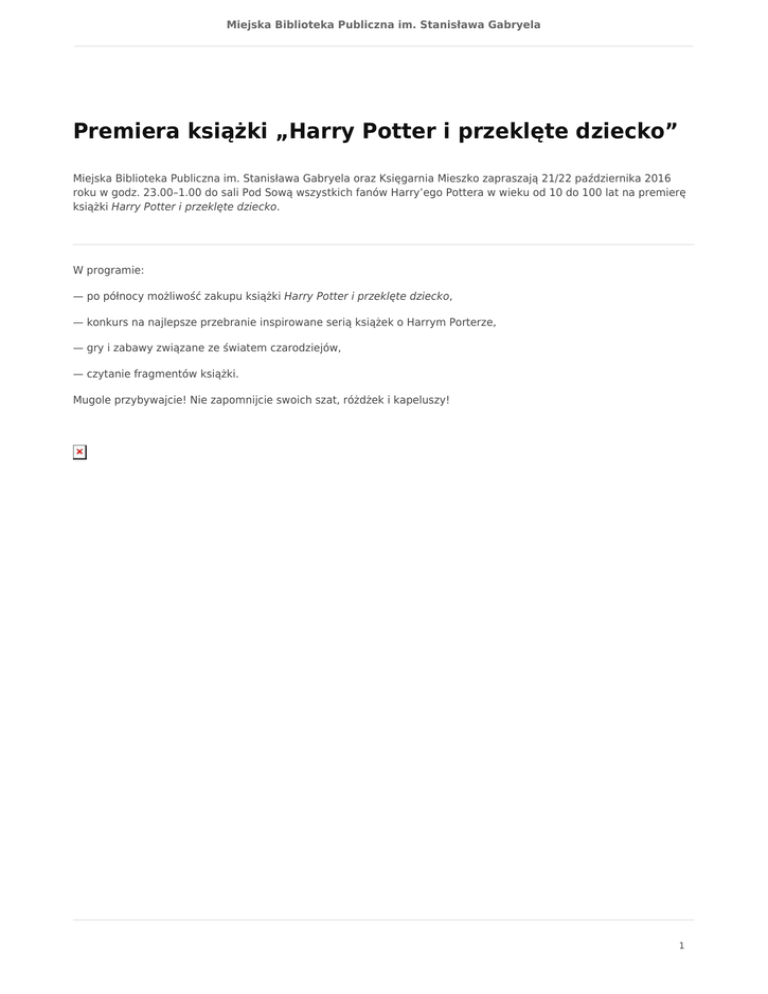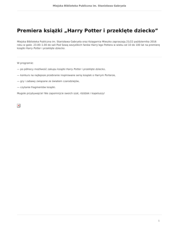Miejska Biblioteka Publiczna im. Stanisława Gabryela Premiera książki „Harry Potter i przeklęte dziecko” Miejska Biblioteka Publiczna im. Stanisława Gabryela oraz Księgarnia Mieszko zapraszają 21/22 października 2016 roku w godz. 23.00–1.00 do sali Pod Sową wszystkich fanów Harry’ego Pottera w wieku od 10 do 100 lat na premierę książki Harry Potter i przeklęte dziecko. W programie: — po północy możliwość zakupu książki Harry Potter i przeklęte dziecko, — konkurs na najlepsze przebranie inspirowane serią książek o Harrym Porterze, — gry i zabawy związane ze światem czarodziejów, — czytanie fragmentów książki. Mugole przybywajcie! Nie zapomnijcie swoich szat, różdżek i kapeluszy! 1
