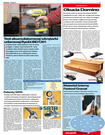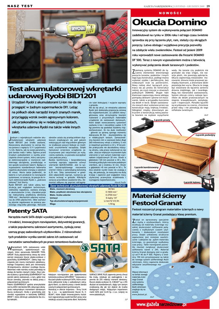 nasz test GAZETA NARZĘDZIOWA | LISTOPAD - GRUDZIEŃ 2009 29 NOWOŚCI Okucia Domino Innowacyjny system do wykonywania połączeń DOMINO zadebiutował na rynku w 2006 roku i od tego czasu świetnie sprawdza się przy łączeniu płyt, ram, stelaży czy okrągłych poręczy. Łatwa obsługa i wyjątkowa precyzja pozwoliły na zdobycie wielu zwolenników. Festool od jesieni 2009 roku wprowadził nowe zastosowanie dla frezarki DOMINO DF 500. Teraz z nowym wyposażeniem można z łatwością wykonywać połączenia desek tarasowych i podestów. Z Test akumulatorowej wkrętarki udarowej Ryobi BID1201 Urządzeń Ryobi z akumulatorami Li-Ion nie da się przegapić w żadnym supermarkecie DIY. Leżąc na półkach obok narzędzi innych znanych marek, przyciągają wzrok swoim agresywnym kolorem. Jak przekonaliśmy się w redakcyjnych testach, wkrętarka udarowa Ryobi ma także wiele innych zalet. J ednym z największych walorów akumulatorowej wkrętarki udarowej Ryobi BID1201 jest źródło zasilania. Nowoczesny akumulator to wersja litowo-jonowa o napięciu 12 V i pojemności 1,2 Ah. Bateria, jak na swoje parametry, jest bardzo mała i lekka. Ogniwa przed trwałym uszkodzeniem w wyniku przeciążenia chroni system, który zatrzymuje elektronarzędzie w momencie nadmiernego obciążenia, przedłużając w ten sposób żywotność baterii. Będąca w wyposażeniu standardowym ładowarka napełnia akumulator energią w zaledwie 45 minut. Warto także podkreślić, że bateria w tym produkcie to rozwiązanie systemowe, co oznacza, że pasuje do innych elektronarzędzi Ryobi z „jaskrawo zielonej” linii Shorty. Ryobi BID1201 jest także udaną konstrukcją pod względem technicznym. Jednostka napędowa, zasilana energią w akumulatorów Li-Ion, charakteryzuje się maksymalną prędkością obrotową 1900 min-1. Mechanizm udarowy wytwarza do 2700 udarów/min. Obie wartości są płynnie regulowane za pomocą spustowego włącznika głównego. Kierunek obrotów ustala się przełącznikiem słupkowym znajdującym się pod palcem wskazującym nad włącznikiem głównym (w środkowej pozycji blokuje on możliwość uruchomienia narzędzia). Dzięki hamulcowi wrzeciono urządzenia zatrzymywane jest natychmiast po wyłączeniu zasilania, co pozwala oszczędzać czas podczas pracy. Bardzo komfortową i bezproblemową wymianę osprzętu zapewnia uchwyt wiertarski QUICKCHANGE. Jest to system beznarzędziowego mocowania wierteł i bitów z sześciokątną końcówką 6,35 mm. Żeby zamontować w gnieździe odpowiedni osprzęt, wystarczy go mocno wcisnąć w gniazdo. Kliknięcie oznacza prawidłowe osadzenie bitu. Demontaż odbywa się poprzez odciągnię- cie tulei blokującej i wyjęcie osprzętu z gniazda. Nie da się ukryć, że wkrętarka udarowa Ryobi jest doskonałą propozycją cenową dla majsterkowiczów. Za całkiem niewygórowaną cenę otrzymujemy bowiem wykonane z przyzwoitych materiałów urządzenie do zastosowań domowych, które dzięki nowoczesnemu systemowi zasilania Li-Ion i niewielkiej wadze (1,19 kg) powinno się spodobać każdemu majsterkowiczowi. Że ma duże możliwości – głównie za sprawą sporego momentu dokręcania 85 Nm – dowiedzieliśmy się w redakcyjnych testach. Zamocowaliśmy bowiem nim w sosnowej belce długi 260-milimetrowy wkręt o średnicy 5 mm (z niepełnym gwintem) w 22 s. W tej próbie praktycznie nie dociskaliśmy maszyną wkrętu, całą pracę wykonywał za nas udar. Jeszcze większym wyzwaniem było wiercenie w tym samym materiale wycinakiem trójostrzowym 20 mm. Otwór o głębokości 120 mm powstał w 40 s. Ekstremalną próbą było wiercenie podobnym wiertłem, ale o średnicy 32 mm. Otwór o głębokości 45 mm powstał w 50 s. Te dwa ostatnie wyniki może nie zwalają z nóg, ale pokazują, że maszynka ma dużą krzepę i zapewne pod względem mocy użytecznej przewyższa oczekiwania i wymagania majsterkowiczów. Marek Pudło Maks. moment obrotowy Maks. prędkość obrotowa bez obciążenia Maks. liczba udarów Uchwyt Typ akumulatora/napięcie/pojemność Waga 85 Nm 0-1900 min-1 0-2700 min-1 6-kątny 1/4” Li-Ion/12 V/2 Ah 1,19 kg wody. Na tarasie czy podeście nie gromadzi się więc wilgoć, nie rozwija pleśń, nie powstają pęknięcia. Okucia zapewniają niezawodne mocowanie: drewno może pracować pomiędzy klamrami, a drewniane deski pozostają bez wyrw. Okucia te mogą być stosowane do łączenia zarówno drewna miękkiego, jak i twardego. Mają też różnorodne zastosowania. System oferuje cztery rodzaje łączników do desek przeznaczonych na stopnie, krawędziowych, zamykających i wsporczych. Ponadto łączniki są ocynkowane na czarno, chronione przed rdzą i nie powodują do tego refleksów świetlnych. MiP Łącznik prosty Łącznik podwójny Łącznik kombinowany Łącznik kątowy Dane techniczne akumulatorowej wkrętarki udarowej Ryobi BID120 Materiał ścierny Festool Granat Patenty SATA Festool rozszerzył program materiałów ściernych o nowy materiał ścierny Granat posiadający klasę premium. Narzędzia marki SATA dzięki wysokiej jakości wykonania Z ostał on opracowany specjalnie z myślą o użytkownikach, którzy oczekują od materiału ściernego wysokiej skuteczności szlifowania połączonej z wydłużonym czasem użytkowania i doskonałymi rezultatami pracy. Dzięki unikatowej strukturze zapewnione jest mniejsze zaszlichcanie i zabijanie się pyłem materiału ściernego, co gwarantuje wydłużony czas pracy. Takie rozwiązanie pozwoliło również zwiększyć skuteczność szlifowania nawet o 24%. Materiał ścierny Granat dostępny jest w gradacji od P 40 do P 500. Papiery o średnicy 150 mm przystosowane są także do nowego system szlifierskiego Multi Jetstream, który zapewnia doskonałe odsysanie zeszlifowanego materiału. i trwałości, innowacyjnym rozwiązaniom, dożywotniej gwarancji, a także popularnemu zakresowi asortymentu, zyskują coraz szerszą grupę zadowolonych użytkowników. Z różnoro