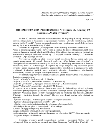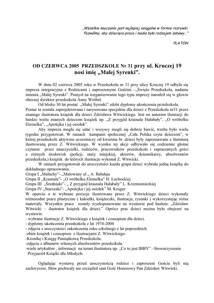 „Wszelkie nauczanie jest najlepiej osiągalne w formie rozrywki. Pozwólmy, aby dziecięca praca i nauka była rodzajem zabawy…” PLATON OD CZERWCA 2005 PRZEDSZKOLE Nr 31 przy ul. Kruczej 19 nosi imię „Małej Syrenki”. W dniu 02 czerwca 2005 roku w Przedszkolu nr 31 przy ulicy Kruczej 19 odbyła się impreza integracyjna z Rodzicami i zaproszonymi Gośćmi –„Święto Przedszkola, nadanie imienia „Małej Syrenki”. Pomysł na zorganizowanie tego typu imprezy narodził się w głowie obecnej dyrektor przedszkola Anny Wróbel. Od blisko 30 lat postać „Małej Syrenki” zdobi dyplomy ukończenia przedszkola. Postać ta została zaprojektowana i narysowana specjalnie dla dzieci z Przedszkola nr31 przez znanego ilustratora książek dla dzieci Zdzisława Witwickiego. Jest on autorem ilustracji do bardzo wielu znanych dzieciom książek np. „Z przygód krasnala Hałabały”, „O wróbelku Elemelku”, „Apolejka i jej osiołek”. Aby impreza mogła się udać i wszyscy mogli się dobrze bawić, trzeba było wielu tygodni przygotowań. W ramach kampanii społecznej „Cała Polska czyta dzieciom”, w której przedszkole aktywnie uczestniczy od kwietnia br. dzieci były zapoznawane z literaturą ilustrowaną przez Z. Witwickiego. W wyniku tej akcji odbywało się codzienne głośne czytanie przez nauczycielki, rodziców, pracowników przedszkola i zapraszanych gości z różnych środowisk (policji, staży miejskiej, aktorów, dziennikarzy, absolwentów przedszkola,) książek do których ilustracje wykonał Z. Witwicki. W ramach przygotowań do uroczystości każda grupa dzieci wybrała jedną książkę do dokładnego opracowania. Grupa I „Maluchy”- „Malowany ul „ A. Bahdaja Grupa II „Krasnale”- „O wróbelku Elemelku” H. Łochockiej Grupa III „Średniaki”- „ Z przygód krasnala Hałabały” L. Krzemienieckiej Grupa IV „Starszaki”- „Apolejka i jej osiołek” M. Kruger. W oparciu o te wybrane pozycje ilustrowane przez Z. Witwickiego dzieci wykonały różnorodne prace plastyczne ( kukiełki, książeczki, ilustracje, rysunki ) wykorzystując różne materiały. Wszystkie prace zostały wyeksponowane na wystawie pod hasłem: „Zdzisław Witwicki – ilustrator książek dla dzieci.” Oprócz prac dzieci można było obejrzeć na wystawie: - wybrane ilustracje Z. Witwickiego z książek i czasopism dla dzieci. - dyplomy ukończenia przedszkola z lat 1974-2004 - zdjęcia z uroczystości zakończenia roku szkolnego z lat poprzednich. -zbiór książek i czasopism z ilustracjami Z. Witwickiego. -Kronikę i Księgę Pamiątkową Przedszkola. -zdjęcia z albumów własnych absolwentów przedszkola. -wiele artykułów , informacji na temat ilustratora np. „Co to jest IBBY” –Stowarzyszenie Przyjaciół Książki dla Młodych. Oglądając wystawę przed uroczystością rodzice i zaproszeni Goście byli nią zachwyceni. Słów pochwały nie szczędził sam Gość Honorowy Pan Zdzisław Witwicki. Na kilka dni przed „Świętem Przedszkola” odbyło się spotkanie autorskie z ilustratorem, na którym dzieci miały okazję porozmawiania z artystą , posłuchania jego opowieści na temat ilustrowanych książek. Miały też okazję przyjrzeć się „na żywo” pracy ilustratora. Pan Z. Witwicki na prośbę dzieci narysował postać Krasnala Hałabały. Pamiątkowe zdjęcia ze spotkania z autorem ilustracji umieszczone są również na naszej wystawie . Zapraszamy serdecznie do jej obejrzenia. Kiedy już wszystko dopięte było na „ostatni guzik”, cały personel martwił się tylko o to, aby w dzień naszego święta dopisała pogoda. W pięknie przybranym ogrodzie wydzielono miejsca dla poszczególnych grup (bajek), które w oparciu o dokładne opracowanie książeczek przygotowały dzieci pod kierunkiem swoich Pań. Tak więc w przedszkolnym ogrodzie znalazł się malowany ul z tysiącem pszczół i pszczółką Bze Bze, miejsce, gdzie Wróbelek Elemelek uczy się od Bociana przepisów ruchu drogowego; las i postać Krasnala Hałabały z różnymi zwierzątkami oraz wysoka wieża przez okno której wygląda smutna Królewna Apolejka. Zorganizowane były również stoliki, krzesełka, ławki, materiały do zabaw plastycznych. Wydzielono miejsce na poczęstunek, który przygotowali Rodzice (kiełbaski z grilla, grochówka, chleb ze smalcem, słodycze , owoce, napoje). Wszystko czekało więc na rozpoczęcie Uroczystości i na dobrą pogodę… Okazało się, że aura nas nie zawiodła. Zawiedli… trochę zaproszeni Goście, którzy być może z ważnych względów nie mogli do nas dotrzeć. Fanfary i „Parada Bajek” po całym ogrodzie rozpoczęły uroczystość. Wspólnie zatańczony taniec z Rodzicami i Gośćmi stał się początkiem dobrej zabawy. Prezentacja poszczególnych bajek, konkurs „Jaka to bajka?”- odgadywanie fragmentów książek czytanych przez aktora Operetki Warszawskiej Pana Marcina Rudzińskiego, prezentacja utworu Ewy Szelburg – Zarębiny „Dwanaście miesięcy” przygotowanych przez grupę Rodziców absolwentów naszego przedszkola. Emocjom i wrażeniom zdawało się nie być końca… Potem nastąpiło symboliczne przekazanie rysunku „Małej Syrenki”, nieco odmienionej: z nową, kolorową tarczą i złotymi warkoczykami , na wyłączne wykorzystanie przez przedszkole. Dzieci wręczyły Panu Witwickiemu kwiaty i album z własnymi rysunkami i podziękowaniami za piękne ilustracje w książkach. Na zakończenie dyrektor A. Wróbel uroczyście ogłosiła, że od dnia 02-czerwca- 2005 przedszkole będzie się nazywało „PRZEDSZKOLEM MAŁEJ SYRENKI” i jej symbolem będzie rysunek wykonany przez Z. Witwickiego, a dzieci uczęszczające do naszego przedszkola będą „strażnikami bajek”. Rodzice, dorośli, nauczyciele obiecali, że będą czytać dzieciom książki 20 minut dziennie. Dzieci zaś obiecały, że będą słuchać bajek czytanych przez dorosłych i będą dbać o książki. Na zakończenie