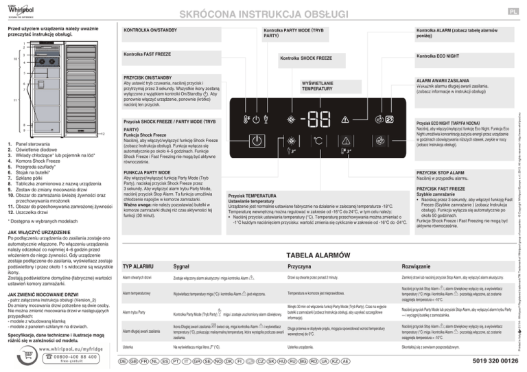 SKRÓCONA INSTRUKCJA OBSŁUGI Przed użyciem urządzenia należy uważnie przeczytać instrukcję obsługi. KONTROLKA ON/STANDBY PL Kontrolka PARTY MODE (TRYB PARTY) Kontrolka ALARM (zobacz tabelę alarmów poniżej) 1 2 5 PRZYCISK ON/STANDBY Aby ustawić tryb czuwania, naciśnij przycisk i przytrzymaj przez 3 sekundy. Wszystkie ikony zostaną wyłączone z wyjątkiem kontrolki On/Standby . Aby ponownie włączyć urządzenie, ponownie (krótko) naciśnij ten przycisk. 6 7 11 ALARM AWARII ZASILANIA Wskaźnik alarmu długiej awarii zasilania. (zobacz informacje w instrukcji obsługi) WYŚWIETLANIE TEMPERATURY Przycisk SHOCK FREEZE / PARTY MODE (TRYB 8 9 Kontrolka ECO NIGHT Kontrolka SHOCK FREEZE 4 12 Panel sterowania Oświetlenie diodowe Wkłady chłodzące* lub pojemnik na lód* Komora Shock Freeze Przegroda szuflady* Stojak na butelki* Szklane półki Tabliczka znamionowa z nazwą urządzenia Zestaw do zmiany mocowania drzwi Obszar do zamrażania świeżej żywności oraz przechowywania mrożonek 11. Obszar do przechowywania zamrożonej żywności 12. Uszczelka drzwi 1. 2. 3. 4. 5. 6. 7. 8. 9. 10. * Dostępna w wybranych modelach JAK WŁĄCZYĆ URZĄDZENIE Po podłączeniu urządzenia do zasilania zostaje ono automatycznie włączone. Po włączeniu urządzenia należy odczekać co najmniej 4–6 godzin przed włożeniem do niego żywności. Gdy urządzenie zostaje podłączone do zasilania, wyświetlacz zostaje podświetlony i przez około 1 s widoczne są wszystkie ikony. Zostają podświetlone domyślne (fabryczne) wartości ustawień komory zamrażarki. JAK ZMIENIĆ MOCOWANIE DRZWI - patrz załączona instrukcja obsługi (Version_2) Do zmiany mocowania drzwi potrzebne są dwie osoby. Nie można zmienić mocowania drzwi w następujących przypadkach: - modele z wbudowaną klamką - modele z panelem szklanym na drzwiach. Specyfikacje, dane techniczne i ilustracje mogą różnić się w zależności od modelu. Przycisk ECO NIGHT (TARYFA NOCNA) Naciśnij, aby włączyć/wyłączyć funkcję Eco Night. Funkcja Eco Night umożliwia koncentrację zużycia energii przez urządzenie w godzinach obowiązywania niższych stawek, zwykle w nocy (zobacz Instrukcja obsługi). PARTY) Funkcja Shock Freeze Naciśnij, aby włączyć/wyłączyć funkcję Shock Freeze (zobacz Instrukcja obsługi). Funkcja wyłącza się automatycznie po około 4–5 godzinach. Funkcje Shock Freeze i Fast Freezing nie mogą być aktywne równocześnie. FUNKCJA PARTY MODE Aby włączyć/wyłączyć funkcję Party Mode (Tryb Party), naciskaj przycisk Shock Freeze przez 3 sekundy. Aby wyłączyć alarm trybu Party Mode, naciśnij przycisk Stop Alarm. Ta funkcja umożliwia chłodzenie napojów w komorze zamrażarki. Ważna uwaga: nie należy pozostawiać butelki w komorze zamrażarki dłużej niż czas aktywności tej funkcji (30 minut). PRZYCISK STOP ALARM Naciśnij w przypadku alarmu. Przycisk TEMPERATURA Ustawianie temperatury Urządzenie jest normalnie ustawiane fabrycznie na działanie w zalecanej temperaturze -18°C. Temperaturę wewnętrzną można regulować w zakresie od -16°C do 24°C, w tym celu należy: • Naciśnij przycisk ustawiania temperatury (°C). Temperaturę przechowywania można zmieniać o -1°C każdym naciśnięciem przycisku: wartość zmienia się cyklicznie w zakresie od -16°C do -24°C. PRZYCISK FAST FREEZE Szybkie zamrażanie • Naciskaj przez 3 sekundy, aby włączyć funkcję Fast Freeze (Szybkie zamrażanie ) (zobacz Instrukcja obsługi). Funkcja wyłącza się automatycznie po około 50 godzinach. Funkcje Shock Freeze i Fast Freezing nie mogą być aktywne równocześnie. TABELA ALARMÓW TYP ALARMU Sygnał Alarm otwartych drzwi Zostaje włączony alarm akustyczny i miga kontrolka Alarm Alarm temperaturowy Wyświetlacz temperatury miga (°C) i kontrolka Alarm Alarm trybu Party Kontrolka Party Mode (Tryb Party) . jest włączona. miga i zostaje uruchomiony alarm dźwiękowy. Przyczyna Rozwiązanie Drzwi są otwarte przez ponad 2 minuty. Zamknij drzwi lub naciśnij przycisk Stop Alarm, aby wyłączyć alarm akustyczny. Temperatura w komorze jest nieprawidłowa. Naciśnij przycisk Stop Alarm ; alarm dźwiękowy wyłączy się, a wyświetlacz temperatury (°C) miga i kontrolka Alarm pozostają włączone, aż zostanie osiągnięta temperatura < -10°C. Minęło 30 min od włączenia funkcji Party Mode (Tryb Party). Czas na wyjęcie butelki z zamrażarki (zobacz Instrukcja obsługi, aby uzyskać szczegółowe informacje). Naciśnij przycisk Party Mode lub przycisk Stop Alarm, aby wyłączyć alarm trybu Party — i wyciągnij butelkę z zamrażalnika. Alarm długiej awarii zasilania Ikona Długiej awarii zasilania świeci się, miga kontrolka Alarm i wyświetlacz Długa przerwa w dopływie prądu, mogąca spowodować wzrost temperatury temperatury (°C), pokazując maksymalną temperaturę, która wystąpiła podczas awarii wewnętrznej do 0°C. zasilania. Naciśnij przycisk Stop Alarm ; alarm dźwiękowy wyłączy się, a wyświetlacz temperatury (°C) miga i kontrolka Alarm pozostają włączone, aż zostanie osiągnięta temperatura < -10°C. Usterka Na wyświetlaczu miga litera „F” (°C). Skontaktuj się z serwisem posprzedażowym. DE GB FR NL ES PT IT GR SE NO DK Usterka urządzenia. FI PL CZ SK HU RU BG RO UA KZ AE 01/14 - Whirlpool® Registered trademark/TM Trademark of Whirlpool group of companies - © Copyright Whirlpool Europe s.r.l. 2013. All rights reserved - http://www.whirlpool.eu Kontrolka FAST FREEZE 3 Printed in Italy 10 5019 320 00126
