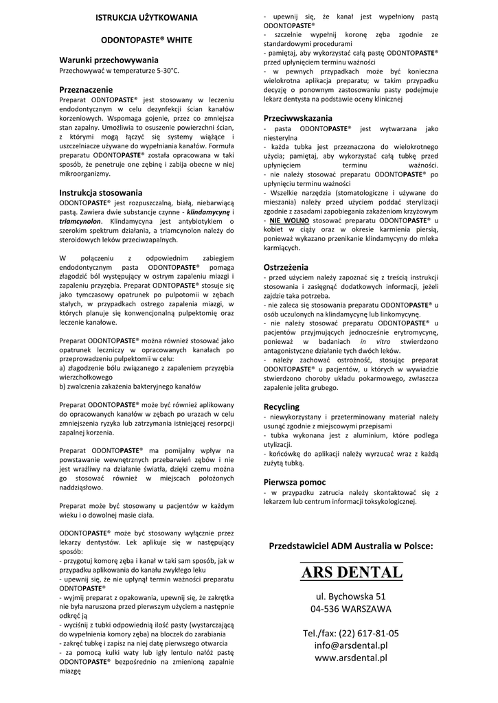ISTRUKCJA UŻYTKOWANIA ODONTOPASTE® WHITE Warunki przechowywania Przechowywad w temperaturze 5-30°C. Przeznaczenie Preparat ODNTOPASTE® jest stosowany w leczeniu endodontycznym w celu dezynfekcji ścian kanałów korzeniowych. Wspomaga gojenie, przez co zmniejsza stan zapalny. Umożliwia to osuszenie powierzchni ścian, z którymi mogą łączyd się systemy wiążące i uszczelniacze używane do wypełniania kanałów. Formuła preparatu ODONTOPASTE® została opracowana w taki sposób, że penetruje one zębinę i zabija obecne w niej mikroorganizmy. Instrukcja stosowania ODONTOPASTE® jest rozpuszczalną, białą, niebarwiącą pastą. Zawiera dwie substancje czynne - klindamycynę i triamcynolon. Klindamycyna jest antybiotykiem o szerokim spektrum działania, a triamcynolon należy do steroidowych leków przeciwzapalnych. W połączeniu z odpowiednim zabiegiem endodontycznym pasta ODONTOPASTE® pomaga złagodzid ból występujący w ostrym zapaleniu miazgi i zapaleniu przyzębia. Preparat ODNTOPASTE® stosuje się jako tymczasowy opatrunek po pulpotomii w zębach stałych, w przypadkach ostrego zapalenia miazgi, w których planuje się konwencjonalną pulpektomię oraz leczenie kanałowe. Preparat ODONTOPASTE® można również stosowad jako opatrunek leczniczy w opracowanych kanałach po przeprowadzeniu pulpektomii w celu: a) złagodzenie bólu związanego z zapaleniem przyzębia wierzchołkowego b) zwalczenia zakażenia bakteryjnego kanałów Preparat ODONTOPASTE® może byd również aplikowany do opracowanych kanałów w zębach po urazach w celu zmniejszenia ryzyka lub zatrzymania istniejącej resorpcji zapalnej korzenia. Preparat ODONTOPASTE® ma pomijalny wpływ na powstawanie wewnętrznych przebarwieo zębów i nie jest wrażliwy na działanie światła, dzięki czemu można go stosowad również w miejscach położonych naddziąsłowo. Preparat może byd stosowany u pacjentów w każdym wieku i o dowolnej masie ciała. ODONTOPASTE® może byd stosowany wyłącznie przez lekarzy dentystów. Lek aplikuje się w następujący sposób: - przygotuj komorę zęba i kanał w taki sam sposób, jak w przypadku aplikowania do kanału zwykłego leku - upewnij się, że nie upłynął termin ważności preparatu ODNTOPASTE® - wyjmij preparat z opakowania, upewnij się, że zakrętka nie była naruszona przed pierwszym użyciem a następnie odkręd ją - wyciśnij z tubki odpowiednią ilośd pasty (wystarczającą do wypełnienia komory zęba) na bloczek do zarabiania - zakręd tubkę i zapisz na niej datę pierwszego otwarcia - za pomocą kulki waty lub igły lentulo nałóż pastę ODONTOPASTE® bezpośrednio na zmienioną zapalnie miazgę - upewnij się, że kanał jest wypełniony pastą ODONTOPASTE® - szczelnie wypełnij koronę zęba zgodnie ze standardowymi procedurami - pamiętaj, aby wykorzystad całą pastę ODONTOPASTE® przed upłynięciem terminu ważności - w pewnych przypadkach może byd konieczna wielokrotna aplikacja preparatu; w takim przypadku decyzję o ponownym zastosowaniu pasty podejmuje lekarz dentysta na podstawie oceny klinicznej Przeciwwskazania - pasta ODONTOPASTE® jest wytwarzana jako niesterylna - każda tubka jest przeznaczona do wielokrotnego użycia; pamiętaj, aby wykorzystad całą tubkę przed upłynięciem terminu ważności. - nie należy stosowad preparatu ODONTOPASTE® po upłynięciu terminu ważności - Wszelkie narzędzia (stomatologiczne i używane do mieszania) należy przed użyciem poddad sterylizacji zgodnie z zasadami zapobiegania zakażeniom krzyżowym - NIE WOLNO stosowad preparatu ODONTOPASTE® u kobiet w ciąży oraz w okresie karmienia piersią, ponieważ wykazano przenikanie klindamycyny do mleka karmiących. Ostrzeżenia - przed użyciem należy zapoznad się z treścią instrukcji stosowania i zasięgnąd dodatkowych informacji, jeżeli zajdzie taka potrzeba. - nie zaleca się stosowania preparatu ODONTOPASTE® u osób uczulonych na klindamycynę lub linkomycynę. - nie należy stosowad preparatu ODONTOPASTE® u pacjentów przyjmujących jednocześnie erytromycynę, ponieważ w badaniach in vitro stwierdzono antagonistyczne działanie tych dwóch leków. - należy zachowad ostrożnośd, stosując preparat ODONTOPASTE® u pacjentów, u których w wywiadzie stwierdzono choroby układu pokarmowego, zwłaszcza zapalenie jelita grubego. Recycling - niewykorzystany i przeterminowany materiał należy usunąd zgodnie z miejscowymi przepisami - tubka wykonana jest z aluminium, które podlega utylizacji. - koocówkę do aplikacji należy wyrzucad wraz z każdą zużytą tubką. Pierwsza pomoc - w przypadku zatrucia należy skontaktowad się z lekarzem lub centrum informacji toksykologicznej. Przedstawiciel ADM Australia w Polsce: ul. Bychowska 51 04-536 WARSZAWA Tel./fax: (22) 617-81-05 [email protected] www.arsdental.pl