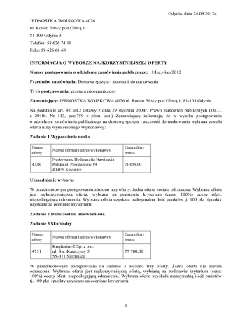 Gdynia, dnia 24.09.2012r. JEDNOSTKA WOJSKOWA 4026 ul. Rondo Bitwy pod Oliwą 1 81-103 Gdynia 3 Telefon: 58 626 74 19 Faks: 58 626 66 69 INFORMACJA O WYBORZE NAJKORZYSTNIEJSZEJ OFERTY Numer postępowania o udzielenie zamówienia publicznego: 11/Inż.-Sap/2012 Przedmiot zamówienia: Dostawa sprzętu i akcesorii do nurkowania Tryb postępowania: przetarg nieograniczony Zamawiający: JEDNOSTKA WOJSKOWA 4026 ul. Rondo Bitwy pod Oliwą 1, 81-103 Gdynia Na podstawie art. 92 ust.2 ustawy z dnia 29 stycznia 2004r. Prawo zamówień publicznych (Dz.U. z 2010r. Nr 113, poz.759 z późn. zm.) Zamawiający informuje, że w wyniku postępowania o udzielenie zamówienia publicznego na dostawę sprzętu i akcesorii do nurkowania wybrana została oferta niżej wymienionego Wykonawcy: Zadanie 1 Wyposażenie nurka Numer oferty Nazwa (firma) i adres wykonawcy Cena oferty brutto 4728 Nurkowanie Hydrografia Nawigacja Polska ul. Powstańców 19 40-039 Katowice 71 059,00 Uzasadnienie wyboru: W przedmiotowym postępowaniu złożono trzy oferty. Jedna oferta została odrzucona. Wybrana oferta jest najkorzystniejszą ofertą, wybraną na podstawie kryterium (cena: 100%) oceny ofert, niepodlegającą odrzuceniu. Wybrana oferta uzyskała maksymalną ilość punktów tj. 100 pkt (punkty uzyskane za oceniane kryterium). Zadanie 2 Butle zostało unieważnione. Zadanie 3 Skafandry Numer oferty Nazwa (firma) i adres wykonawcy Cena oferty brutto 4751 Konfexim-2 Sp. z o.o. ul. Św. Katarzyny 5 55-071 Siechnice 77 700,00 W przedmiotowym postępowaniu na zadanie 3 złożono trzy oferty. Żadna oferta nie została odrzucona. Wybrana oferta jest najkorzystniejszą ofertą, wybraną na podstawie kryterium (cena: 100%) oceny ofert, niepodlegającą odrzuceniu. Wybrana oferta uzyskała maksymalną ilość punktów tj. 100 pkt (punkty uzyskane za oceniane kryterium). 1 Streszczenie oceny i porównania złożonych ofert zadanie 1 Wyposażenie nurka Numer oferty 4728 4745 4754/1 Nazwa (firma) i adres wykonawcy Nurkowanie Hydrografia Nawigacja Polska ul. Powstańców 19 40-039 Katowice Ocean-Tech S.C. ul. Perseusza 9 80-299 Gdańsk Centrum Nurkowania i Turystyki Aktywnej „Ticada” ul. Janka Wiśniewskiego 26 81-335 Gdynia Cena oferty brutto Liczba punktów 71 059,00 100 pkt 57 150,00 Oferta odrzucona 85 200,00 83 pkt Streszczenie oceny i porównania złożonych ofert zadanie 2 Butle Numer oferty Nazwa (firma) i adres wykonawcy 4754/2 Centrum Nurkowania i Turystyki Aktywnej „Ticada” ul. Janka Wiśniewskiego 26 81-335 Gdynia Cena oferty brutto Liczba punktów 75 900,00 100 pkt Zamawiający unieważnił postępowanie o zamówienie publiczne w zakresie zadania nr 2 na podstawie art. 93 pkt. 1ppk. 4 ) Pzp. – cena najkorzystniejszej oferty lub oferta z najniższą ceną przewyższa kwotę, którą Zamawiający zamierza przeznaczyć na sfinansowanie zamówienia. Streszczenie oceny i porównania złożonych ofert zadanie 3 Skafandry Numer oferty 4729 4739 4751 Nazwa (firma) i adres wykonawcy Santi Sp. z o.o. Tadeusza Wendy 7/9 81-341 Gdynia Ocean Pro Systemy Nurkowe ul. Polna 20 55-010 Smardzów Konfexim-2 Sp. z o.o. ul. Św. Katarzyny 5 55-071 Siechnice Cena oferty brutto Liczba punktów 115 890,00 67 pkt 129 368,80 60 pkt 77 700,00 100 pkt Zamawiający zawrze umowę w sprawie zamówienia publicznego w terminie nie krótszym niż 5 dni od dnia przesłania zawiadomienia o wyborze najkorzystniejszej oferty. DOWÓDCA kmdr Dariusz WICHNIAREK 2