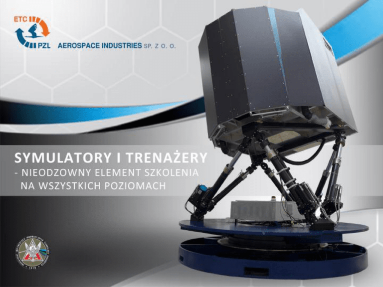 Interoperacyjność i modułowość symulatorów jako wyznaczniki nowoczesnego szkolenia Historia firmy 1984 - PZL „Warszawa - Okęcie” Wydział Symulatorów 1988 - Zakład Innowacyjno-Wdrożeniowy Systemów Symulacyjnych i Elektronicznych 1991 - IDS-PZL Aerospace Industries Sp. z o.o. 1994 - MP-PZL Aerospace Industries Sp. z o.o. 1998 - ETC-PZL Aerospace Industries Sp. z o.o. Podstawowe informacje o firmie ETC-PZL Aerospace Industries Sp. z o.o.: • posiada ponad 25 lat doświadczeń w budowie symulatorów i urządzeń treningowych • zatrudnia ponad 110 osób (ok. 60 programistów), w tym 80% z wykształceniem wyższym Posiada: • certyfikaty ISO 9001:2008 i AQAP 2110:2009, • Wewnętrzny System Kontroli, Świadectwo Bezpieczeństwa Przemysłowego, kod NCAGE Około 75% produkcji przeznaczone jest na export Użytkownicy naszych symulatorów USA Australia Czechy Hiszpania Holandia Niemcy Polska Wielka Brytania Arabia Saudyjska Bangladesz Indie Indonezja Japonia Jordania Korea Płd. Malezja Pakistan Singapur Tajlandia Turcja Oferta Oferujemy przede wszystkim: - symulatory ruchomych obiektów • kompleksowe symulatory lotu samolotów i śmigłowców wojskowych oraz cywilnych • symulatory czołgów i pojazdów wojskowych - symulatory systemów • symulatory pola walki • symulatory systemów uzbrojenia - komputerowe systemy dydaktyczne (CBT/CAI) Opracowana technologia, zastosowana w użytkowanych i proponowanych systemach, ma wszystkie immanentne cechy współczesnych systemów symulacyjnych Interoperacyjność Możliwość współpracy z innymi systemami symulacyjnymi (istniejącymi lub przyszłymi) zapewniona poprzez zastosowanie standardowych interfejsów , np.: • HLA – interoperacyjność symulatorów • OpenFlight – interoperacyjność baz danych • CIGI – interoperacyjność interfejsów generatorów obrazu • ARINC 429, MIL 1553B – interoperacyjność przyrządów i systemów pokładowych • SCORM – interoperacyjność systemów CBT Umożliwia łączenia różnych symulatorów, a tym samym trening we wspólnej przestrzeni wirtualnej zarówno operatorów podobnych obiektów, jak i szkolenie współdziałania różnych rodzajów wojsk Modułowość • Dynamika i systemy pokładowe • Generator obrazu • Baza danych wizualizacyjnych i nawigacyjnych • Sztuczna inteligencja • Wirtualne pole walki • Analiza ćwiczenia • HLA Modułowość (2) Modułowość umożliwia: • stosowanie poszczególnych modułów o różnym stopniu złożoności w zależności od potrzeb klienta • łatwe stosowanie rzeczywistych urządzeń i systemów (stymulacja) • stosowanie modułów opracowanych przez inne firmy lub przez klienta • łatwą skalowalność symulatora zarówno w zakresie funkcjonalności jak i stosowanego hardware’u Urządzenia do treningu fizjologicznego Wirówki wysokich przeciążeń • • • • • • • Wirówka ATS-400 Długość ramienia 7,6 m Przeciążenie ciągłe do 15 G Prędkość narastania przeciążenia 15G/s Możliwość treningu taktycznego Modułowa konstrukcja kabin Możliwość treningu zespołowego Możliwość połączenia z innymi urządzeniami za pomocą DIS/HLA Urządzenia do treningu dezorientacji przestrzennej • • • • • Zapoznanie się ze zjawiskami somatosensorycznymi i okulosensorycznymi powstającymi podczas utraty orientacji przestrzennej Możliwość treningu pasywnego i aktywnego lotu Wymienne kabiny Monitoring medyczny Unikatowy system ruchu Urządzenia do treningu dezorientacji przestrzennej (2) Kabina pilota z trójkanałowym układem wizualizacji umieszczona na platformie Stewarda zamontowanej na obrotowym stole Wymienne kabiny: - samolotu transportowego - samolotu myśliwskiego - śmigłowca Symulator „Selekcjoner” Wymienne kabiny: samolotu myśliwskiego (F-16) i śmigłowca (PZL-W3PL – Głuszec) W 2015 r. zostaną dołączone kabiny samolotów: Iskra TS-11 i Orlik TC-II Urządzenie treniengowe FNPT - II Dwie kabiny, ale symulacja pięciu obiektów latających: - samoloty Cessna-172, Piper Seneka V oraz M-28 - śmigłowce SW-4 i Schweizer H-300 Symulator lotu SLM-28 Symulator poziomu C samolotu M-28 z dwoma wymiennymi kabinami Symulator lotu SLM-28 (2) Kabiny: Gold Crown (z lewej) i Glass Cockpit (z prawej) Symulator lotu SLM-28 (3) Stanowiska instruktora: stacjonarne oraz w kabinie symulatora Katapulty typu I • proste urządzenie bez możliwości symulacji lotu • maksymalne przyspieszenia podczas katapultowania 3-4 G Katapulty typu II • • • kabiny pozwalające na symulowanie lotu wizualizacja widoku z kabiny maksymalne przyspieszenia podczas katapultowania (6-10 G) Symulatory samochodowe Symulatory samochodowe Graficzne bazy danych Symulator pojazdów uprzywilejowanych Modele podstawowe: • Kia Ceed • Fiat Ducato Modele dla BOR: • Mercedes S600 w wersji opancerzonej • Mercedes Viano • BMW 760i w wersji opancerzonej • Audi A6 • Audi Q7 Symulatory Dowodzenia Oddziałami Policji Platforma symulatorowa Wyższa Szkoła Policji Szczytno Symulator dowodzenia działaniami Policji SDOP Symulator kierowania pojazdami uprzywilejowanymi Symspec Symulator robota mobilnego GRYF Symulator drona Serwer HLA Szkoła Główna Straży Pożarnej Warszawa Symulator dowodzenia działaniami ratowniczymi związanymi z pożarami wielokondygnacyjnymi i wypadkami komunikacyjnymi Politechnika Warszawska Warszawa Symulator śmigłowca SW4 Symulator samolotu lekkiego Symulator robota mobilnego i bezpilotowego statku latającego CBT/CAI - wsparcie dla szkolenia CBT/CAI - wsparcie dla szkolenia (2) CBT/CAI - wsparcie dla szkolenia (3) CBT/CAI - wsparcie dla szkolenia (4) CBT/CAI - wsparcie dla szkolenia (5) CBT/CAI - wsparcie dla szkolenia (6) CBT/CAI - wsparcie dla szkolenia (7) CBT/CAI - wsparcie dla szkolenia (8) Nasze oprogramowanie: • jest zgodne ze standardem SCORM 1.2 oraz SCORM 2004 • może być opracowane na wszystkich poziomach: - poziom 1 – bez interaktywności - poziom 2 – int