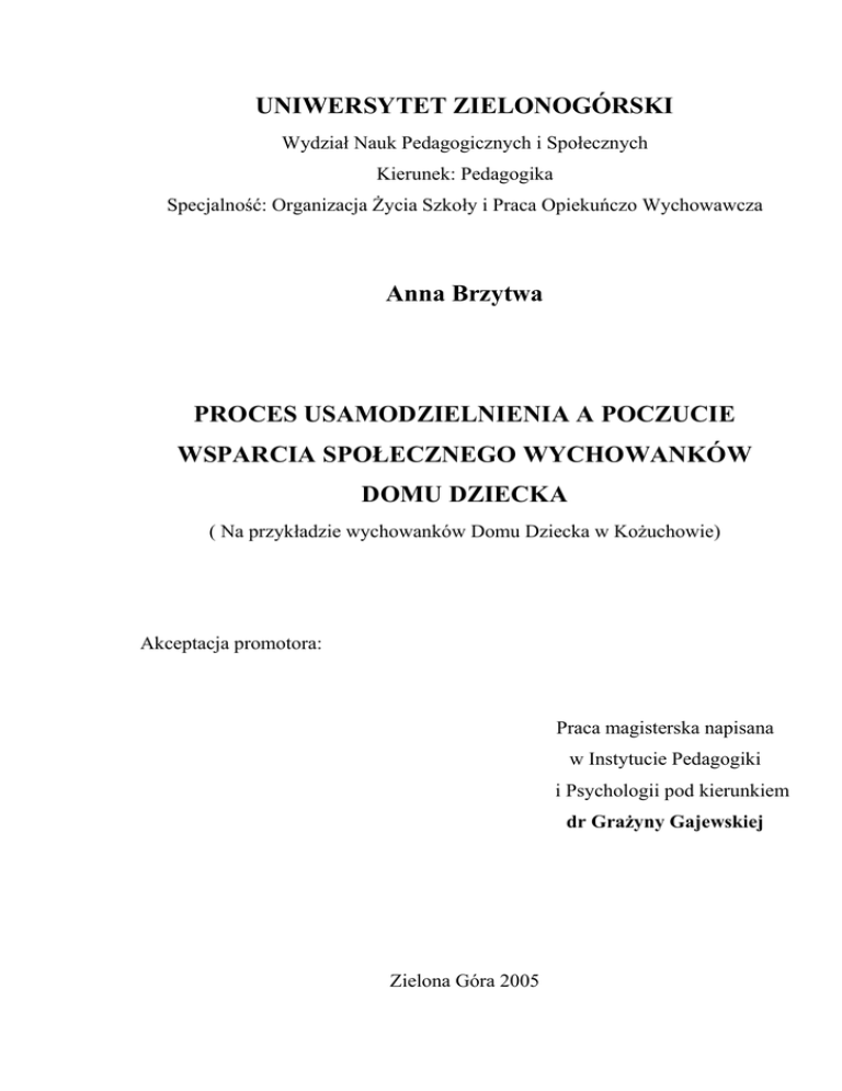 UNIWERSYTET ZIELONOGÓRSKI Wydział Nauk Pedagogicznych i Społecznych Kierunek: Pedagogika Specjalność: Organizacja Życia Szkoły i Praca Opiekuńczo Wychowawcza Anna Brzytwa PROCES USAMODZIELNIENIA A POCZUCIE WSPARCIA SPOŁECZNEGO WYCHOWANKÓW DOMU DZIECKA ( Na przykładzie wychowanków Domu Dziecka w Kożuchowie) Akceptacja promotora: Praca magisterska napisana w Instytucie Pedagogiki i Psychologii pod kierunkiem dr Grażyny Gajewskiej Zielona Góra 2005 1 SPIS TREŚCI WSTĘP...............................................................................................................1 1. Proces usamodzielnienia jako cel wychowania opiekuńczego w Domu Dziecka...............................................................................................................3 1.1. Uwagi wstępne dotyczące samodzielności życiowej................................................3 1.2. Przebieg procesu usamodzielnienia wychowanków w domu dziecka...................8 1.3. Problemy usamodzielnianych wychowanków w domu dziecka...........................13 1.4. Innowacje dotyczące usamodzielniania wychowanków w domu dziecka...........15 1.4.1. Mieszkania usamodzielnień.............................................................................15 1.4.2. Grupa usamodzielnienia..................................................................................18 1.4.3. Grupa autonomiczna........................................................................................20 1.5. Opieka instytucjonalna w krajach Unii Europejskiej..........................................23 1.6. Dojrzałość fizyczna wychowanków domu dziecka................................................27 1.7. Dojrzałość psychiczna wychowanków domu dziecka.......................................... 29 1.8. Dojrzałość społeczna wychowanków domu dziecka.............................................37 1.8.1. Przygotowanie wychowanków domu dziecka do życia w rodzinie..............39 1.8.2. Przygotowanie wychowanków domu dziecka do zawodu.............................43 1.8.3. Przygotowanie wychowanków domu dziecka do życia społecznego............46 2. Charakterystyka zjawiska wsparcia społecznego na podstawie literatury psychologiczno - pedagogicznej.......................................................................49 2.1. Definicje wsparcia społecznego..............................................................................49 2.2. Potrzeby bio-psychiczne wychowanków domu dziecka jako wyznacznik oparcia społecznego..............................................................................................................62 2.2.1. Potrzeby fizjologiczne wychowanków domu dziecka....................................66 2.2.2. Potrzeby psycho-emocjonalne wychowanków domu dziecka......................68 2.3. Przyczyny niezaspokojenia potrzeb wychowanków domu dziecka.....................76 2.4. Oparcie społeczne wychowanków w podstawowych przestrzeniach życia społecznego...........................................................................................................................79 2.5. Wsparcie społeczne wychowanków domu dziecka w badaniach empirycznych........................................................................................................................82 2 3. Metodologiczne podstawy pracy......................................................................87 3.1. Cel i przedmiot badań.................................................................................................89 3.2. Problemy i hipotezy badawcze...................................................................................91 3.3. Zmienne, wskaźniki i kategorie badawcze................................................................96 3.4. Metody badań, techniki i narzędzia badawcze.......................................................108 4. Charakterystyka terenu i badanej populacji.............................................................113 4.1. Dom Dziecka w Kożuchowie jako zastępcze środowisko opiekuńczowychowawcze....................................................................................................................113 4.2. Funkcjonowanie mieszkań usamodzielnień przy Domu Dziecka w Kożuchowie.........................................................................................................................115 4.3. Charakterystyka badanej populacji.........................................................................129 4.4. Organizacja i przebieg badań...................................................................................133 5. Proces usamodzielnienia a poczucie wsparcia społecznego wychowanków Domu Dziecka w Kożuchowie...........................................................................134 5.1. Wsparcie społeczne wychowanków Domu Dziecka................................................134 5.2. Przygotowanie wychowanków do samodzielnego życia rodzinnego.....................144 5.3. Przygotowanie wychowanków do życia zawodowego.............................................149 5.4. Przygotowanie wychowanków do życia społecznego..............................................152 5.5. Sytuacja bio-psychiczna wychowanków w trakcie usamodzielnienia...................158 5.6. Sytuacja społeczna wychowanków w trakcie usamodzielnienia............................160 5.7. Pobyt wychowanków w Domu Dziecka...................................................................165 Uogólnienia i wnioski..............................................................................................................174 Spis tabel Spis wykresów Bibliografia Spis aneksów Aneksy 3 WSTĘP Przygotowanie wychowanków do usamodzielnienia jest nadrzędnym zadaniem każdej placówki opiekuńczo-wychowawczej, jaką stanowi Dom Dziecka. Dzień, gdy wychowanek opuszcza mury placówki, jest to uroczyste i ważne wydarzenie. Jest on związany również z ca