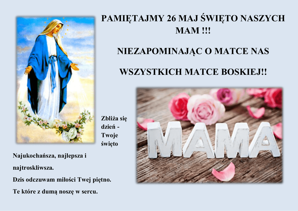 PAMIĘTAJMY 26 MAJ ŚWIĘTO NASZYCH MAM !!! NIEZAPOMINAJĄC O MATCE NAS WSZYSTKICH MATCE BOSKIEJ!! Zbliża się dzień Twoje święto Najukochańsza, najlepsza i najtroskliwsza. Dzis odczuwam miłości Twej piętno. Te które z dumą noszę w sercu. Mamo, Matulu, Mateczko, dziękuje Ci za życie które mi dałaś, za każdą spędzoną z Tobą chwile, za to że mnie wychowałaś. I w dniu Twego święta, w każdym życia dniu. Bądź zawsze radosna, uśmiechnięta, a Twego spokojnego snu niech Bóg strzeże i Panna Święta. Mamusiu droga! wciąż proszę Boga, który króluje na niebie, by ręką Boska przed wielka troską ochraniać zawsze chciał Ciebie. Dziś tym goręcej z duszy dziecięcej prośba się w górę wyrywa, abyś się miła, zdrowiem cieszyła i zawsze była szczęśliwa. Mamo, tak bardzo Cię kocham, dziękuje Ci za Twój uśmiech, który ogrzewa mnie w różnych chwilach życia a najbardziej dziękuję Ci za to że jesteś. Maryja, Matka Boża Maryja -podobnie do wszystkich matek nosiła Jezusa dziewięć miesięcy pod swoim sercem i urodziła Go, kiedy nadszedł czas rozwiązania. Czy chodzi tu tylko o macierzyństwo fizyczne i czysto prywatną wieź miedzy Jezusem a Maryją? Nie tylko. Maryja jest nie tylko cieleśnie matką Pana, do istoty Jej macierzyństwa należy Jej wiara. Zanim bowiem poczęła Jezusa w ciele, przyjęła Go we wierze. Macierzyństwo Maryi oznacza, że Ona jest nie tylko matką Jezusa i matką Pana, jest także matką Syna Bożego (por. Łk l, 35). Jeśli Maryję - jak mówi Nowy Testament osłania Duch Boży, to staje się ona nowym mieszkaniem Boga, w którym Słowo Boże zamieszkało między nami (por. J l, 14). Na podstawie wypowiedzi Pisma Świętego Kościół mógł na III soborze powszechnym, Soborze w Efezie (r. 431), ogłosić swą naukę: Maryja jest Matką Boga. To wyznanie jest wspólne wszystkim chrześcijanom. Trwali przy nim także reformatorzy XVI w. (protestanci). Oczywiście, określenie "Matka Boga" należy rozumieć we właściwy sposób. Maryja nie urodziła Boga jako Boga. Głosić coś podobnego nie byłoby Ewangelią, ale czysto mitologią, w której nieraz jest mowa o pierwiastku niewieścim w bóstwie czy nawet o "stwórcy bożej". Maryja, w którą wierzy Kościół, jest i pozostaje stworzeniem! Nie zrodziła Boga jako Boga, ale zrodziła Jezusa Chrystusa w Jego człowieczeństwie złączonym istotowo z Bóstwem. Wiara w Boskie macierzyństwo Maryi jest więc ostatecznie wiarą w Jezusa Chrystusa, który w jednej osobie jest Bogiem i człowiekiem. źródło katolik.pl
