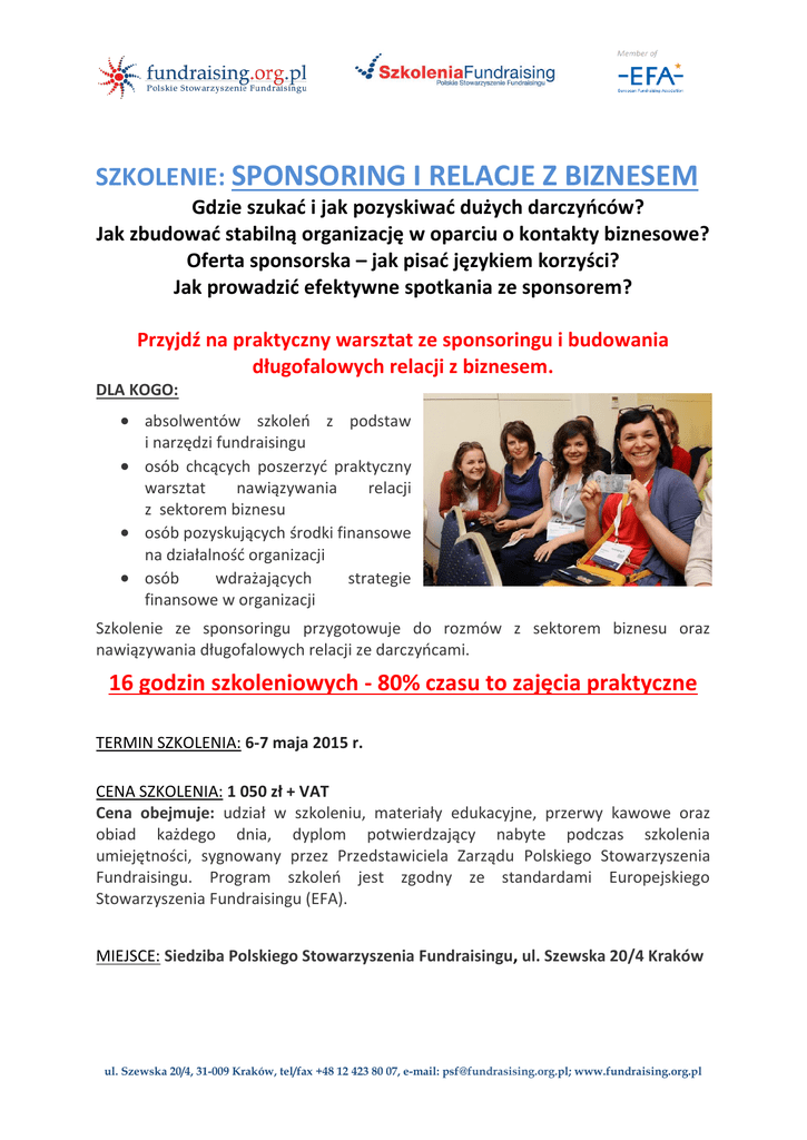 SZKOLENIE: SPONSORING I RELACJE Z BIZNESEM Gdzie szukać i jak pozyskiwać dużych darczyńców? Jak zbudować stabilną organizację w oparciu o kontakty biznesowe? Oferta sponsorska – jak pisać językiem korzyści? Jak prowadzić efektywne spotkania ze sponsorem? Przyjdź na praktyczny warsztat ze sponsoringu i budowania długofalowych relacji z biznesem. DLA KOGO: absolwentów szkoleń z podstaw i narzędzi fundraisingu osób chcących poszerzyć praktyczny warsztat nawiązywania relacji z sektorem biznesu osób pozyskujących środki finansowe na działalność organizacji osób wdrażających strategie finansowe w organizacji Szkolenie ze sponsoringu przygotowuje do rozmów z sektorem biznesu oraz nawiązywania długofalowych relacji ze darczyńcami. 16 godzin szkoleniowych - 80% czasu to zajęcia praktyczne TERMIN SZKOLENIA: 6-7 maja 2015 r. CENA SZKOLENIA: 1 050 zł + VAT Cena obejmuje: udział w szkoleniu, materiały edukacyjne, przerwy kawowe oraz obiad każdego dnia, dyplom potwierdzający nabyte podczas szkolenia umiejętności, sygnowany przez Przedstawiciela Zarządu Polskiego Stowarzyszenia Fundraisingu. Program szkoleń jest zgodny ze standardami Europejskiego Stowarzyszenia Fundraisingu (EFA). MIEJSCE: Siedziba Polskiego Stowarzyszenia Fundraisingu, ul. Szewska 20/4 Kraków ul. Szewska 20/4, 31-009 Kraków, tel/fax +48 12 423 80 07, e-mail: [email protected]; www.fundraising.org.pl PROGRAM: SPONSORING I RELACJE Z BIZNESEM 2 DNI SZKOLENIA, 16 GODZIN WARSZTATOWYCH I dzień: Marketing, sponsoring, Public relations w biznesie (8 godzin). Jak odróżniać darczyńcę od sponsora. Cele marketingowe i wykorzystywanie sponsoringu w firmach. Co trzeba rozumieć ze świata biznesu. Podstawowe pojęcia. Jak biznes widzi organizacje pozarządowe. Jak organizacje społeczne i instytucje zniechęcają do współpracy. Mali i wielcy sponsorzy - interesy, korzyści, inwestycje, koszt i zysk. Jakie znaczenie w biznesie mają relacje publiczne (PR). Partner czy sponsor – jak wykorzystać skłonności do sponsorowania – język korzyści. Czy każda organizacja może być podmiotem sponsoringu. Niebezpieczeństwa mechanizmu. Tworzenie partnerstwa. Standardy działań czyli jak rozumieć CSR i inne zaawansowane normy i systemy zarządzania. II dzień: Praca ze sponsorem (8 godzin). Przygotowanie organizacji do sponsoringu. Standardy niezbędne w pracy ze sponsorem. Komunikacja ze sponsorem/ partnerem. Gdzie go szukać? Opracowanie oferty sponsorskiej - ćwiczenia. Efektywne spotkanie ze sponsorem – ćwiczenia. Jak utrzymać sponsora? Koszty sponsoringu. Jak budować budżet działań sponsorskich? Jakie firmy nadają się do sponsoringu. Sponsoring w planie fundraisingowym organizacji. ul. Szewska 20/4, 31-009 Kraków, tel/fax +48 12 423 80 07, e-mail: [email protected]; www.fundraising.org.pl TRENER: Dominika Langer-Gniłka Wiceprezes i Dyrektor Działu Budowania Relacji Partnerskich w Stowarzyszeniu WIOSNA, gdzie pracuje od 2008 roku i odpowiada za pozyskiwanie funduszy, współpracę z darczyńcami indywidualnymi oraz sektorem biznesowym. Pozyskuje partnerów biznesowych, dzięki którym Stowarzyszenie jest nie tylko finansowane, ale też się profesjonalizuje. Pracując w Stowarzyszeniu WIOSNA nawiązała współpracę m.in. z PZU, Poczta Polska, Bank PKO BP, C&A, State Street Corporation, UBS, TK MAXX. Posiada kilkuletnie doświadczenie pracy w międzynarodowej korporacji, z której zrezygnowała w 2007, żeby realizować życiowe marzenie rocznej podróży dookoła świata. Jest absolwentką Uniwersytetu Ekonomicznego w Krakowie. Ukończyła program Professional Diploma in Marketing (CIM), studia podyplomowe z Psychologii Biznesu oraz Zarządzania Projektami. Certyfikowany Menedżer Projektów (IPMA, Level D), Fundraiser (Polski Certyfikat Fundraisingu, zgodny ze standardami EFA), trener. Członek Polskiego Stowarzyszenia Fundraisingu. KONTAKT: Justyna Junga Specjalista ds. promocji i sprzedaży Tel.: 663 490 000 e-mail: [email protected] www.szkolenia.fundraising.org.pl ul. Szewska 20/4, 31-009 Kraków, tel/fax +48 12 423 80 07, e-mail: [email protected]; www.fundraising.org.pl