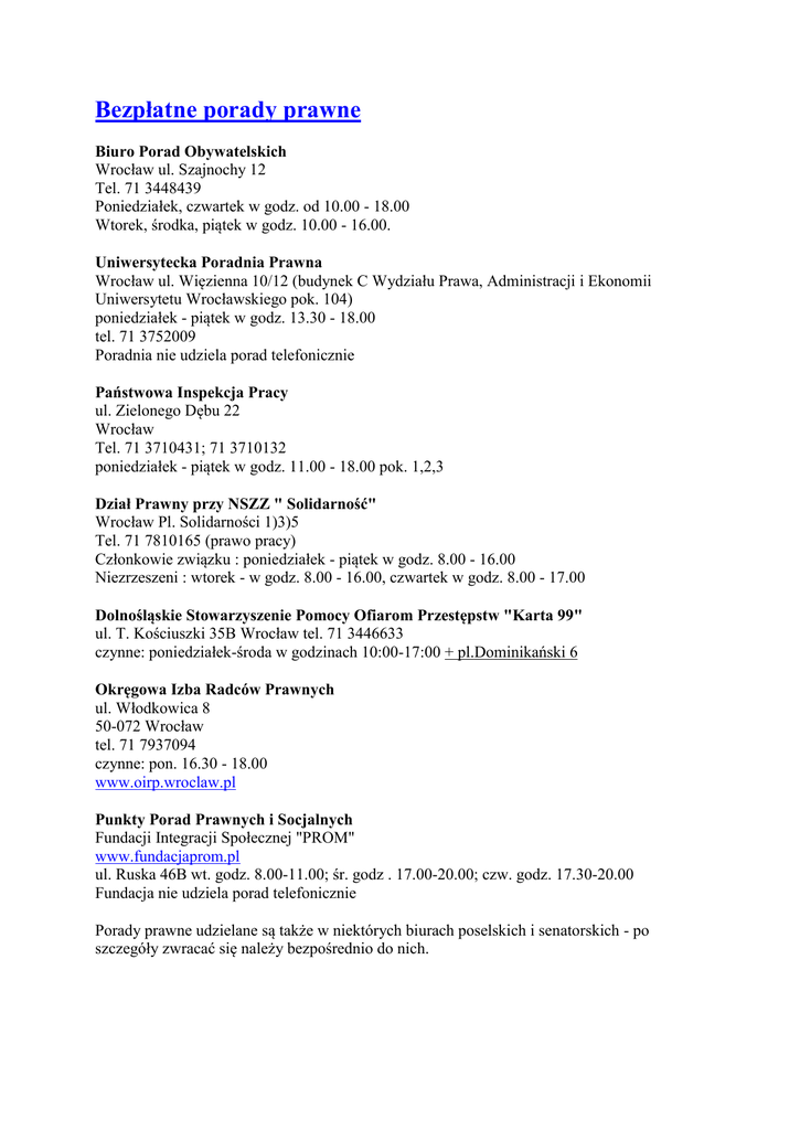 Bezpłatne porady prawne Biuro Porad Obywatelskich Wrocław ul. Szajnochy 12 Tel. 71 3448439 Poniedziałek, czwartek w godz. od 10.00 - 18.00 Wtorek, środka, piątek w godz. 10.00 - 16.00. Uniwersytecka Poradnia Prawna Wrocław ul. Więzienna 10/12 (budynek C Wydziału Prawa, Administracji i Ekonomii Uniwersytetu Wrocławskiego pok. 104) poniedziałek - piątek w godz. 13.30 - 18.00 tel. 71 3752009 Poradnia nie udziela porad telefonicznie Państwowa Inspekcja Pracy ul. Zielonego Dębu 22 Wrocław Tel. 71 3710431; 71 3710132 poniedziałek - piątek w godz. 11.00 - 18.00 pok. 1,2,3 Dział Prawny przy NSZZ " Solidarność" Wrocław Pl. Solidarności 1)3)5 Tel. 71 7810165 (prawo pracy) Członkowie związku : poniedziałek - piątek w godz. 8.00 - 16.00 Niezrzeszeni : wtorek - w godz. 8.00 - 16.00, czwartek w godz. 8.00 - 17.00 Dolnośląskie Stowarzyszenie Pomocy Ofiarom Przestępstw "Karta 99" ul. T. Kościuszki 35B Wrocław tel. 71 3446633 czynne: poniedziałek-środa w godzinach 10:00-17:00 + pl.Dominikański 6 Okręgowa Izba Radców Prawnych ul. Włodkowica 8 50-072 Wrocław tel. 71 7937094 czynne: pon. 16.30 - 18.00 www.oirp.wroclaw.pl Punkty Porad Prawnych i Socjalnych Fundacji Integracji Społecznej "PROM" www.fundacjaprom.pl ul. Ruska 46B wt. godz. 8.00-11.00; śr. godz . 17.00-20.00; czw. godz. 17.30-20.00 Fundacja nie udziela porad telefonicznie Porady prawne udzielane są także w niektórych biurach poselskich i senatorskich - po szczegóły zwracać się należy bezpośrednio do nich.