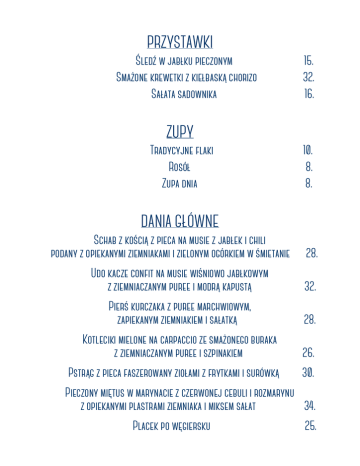 PRZYSTAWKI Śledź w jabłku pieczonym Smażone krewetki z kiełbaską chorizo Sałata sadownika 15. 32. 16. ZUPY Tradycyjne flaki Rosół Zupa dnia 10. 8. 8. DANIA GŁÓWNE Schab z kością z pieca na musie z jabłek i chili podany z opiekanymi ziemniakami i zielonym ogórkiem w śmietanie Udo kacze confit na musie wiśniowo jabłkowym z ziemniaczanym puree i modrą kapustą Pierś kurczaka z puree marchwiowym, zapiekanym ziemniakiem i sałatką Kotleciki mielone na carpaccio ze smażonego buraka z ziemniaczanym puree i szpinakiem Pstrąg z pieca faszerowany ziołami z frytkami i surówką Pieczony miętus w marynacie z czerwonej cebuli i rozmarynu z opiekanymi plastrami ziemniaka i miksem sałat Placek po węgiersku 28. 32. 28. 26. 30. 34. 25. DANIA DLA DZIECI Nugetsy z frytkami i ketchupem 14. Naleśniki z nutellą 15. Naleśniki z owocami 15. DODATKI Frytki 5. Opiekane ziemniaki 5. Surówka 5. Miks sałat 5. DESERY Bella Mallina 15. Szarlotka na ciepło z lodami 12. Deser dnia 8. Deser lodowy 8. ZIMNE NAPOJE Sok jabłkowy Sok pomarańczowy Sok multiwitamina Sok porzeczkowy Sok pomidowowy Tymbark Mango Tymbark Żurawina Lemoniada Herbata mrożona Kawa mrożona Woda niegazowana Woda gazowana Cola/Fanta/Sprite Tiger 5. 5. 5. 5. 5. 6. 6. 10. 10. 10. 4. 4. 5. 6. Dzbanek soku wieloowocowego Dzbanek soku jabłkowego Dzbanek lemoniady Dzbanek wody niegazowanej 10. 10. 20. 8. CIEPŁE NAPOJE Kawa espresso 6. Kawa americano 7. Kawa latte 8. Kawa latte smakowa -czekolada, orzech, kokos 10. Irish coffee 15. Cappucino 8. Herbata czarna 5. Herbata owocowa 5. Herbata zielona 5. Gorąca czekolada z piankami 10. Coś na rozgrzanie Grzane piwo 10. Grzane wino 10.