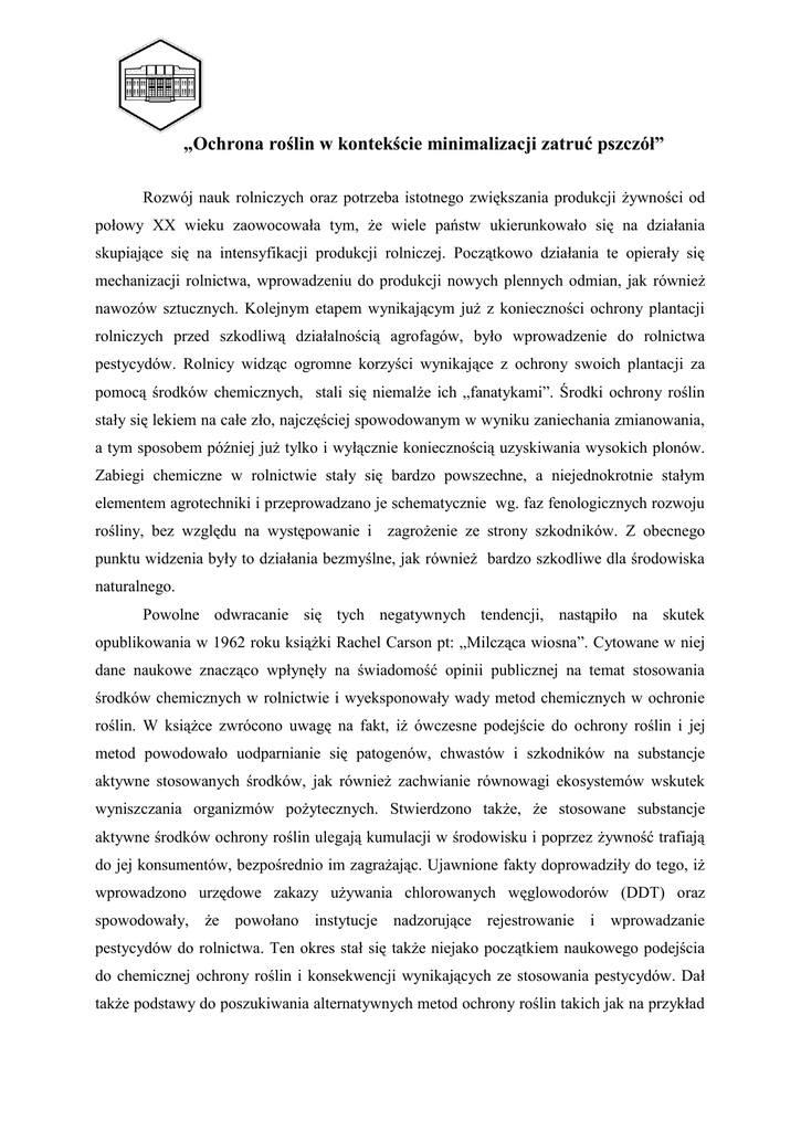 „Ochrona roślin w kontekście minimalizacji zatruć pszczół” Rozwój nauk rolniczych oraz potrzeba istotnego zwiększania produkcji żywności od połowy XX wieku zaowocowała tym, że wiele państw ukierunkowało się na działania skupiające się na intensyfikacji produkcji rolniczej. Początkowo działania te opierały się mechanizacji rolnictwa, wprowadzeniu do produkcji nowych plennych odmian, jak również nawozów sztucznych. Kolejnym etapem wynikającym już z konieczności ochrony plantacji rolniczych przed szkodliwą działalnością agrofagów, było wprowadzenie do rolnictwa pestycydów. Rolnicy widząc ogromne korzyści wynikające z ochrony swoich plantacji za pomocą środków chemicznych, stali się niemalże ich „fanatykami”. Środki ochrony roślin stały się lekiem na całe zło, najczęściej spowodowanym w wyniku zaniechania zmianowania, a tym sposobem później już tylko i wyłącznie koniecznością uzyskiwania wysokich plonów. Zabiegi chemiczne w rolnictwie stały się bardzo powszechne, a niejednokrotnie stałym elementem agrotechniki i przeprowadzano je schematycznie wg. faz fenologicznych rozwoju rośliny, bez względu na występowanie i zagrożenie ze strony szkodników. Z obecnego punktu widzenia były to działania bezmyślne, jak również bardzo szkodliwe dla środowiska naturalnego. Powolne odwracanie się tych negatywnych tendencji, nastąpiło na skutek opublikowania w 1962 roku książki Rachel Carson pt: „Milcząca wiosna”. Cytowane w niej dane naukowe znacząco wpłynęły na świadomość opinii publicznej na temat stosowania środków chemicznych w rolnictwie i wyeksponowały wady metod chemicznych w ochronie roślin. W książce zwrócono uwagę na fakt, iż ówczesne podejście do ochrony roślin i jej metod powodowało uodparnianie się patogenów, chwastów i szkodników na substancje aktywne stosowanych środków, jak również zachwianie równowagi ekosystemów wskutek wyniszczania organizmów pożytecznych. Stwierdzono także, że stosowane substancje aktywne środków ochrony roślin ulegają kumulacji w środowisku i poprzez żywność trafiają do jej konsumentów, bezpośrednio im zagrażając. Ujawnione fakty doprowadziły do tego, iż wprowadzono urzędowe zakazy używania chlorowanych węglowodorów (DDT) oraz spowodowały, że powołano instytucje nadzorujące rejestrowanie i wprowadzanie pestycydów do rolnictwa. Ten okres stał się także niejako początkiem naukowego podejścia do chemicznej ochrony roślin i konsekwencji wynikających ze stosowania pestycydów. Dał także podstawy do poszukiwania alternatywnych metod ochrony roślin takich jak na przykład metody biologiczne, integrowana czy ekologiczna produkcja żywności. Spośród tych metod na największą uwagę zasługuje integrowana produkcja. Podstawą jej systemu są prawidłowo dobrane elementy: poprawny płodozmian i agrotechnika, racjonalne nawożenie w oparciu o rzeczywiste zapotrzebowanie roślin oraz stosowanie ochrony chemicznej z zastosowaniem środków dopuszczonych dla metod integrowanych tylko w sytuacjach uzasadnionych przekroczeniem progów szkodliwości lub na podstawie sygnalizacji. Integrowana produkcja uwzględnia cele ekologiczne, takie jak: ochrona środowiska naturalnego, a także dba o zdrowie producentów i konsumentów. Pomimo tego, że prace związane z minimalizacją wykorzystywania pestycydów i poszukiwaniem nowych metod ochrony roślin w rolnictwie są znacznie bardziej zawansowane w stosunku do lat minionych, to niemożliwa jest całkowita rezygnacja z ich stosowania, bowiem jak podają różne źródła naukowe pozwalają one na zwiększenie wysokości plonów roślin o 25 do 30%, a w przypadku niektórych upraw nawet o 50% do 80%. Producenci środków ochrony roślin zrobili milowy krok w kierunku poprawiania ich bezpieczeństwa dla środowiska, decydującymi czynnikami były tu: selektywność w stosunku do organizmów pożytecznych, względnie najkrótszy okres detoksykacji substancji aktywnej, brak kumulacji w środowisku. Początkowo stosowane insektycydy oparte na związkach nieorganicznych (arsenian ołowiu, arsenian wapnia, związki fluorowe) określane jako insektycydy I generacji mają już dziś znaczenie historyczne. Od 1946 roku rozpoczęto stosowanie insektycydów fosfoorganicznych (ich udział nadal jest bardzo liczny), a następnie wprowadzano kolejne środki II generacji w rodzaju karbaminianów i pyretroidów. W latach 70 – tych pojawiły się insektycydy III generacji: analogi hormonów, inhibitory biosyntezy chityny, feromony i atraktanty (substancje zwabiające). IV - tą generację stanowią antyhormony, które jak na razie znajdują względnie małe zastosowanie. Prawidłowo zastosowane insektycydy nie powinny powodować zatruć pszczół. Jednak mimo takiego stanu rzeczy do podtruć lub zatruć rodzin pszczelich w Polsce dochodzi bardzo często. Powodowane jest to przede wszystkim brakiem świadomości o skutkach ich nieprawidłowego stosowania a w konsekwencji lekceważeniem przepisów przez osoby stosujące pestycydy. Brak należytej wiedzy obraca się także przeciwko producentom rolnym. Eliminuje znaczenie pszczoły jako nieodzowny i najtańszy czynnik warunkujący wysoki plon roślin entomofilnych. Z tych powodów obok ochrony roślin, ochrona pszczół powinna być jednym z naczelnych celów rolników i ogrodników. Pestycydy stosowane w rolnictwie Najogólniej pestycydy można określić jako związki chemiczne pochodzenia naturalnego (roślinne) i syntetycznego (sztuczne), stosowane do niszczenia szkodników roślin, zwalczania ich chorób, regulacji wzrostu jak również regulowania zachwaszczenia plantacji roślin uprawnych. Środki ochrony roślin powinny się charakteryzować przede wszystkim następującymi właściwościami: selektywną toksycznością (tylko w stosunku do agrofagów), krótką trwałością w środowisku i nie ulegać kumulacji w roślinach. Wykaz środków ochr