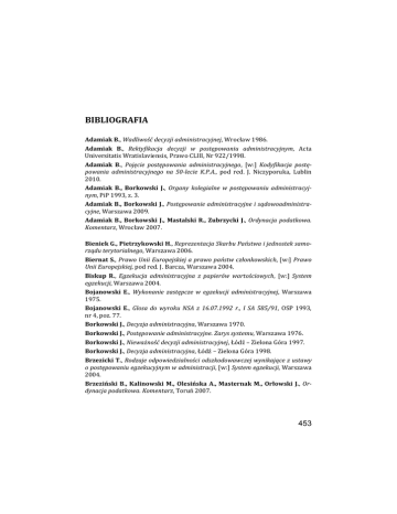 BIBLIOGRAFIA Adamiak B., Wadliwość decyzji administracyjnej, Wrocław 1986. Adamiak B., Rektyfikacja decyzji w postępowaniu administracyjnym, Acta Universitatis Wratislaviensis, Prawo CLIII, Nr 922/1998. Adamiak B., Pojęcie postępowania administracyjnego, [w:] Kodyfikacja postępowania administracyjnego na 50-lecie K.P.A., pod red. J. Niczyporuka, Lublin 2010. Adamiak B., Borkowski J., Organy kolegialne w postępowaniu administracyjnym, PiP 1993, z. 3. Adamiak B., Borkowski J., Postępowanie administracyjne i sądowoadministracyjne, Warszawa 2009. Adamiak B., Borkowski J., Mastalski R., Zubrzycki J., Ordynacja podatkowa. Komentarz, Wrocław 2007. Bieniek G., Pietrzykowski H., Reprezentacja Skarbu Państwa i jednostek samorządu terytorialnego, Warszawa 2006. Biernat S., Prawo Unii Europejskiej a prawo państw członkowskich, [w:] Prawo Unii Europejskiej, pod red. J. Barcza, Warszawa 2004. Biskup R., Egzekucja administracyjna z papierów wartościowych, [w:] System egzekucji, Warszawa 2004. Bojanowski E., Wykonanie zastępcze w egzekucji administracyjnej, Warszawa 1975. Bojanowski E., Glosa do wyroku NSA z 16.07.1992 r., I SA 585/91, OSP 1993, nr 4, poz. 77. Borkowski J., Decyzja administracyjna, Warszawa 1970. Borkowski J., Postępowanie administracyjne. Zarys systemu, Warszawa 1976. Borkowski J., Nieważność decyzji administracyjnej, Łódź – Zielona Góra 1997. Borkowski J., Decyzja administracyjna, Łódź – Zielona Góra 1998. Brzezicki T., Rodzaje odpowiedzialności odszkodowawczej wynikające z ustawy o postępowaniu egzekucyjnym w administracji, [w:] System egzekucji, Warszawa 2004. Brzeziński B., Kalinowski M., Olesińska A., Masternak M., Orłowski J., Ordynacja podatkowa. Komentarz, Toruń 2007. 453 Bibliografia Celińska-Grzegorczyk K., Postępowanie patentowe jako szczególne postępowanie administracyjne, Warszawa 2009. Celińska-Grzegorczyk K., Hauser R., Sawczyn W., Skoczylas A., Postępowanie administracyjne, sądowoadministracyjne i egzekucyjne, Warszawa 2009. Cieślik Z., Umowa administracyjna w państwie prawa, Kraków 2004. Cholewa-Klimek M., Postępowanie sądowe w sprawach z zakresu ubezpieczeń społecznych, Warszawa 2006. Chorąży K., Wróbel A., Żukowski L., Postępowanie administracyjne, postępowanie przed Naczelnym Sądem Administracyjnym oraz postępowanie egzekucyjne w administracji, Lublin – Rzeszów 1995. Chróścielewski W., Akt administracyjny generalny, Łódź 1994. Chróścielewski W., Nowelizacja artykułu 126 K.p.a. a nadzwyczajne tryby postępowania administracyjnego, PiP 1996, z. 2. Chróścielewski W., Organy wyższego stopnia w stosunku do organów samorządu terytorialnego według K.p.a., PiP 1999, z. 6. Chróścielewski W., Postępowanie podatkowe w świetle Ordynacji podatkowej, Warszawa 2000. Chróścielewski W., Organ administracji publicznej w postępowaniu administracyjnym, Warszawa 2002. Chróścielewski W., Przepisy postępowania administracyjnego ogólnego i postępowania podatkowego a standardy nowoczesnego postępowania podatkowego, [w:] Pozycja samorządowych kolegiów odwoławczych w postępowaniu administracyjnym, pod red. Cz. Martysza i A. Matana, Kraków 2005. Chróścielewski W., W sprawie projektu nowelizacji przepisów k.p.a. dotyczących postępowania administracyjnego ogólnego opracowanego w Ministerstwie Spraw Wewnętrznych i Administracji w 2009 r., [w:] Instytucje procesu administracyjnego i sądowo administracyjnego. Księga jubileuszowa dedykowana Profesorowi Ludwikowi Żukowskiemu, Przemyśl–Rzeszów 2009. Chróścielewski W., Tarno J. P., Postępowanie administracyjne. Kompendium dla urzędników i studentów administracji, Zielona Góra 1999. Chróścielewski W., Tarno J. P., Postępowanie administracyjne. Zagadnienia podstawowe, Warszawa 2006. Chróścielewski W., Tarno J. P., Postępowanie administracyjne i postępowanie przed sądami administracyjnymi, Warszawa 2011. Cudak A., Podmioty legitymowane do wniesienia zarzutów w sprawie prowadzenia egzekucji administracyjnej, ZNSA 2009, nr 4. Cybulska R., Jagoda J., Egzekucja administracyjna z udziału w spółce z ograniczoną odpowiedzialnością, [w:] System egzekucji, Warszawa 2004. 454 Bibliografia Czarnik Z., Egzekucja administracyjna obowiązku wydania nieruchomości lub opróżnienia lokalu, [w:] System egzekucji, Warszawa 2004. Czarnik Z., Udział organizacji społecznej w postępowaniu administracyjnym i podatkowym (zarys problematyki), [w:] Prawna działalność instytucji społeczeństwa obywatelskiego, pod red. J. Blicharz i J. Bocia, Wrocław 2009. Czeszejko-Sochacki Z., Prawo do sądu w świetle Konstytucji RP (ogólna charakterystyka), PiP 1999, z. 11–12. Czerwiński W., Udział prokuratora w postępowaniu administracyjnym, Toruń 2009. Dawidowicz W., Wstęp do nauk prawno-administracyjnych, Warszawa 1974. Dawidowicz W., Ugoda w postępowaniu administracyjnym, PiP 1980, z. 3. Dawidowicz W., Postępowanie administracyjne. Zarys wykładu, Warszawa 1983. Dawidowicz W., Z problematyki decyzji organów administracji państwowej w świetle orzecznictwa NSA, PiP 1984, z. 10. Dawidowicz W., Zarys procesu administracyjnego, Warszawa 1989. Dawidowicz W., Zagadnienie „osoby interesowanej” we współczesnym polskim postępowaniu administracyjnym, [w:] Prawo. Administracja. Gospodarka. Księga ku czci Profesora Ludwika Bara, Warszawa–Kraków–Gdańsk–Łódź 1993. Dąbek D., Zażalenie w egzekucji administracyjnej, [w:] System egzekucji, Warszawa 2004. Dąbrowska I., Kube J., Zasada państwa prawnego w praktyce orzeczniczej Naczelnego Sądu Administracyjnego, Helsińska Fundacja Praw Człowieka, Warszawa 1997. Dąbrowski W. F., Procedura wznowienia postępowania administracyjnego, RPEiS 1965, nr 3. Defecińska K., Spory o właściwość organu administracji publicznej, Warszawa 2000. Defecińska-Tomczak K., Kmieciak Z., Polski model egzekucji administracyjnej, [w:] System egzekucji, Warszawa 2004. Dembrzyńska J., Pietrasz P., Sobiera