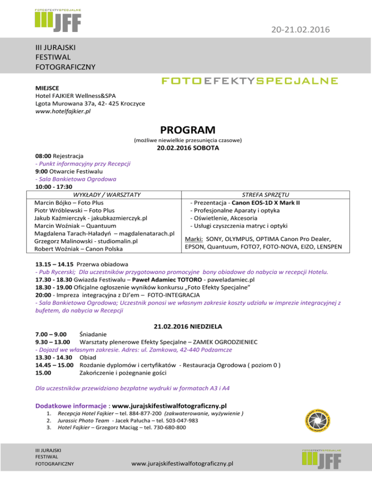 20-21.02.2016 III JURAJSKI FESTIWAL FOTOGRAFICZNY MIEJSCE Hotel FAJKIER Wellness&SPA Lgota Murowana 37a, 42- 425 Kroczyce www.hotelfajkier.pl PROGRAM (możliwe niewielkie przesunięcia czasowe) 20.02.2016 SOBOTA 08:00 Rejestracja - Punkt informacyjny przy Recepcji 9:00 Otwarcie Festiwalu - Sala Bankietowa Ogrodowa 10:00 - 17:30 WYKŁADY / WARSZTATY Marcin Bójko – Foto Plus Piotr Wróblewski – Foto Plus Jakub Kaźmierczyk - jakubkazmierczyk.pl Marcin Woźniak – Quantuum Magdalena Tarach-Haładyń – magdalenatarach.pl Grzegorz Malinowski - studiomalin.pl Robert Woźniak – Canon Polska STREFA SPRZĘTU - Prezentacja - Canon EOS-1D X Mark II - Profesjonalne Aparaty i optyka - Oświetlenie, Akcesoria - Usługi czyszczenia matryc i optyki Marki: SONY, OLYMPUS, OPTIMA Canon Pro Dealer, EPSON, Quantuum, FOTO7, FOTO-NOVA, EIZO, LENSPEN 13.15 – 14.15 Przerwa obiadowa - Pub Rycerski; Dla uczestników przygotowano promocyjne bony obiadowe do nabycia w recepcji Hotelu. 17.30 - 18.30 Gwiazda Festiwalu – Paweł Adamiec TOTORO - paweladamiec.pl 18.30 - 19.00 Oficjalne ogłoszenie wyników konkursu „Foto Efekty Specjalne” 20:00 - Impreza integracyjna z DJ’em – FOTO-INTEGRACJA - Sala Bankietowa Ogrodowa; Uczestnik ponosi we własnym zakresie koszty udziału w imprezie integracyjnej z bufetem, do nabycia w Recepcji 21.02.2016 NIEDZIELA 7.00 – 9.00 Śniadanie 9.30 – 13.00 Warsztaty plenerowe Efekty Specjalne – ZAMEK OGRODZIENIEC - Dojazd we własnym zakresie. Adres: ul. Zamkowa, 42-440 Podzamcze 13.30 - 14.30 Obiad 14.45 – 15.00 Rozdanie dyplomów i certyfikatów - Restauracja Ogrodowa ( poziom 0 ) 15.00 Zakończenie i pożegnanie gości Dla uczestników przewidziano bezpłatne wydruki w formatach A3 i A4 Dodatkowe informacje : www.jurajskifestiwalfotograficzny.pl 1. 2. 3. Recepcja Hotel Fajkier – tel. 884-877-200 (zakwaterowanie, wyżywienie ) Jurassic Photo Team - Jacek Pałucha – tel. 503-047-983 Hotel Fajkier – Grzegorz Maciąg – tel. 730-680-800 III JURAJSKI FESTIWAL FOTOGRAFICZNY www.jurajskifestiwalfotograficzny.pl