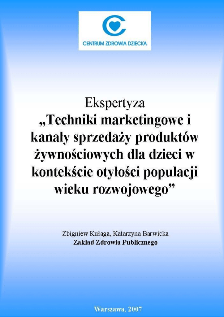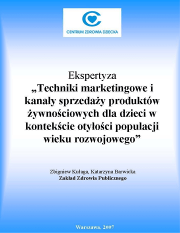 Ekspertyza Techniki marketingowe i kanały sprzedaży produktów żywnościowych dla dzieci w kontekście otyłości populacji wieku rozwojowego Motto Omnia sunt venena, nihil est sine veneno. Sola dosis facit venenum. (Wszystko jest trucizną i nic nie jest trucizną, bo tylko dawka czyni truciznę) Paracelsus (1493-1541) Zakład Zdrowia Publicznego IPCZD, Warszawa, 2007 2 Ekspertyza Techniki marketingowe i kanały sprzedaży produktów żywnościowych dla dzieci w kontekście otyłości populacji wieku rozwojowego Spis treści Spis treści ................................................................................................................................... 3 Streszczenie................................................................................................................................ 4 Lista skrótów .............................................................................................................................. 5 1. Wstęp...................................................................................................................................... 6 2. Zakres tematyczny ekspertyzy. .............................................................................................. 7 3. Metodyka ekspertyzy. ............................................................................................................ 7 4. Wyniki.................................................................................................................................... 8 4.1. Polskie dane o nasileniu nadwagi i otyłości w populacji dzieci i młodzieży...................... 8 4.2. Analiza związku przyczynowo-skutkowego nadwagi i otyłości dzieci i młodzieży z reklamami i innego rodzaju promocją produktów żywnościowych......................................... 13 4.3. Zastosowanie kryteriów związku przyczynowo-skutkowego wg Bradford Hill’a do oceny zależności przyczynowej między reklamą produktów żywnościowych a występowaniem nadwagi i otyłości u dzieci i młodzieży. .................................................................................. 20 4.4. Analiza technik marketingowych ukierunkowanych na dzieci i młodzież, jako odbiorcę promocji produktów żywnościowych oraz kanałów komunikacji na podstawie literatury fachowej tematu oraz obserwacji własnych. ............................................................................ 28 4.4.1. Marketing ....................................................................................................................... 28 4.4.2. Reklama jako jedno z narzędzi komunikacji marketingowej......................................... 29 4.4.3. Wymiar ekonomiczny .................................................................................................... 33 4.4.4. Główni gracze rynku reklamowego ............................................................................... 34 4.4.5. Dziecko i młodzież jako adresaci i odbiorcy reklamy ................................................... 35 4.4.6. Sprzedaż wysokokalorycznych produktów żywnościowych i żywności o niskiej wartości odżywczej .................................................................................................................. 35 4.4.7. Promocja żywności w telewizji...................................................................................... 38 4.4.8. Internet jako ogniwo łączące i uzupełniające kampanie marketingowe oraz reklamy .. 38 4.4.9. Studia najskuteczniejszych kampanii reklamowych produktów żywnościowych (na podstawie materiałów konkursowych Effie Awards 2004 - 2006) .......................................... 43 5. Wnioski/Omówienie............................................................................................................. 46 6. Proponowane regulacje prawne ........................................................................................... 48 7. Podziękowanie ..................................................................................................................... 50 8. Piśmiennictwo ...................................................................................................................... 51 Zakład Zdrowia Publicznego IPCZD, Warszawa, 2007 3 Ekspertyza Techniki marketingowe i kanały sprzedaży produktów żywnościowych dla dzieci w kontekście otyłości populacji wieku rozwojowego Streszczenie Nadwaga i otyłość dzieci i młodzieży rosną alarmująco w ostatnich latach w Polsce. Występowanie nadwagi i otyłości populacji dzieci i młodzieży warszawskiej osiągnęło poziom 20%, a rejestrowane trendy są niekorzystne – zjawisko będzie dalej narastać. Nadwaga i otyłość dzieci i młodzieży są niekorzystne ze zdrowotnego punktu widzenia. U dzieci z nadwagą ryzyko nadwagi w wieku dorosłym jest podwyższone wraz ze wszystkim konsekwencjami: anatomicznymi, fizjologicznymi, metabolicznymi, patologicznymi tego stanu. Modyfikowalnymi czynnikami warunkującymi prawidłową masę ciała są styl życia i środowisko życia. W związku z transformacją ustrojową ostatnich dwudziestu lat w Polsce nastąpiły znaczące zmiany w środowisku i stylu życia. Zmiany te są w wielu aspektach korzystne, ale tak jak zawsze czynnik korzystny ma również działania niekorzystne (niepożądane). W związku z wprowadzeniem gospodarki wolnorynkowej (jej elementów) pojawiły się nowe, wcześniej nie znane zagrożenia. Jednym z nich okazuje się promocja produktów żywnościowych prowadząca do nadmiernej konsumpcji. Nadmierna konsumpcja (nie wynikająca z fizjologicznych potrzeb), w przypadku żywności jest szkodliwa. W wielu badaniach przeprowadzonych w krajach Europy, Ameryki Północnej, Australii i in. wykazano wpływ promocji żywności na zwiększoną konsumpcję i skutki zdrowotne w postaci nadwagi i otyłości. Najlepiej udokumentowane jest oddziaływanie telewizji jako nośnika reklam (żywności). Związek