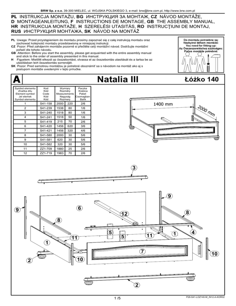 BRW Sp. z o.o. 39-300 MIELEC, ul. WOJSKA POLSKIEGO 3, e-mail: [email protected], http://www.brw.com.pl PL INSTRUKCJA MONTAÝU, BG ÈÍÑÒÐÓÊÖÈß ÇÀ ÌÎÍÒÀÆ, CZ NÁVOD MONTÁŽE, D MONTAGEANLEITUNG, F INSTRUCTIONS DE MONTAGE, GB THE ASSEMBLY MANUAL, HR INSTRUKCIJA MONTAŽE, H SZERELÉSI UTASITÁS, RO INSTRUCÞIUNI DE MONTAJ, RUS ÈÍÑÒÐÓÊÖÈß ÌÎÍÒÀÆA, SK NÁVOD NA MONTÁŽ PL Uwaga: Przed przyst¹pieniem do monta¿u prosimy zapoznaã siê z caù¹ instrukcj¹ monta¿u oraz zachowaã kolejnoœã monta¿u przedstawion¹ w niniejszej instrukcji. CZ Pozor: Pøed zahájením montáže pozornì si pøeètìte celý montážní návod. Dodržujte montážní poøadí dle tohoto návodu. GB Attention: Before you start the assembly, please get acquainted with the entire assembly manual and stick to the order of assembly presented in this manual. H Figyelem: Mielõttt elkezdi az összebontást, olvassa el az összebontás utasitását és a tartsa be az utasitásban leirt összebontás sorrendjét. SK Pozor: Pred samotnou montážou je potrebné oboznámi• sa s návodom na montáž ako aj s postupom montáže uvedenými v tejto príruèke. Natalia III A Symbol elementu Znaèka dílu Element symbol Jel elemek Symbol elementu Kod Kód Code Kód Kód 1 S41-158 2000 220 2/6 2 S41-239 1538 80 1/6 3 S41-240 1518 80 1/6 4 S41-241 1518 50 1/6 5 S41-419 215 70 2/6 6 S41-420 1456 620 3/6 7 S41-421 1456 320 4/6 8 S41-580 2000 30 5/6 9 S41-581 620 30 5/6 10 S41-582 320 30 5/6 11 ZZ1-709 1880 25 2/6 12 ZZ1-719 1983 70 2/6 £ó¿ko 140 Wymiary Paczka Rozmìry Krabica Measurements Paket Nagyság Csomagban Rozmery Balík 1400 mm 20 00 mm 3 9 6 9 8 12 8 5 11 5 11 1 4 1 7 2 10 10 2 1 /5 P28-S41-LOZ140-M_IN12-A-KOR02 §1 PL Poni¿ej przedstawiono symbole i iloœci akcesoriów, które bêd¹ potrzebne podczas monta¿u. Akcesoria spakowane s¹ w paczce akcesoria. CZ Níže jsou uvedeny symboly a poèet jednotlivých spojovacích dílù, které budou nezbytné bìhem montáže. Díly jsou zabaleny v krabici s oznaèením „pøíslušenství“ GB The symbols and the amount of accessories needed for the assembly have been presented below. The accessories can be found in the "Accessories" package. H Lent az összebontéshoz szükséges tartózékok jeleit és mennyiségét soroltunk. Az tartózékok az „tartózékok” csomágokba vannak becsomagolva. SK Nižšie sú uvedené symboly a množstvo dielov, ktoré budú poèas montáže potrebné. Diely sú zabalené v balíku. 4x 4x 2x 2x 16x 12x 1x 1x 32x 8x 2x 16x 24x 4x 12x 6x 12x 16x PL Ogólne zasady monta¿u mebla, CZ Obecné zásady montáže nábytku, GB General instructions for furniture assembly H A bútor általános szerelési alapelvei, SK Všeobecné pravidla montáže nábytku Uwaga/Pozor/Attention/Figyelem/Pozor PL Uwaga: 1. Podczas monta¿u elementy nale¿y ukùadaã na miêkkim i czystym podùo¿u np.: rêcznik, koc. Nie montowaã mebla na dywanie, wykùadzinie itp. 2. W otwory o œrednicy 8 mm znajduj¹ce siê w krawêdziach elementów wbiã koùki f1.(Otwory na trzpieñ zù¹cza mimoœrodowego pozostawiã wolne). W przypadku stwierdzenia, ¿e któryœ z koùków wystaje z otworu na dùugoœã wiêksz¹ ni¿ 10 mm, nale¿y go dobiã, wymieniã lub skróciã, gdy¿ mo¿e on spowodowaã, przy skùadaniu, uszkodzenie boku. INFORMACJA! Szanowny Kliencie, w przypadku zgùaszania reklamacji, prosimy posùugiwaã siê numerem kodu podanym na pierwszej stronie instrukcji monta¿u. Wszelkie uwagi i reklamacje nale¿y zgùaszaã do punktu zakupu mebla. Uwaga! Nie montowaã elementów, je¿eli zostan¹ zauwa¿one wady lub uszkodzenia tych elementów. CZ Pozor: 1. Bìhem provádìní montáže díly vždy odkládejte na mìkký a èistý povrch jako napø.: ruèník,deka. Nábytek nemontujte na koberci, podlahové krytinì apod. 2. Do otvorù o prùmìru 8 mm na hranách jednotlivých dílù umístìte kolíky f1. (Otvory pro kolíky spojù r16 ponechte prázdné). Pozor: V pøípadì zjištìní, že nìkteré kolíky vyènívají z otvoru více než 10 mm, dorazte je, vymìòte nebo zkra•te, protože mohou zpùsobit poškození boèních stran. INFORMACE! Vážený zákazníku, v pøípadì uplatòování reklamace je nutno použít èíslo kódu, který se nachází v montážním návodu. Veškeré pøipomínky a reklamace je tøeba uplatòovat v místì prodeje. Pozor! Nábytkové díly nemontovat, pokud na nich byly zjištìny vady nebo poškození. GB Attention: 1. During the assembly, the elements should be put on a soft and clean surface, e.g. a towel or a blanket. Do not assemble the piece on a carpet or floor covering, etc. 2. Drive f1 pegs into the holes (8 mm in diameter) located along the edges of each element (leave the holes for the eccentric connector pivot free). Attention: In case a peg in one of the holes protrudes more than 10 mm, it should be hammered down, exchanged or shortened because it may cause damage to the side of the piece of furniture during its assembly. INFORMATION! Dear client, in case of complaining, please use the code number given in the assembly instruction. Any comments and complaints should be reported at the furniture purchase outlet. Note! Do not use any parts showing any faults or marks of damage. H Figyelem: 1. Összeszerelés elõtt az elemeket tisztán és puhán kell elhelyezni, pd. pléd, törülközõ. Ne szereljen szõnyegen és hozzá hasonló felületeken. 2. Az elemek élein 8 mm-es lyukakba f1 szögeket kell beütni (a körhagyó kapcsolat tengelyére szánt lyukakat szabadon kell hagyni) ha észrevesszük hogy valamelyik szög kiáll a bútorból több mint 10 mm, akkor beljebb verni, ki kell cserélni, vagy le kell rövidíteni, mert az összeszerelés alatt megsérülhet a butor. INFORMÁCIÓ! Tisztelt vásárló! Reklamáció esetén kérjük hivatkozni a szerelési utasításban magadott kódra.Mindennemû észrevételt és reklamációt a bútor vásárlási helyén kell megt