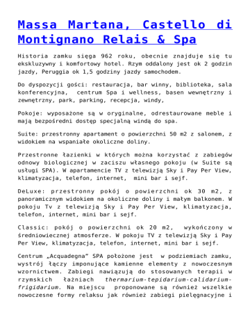Massa Martana, Castello di Montignano Relais & Spa Historia zamku sięga 962 roku, obecnie znajduje się tu ekskluzywny i komfortowy hotel. Rzym oddalony jest ok 2 godzin jazdy, Peruggia ok 1,5 godziny jazdy samochodem. Do dyspozycji gości: restauracja, bar winny, biblioteka, sala konferencyjna, centrum Spa i wellness, basen wewnętrzny i zewnętrzny, park, parking, recepcja, windy, Pokoje: wyposażone są w oryginalne, odrestaurowane meble i mają bezpośredni dostęp specjalną windą do spa. Suite: przestronny apartament o powierzchni 50 m2 z salonem, z widokiem na wspaniałe okoliczne doliny. Przestronne łazienki w których można korzystać z zabiegów odnowy biologicznej w zaciszu własnego pokoju (w Suite są usługi SPA). W apartamencie TV z telewizją Sky i Pay Per View, klimatyzacja, telefon, internet, mini bar i sejf. DeLuxe: przestronny pokój o powierzchni ok 30 m2, z panoramicznym widokiem na okoliczne doliny i małym balkonem. W pokoju Tv z telewizją Sky i Pay Per View, klimatyzacja, telefon, internet, mini bar i sejf. Classic: pokój o powierzchni ok 20 m2, wykończony w średniowiecznej atmosferze. W pokoju TV z telewizją Sky i Pay Per View, klimatyzacja, telefon, internet, mini bar i sejf. Centrum „Acquadegna” SPA położone jest w podziemiach zamku, wystrój łączy imponujące kamienne elementy z nowoczesnym wzornictwem. Zabiegi nawiązują do stosowanych terapii w rzymskich łażniach thermarium-tepidarium-calidariumfrigidarium. Na miejscu proponowane są również wszelkie nowoczesne formy relaksu jak również zabiegi pielęgnacyjne i rytuały spa. Wybrzeże Adriatyckie Popularny region wypoczynkowy ciągnie się od miasta portowego Triest aż po Brindisi, na południu kraju. Największą zaletą regionu są długie, piaszczyste plaże, z łagodnym wejściem do morza oraz bliskie sąsiedztwo słynnych, włoskich miast, jak Wenecja, Padwa, Werona. Najbardziej popularne miejscowości wypoczynkowe, to m.in.: Rosolina Mare, Lido Degli Estensi, Rimini, Cesenatico, Riccione, Cattolica. Liczne parki rozrywki oferują wiele atrakcji dla dzieci i dorosłych. Tradycyjna kuchnia jest zróżnicowana i raczej kaloryczna. Popularne dania to: Erbazzone (placek ze szpinakiem), pisarei e faso (pierożki z fasolą), tortelloni, agnolotti i wszelkiego rodzaju domowe makarony z pysznymi sosami i nadzieniami, szynka parmeńska, mortadela z Bolonii i wiele innych pysznych dań. Wino z tego regionu to: Gutturnio, produkowane na wzgórzach Piacenza, Trebbiano, Lambrusco, Barbera, Sauvignon i Sangiovese. DOJAZD Najpopularniejszym środkiem transportu jest samochód. Dla osób chcących dotrzeć szybciej proponujemy przelot – po szczegóły prosimy o kontakt z naszym biurem. Rimini Miasto położone nad morzem Adriatyckim, najbardziej znany kurort w tym regionie. Słońce, plaża, liczne lokale, centra rozrywki, parki wodne przyciągają licznych turystów. Ma również swoją starożytna historię, po której pozostały liczne pamiątki. Cesenatico Małe, urocze miasteczko, położone na wybrzeżu Adriatyckim. Wybrzeże rozciąga się na 7 km, a linia brzegowa jest szeroka od 100 do 200 metrów. Piasek jest złoty , delikatny i jednorodny. Dno jest miękkie, bez dziur lub prądów, łagodnie nachylone, co jest idealny miejscem na wypoczynek z dziećmi. Liczne atrakcje na plaży sprzyjają aktywnemu wypoczynkowi. Cesenatico, Residence Hotel Alexia Palace**** Apartamenty znajdują się w spokojnej części miasta, ok. 400 metrów od plaży, oraz 1 km od centrum, w którym jest dużo wszelkiego rodzaju sklepów, barów, lodziarni i kawiarni. Luksusowy budynek wyposażony jest we wszystkie udogodnienia: klimatyzację, ogrzewanie, garaż, łaźnię turecką, bar, fitness, basen, salę konferencyjną, czytelnię, salę TV, basen, saunę, centrum odnowy biologicznej. Bilocale 4 os: sypialnia dwuosobowa z podwójnym łóżkiem lub dwoma pojedynczymi łóżkami, pokój dzienny z rozkładaną, dwuosobową kanapą, aneks kuchenny, łazienka z prysznicem. 04/01 – 29/03 27/09 – 27/12 29/03 – 24/05 13/09 – 27/09 24/05/ – 21/06 21/06 – 02/08 02/08 – 23/08 23/08 – 13/09 2649 2885 3056 3663,5 4956 3663,5 Cena w PLN obejmuje: wynajęcie apartamentu na tydzień, opłatę za wodę, prąd i gaz, końcowe sprzątanie (aneks kuchenny sprząta klient), pościel i ręczniki, korzystanie z klimatyzacji, basenu, 1 miejsce parkingowe Cena nie obejmuje: taksy klimatycznej (płatnej na miejscu). Dodatkowe sprzątanie 40 Euro. Wi Fi 5 Euro/godz. Kaucja zwrotna 150 Euro. Uwaga: basen czynny od 15/06 do 15/09. Wyjazd i przyjazd: sobota. Lido Adriano, Belvedere Residence Apartamenty usytuowane są w blokach mieszkalnych, bezpośrednio przy plaży, 13 km od Rawenny. W miejscowości znajduje się centrum handlowe z wieloma atrakcjami. Basen dla dorosłych, drugi dla dzieci, parking. Trilocale 6 os: sypialnia z podwójnym łóżkiem, pokój z dwoma pojedynczymi łóżkami lub łóżkiem piętrowym, pokój dzienny z rozkładaną, dwuosobową kanapą, aneks kuchenny, łazienka z prysznicem, balkon. 03/05-31/05 21/06-28/06 28/06-26/07 31/05-21/06 16/08-30/08 30/08-20/09 26/07-02/08 02/08-16/08 1385 2070 2761 3522 2832 Cena w PLN obejmuje: wynajęcie apartamentu na tydzień, opłatę za wodę, prąd i gaz, korzystanie z basenu, Cena nie obejmuje: końcowe sprzątanie 45 Euro (klient zobowiązany jest do sprzątnięcia kuchni, w przypadku nie sprzątnięcia będzie pobrana opłata 45 Euro). Pościel 15 Euro/zmiana-musi być zgłoszone podczas rezerwacji. Taksa klimatyczna (płatna na miejscu). Kaucja zwrotna 70 Euro. Uwaga: basen czynny od 15/06 do 15/09. Przyjazd i wyjazd: sobota. Lido degli Scacchi, Residence Granchio Położone w nowoczesnym kurorcie, na Lido Comacchio, które obejmuje całe wybrzeże prowincji Ferrara. 27 kilometrów piaszczystych plaż, najszerszych nad Adriatykiem. Apartamenty znajdują się bezpośrednio przy piaszczystej plaży. Bilocale 4 os: pokój dzienny z rozkładaną, dwuoso