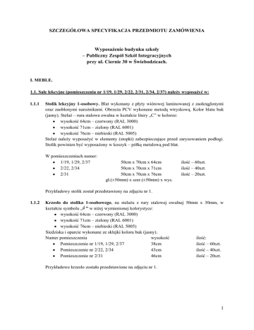SZCZEGÓŁOWA SPECYFIKACJA PRZEDMIOTU ZAMÓWIENIA Wyposażenie budynku szkoły – Publiczny Zespół Szkół Integracyjnych przy ul. Ciernie 30 w Świebodzicach. I. MEBLE. 1.1. Sale lekcyjne (pomieszczenia nr 1/19, 1/29, 2/22, 2/31, 2/34, 2/37) należy wyposażyć w: 1.1.1 Stolik lekcyjny 1-osobowy. Blat wykonany z płyty wiórowej laminowanej z zaokrąglonymi oraz zaoblonymi narożnikami. Obrzeża PCV wykonane metodą wtryskową. Kolor blatu buk (jasny). Stelaż – rura stalowa owalna w kształcie litery „C” w kolorze: wysokość 64cm – czerwony (RAL 3000) wysokość 71cm – zielony (RAL 6001) wysokość 76cm – niebieski (RAL 5005) Stelaż należy wyposażyć w elementy (stopki) zabezpieczające przed zarysowaniem podłogi. Stolik powinien być wyposażony w koszyk – półkę metalową pod blat. W pomieszczeniach numer: 1/19, 1/29, 2/37 2/22, 2/34 2/31 50cm x 70cm x 64cm 50cm x 70cm x 71cm 50cm x 70cm x 76cm gł.(±50mm) x szer.(±50mm) x wys. ilość – 60szt. ilość – 40szt. ilość – 20szt. Przykładowy stolik został przedstawiony na zdjęciu nr 1. 1.1.2 Krzesło do stolika 1-osobowego, na stelażu z rury stalowej owalnej 50mm x 30mm, w kształcie symbolu „╛” w niżej wymienionej kolorystyce: wysokość 64cm – czerwony (RAL 3000) wysokość 71cm – zielony (RAL 6001) wysokość 76cm – niebieski (RAL 5005) Siedziska i oparcie wykonane ze sklejki koloru buk (jasny). Numer pomieszczenia wysokość ilość: Pomieszczenie nr 1/19, 1/29, 2/37 38cm ilość – 60szt. Pomieszczenie nr 2/22, 2/34 43cm ilość – 40szt. Pomieszczenie nr 2/31 46cm ilość – 20szt. Przykładowe krzesło zostało przedstawione na zdjęciu nr 1. 1 Zdjęcie nr 1. 1.1.3 Stolik dla osób na wózkach inwalidzkich. Stelaż stalowy z regulacją poziomu i wysokości oraz regulacją kąta nachylenia blatu. Stelaż należy wyposażyć w elementy (stopki) zabezpieczające przed zarysowaniem podłogi Blat wykonany z płyty wiórowej laminowanej koloru buk (jasny) ze specjalnym wycięciem umożliwiającym podjazd wózkiem. Przykładowy stolik został przedstawiony na zdjęciu nr 2. Ilość – 6 szt. (po 1 stoliku w każdej klasie) Zdjęcie nr 2. 1.1.4 Biurko dla nauczyciela o wymiarach 750mm x 1680mm x 776mm, ±50mm (wysokość x szerokość x głębokość). Blat wykonany z płyty wiórowej laminowanej o grubości 22mm ÷ 25mm, koloru buk (jasny). Stelaż – stalowy koloru popielatego. Stelaż należy wyposażyć w elementy (stopki) zabezpieczające przed zarysowaniem podłogi. Plecy biurka pełne, o wysokości 150mm od podłogi do blatu, wykonane z materiału ściśle powiązanego z blatem biurka. Pod blatem z lewej strony należy zlokalizować szafkę z trzema szufladami zamykaną na jeden centralny zamek. Głębokość i wysokość szafki dopasować do wymiarów biurka. Szerokość 440mm. Ilość – 5 szt. (po 1szt. do pomieszczeń nr 1/19, 1/29, 2/22, 2/34, 2/37) 2 1.1.5 Fotel dla nauczyciela. Fotel biurowy z podłokietnikami. Siedzisko i oparcie miękkie tapicerowane, profilowane koloru czarnego. Wysokość siedziska regulowana. Wysokość oparcia minimum 56 cm. Pięcioramienna podstawa z kółkami nierysującymi powierzchni podłogi. Przykładowy fotel został przedstawiony na zdjęciu nr 3. Ilość – 7 szt. (po 1 fotelu w każdej klasie lekcyjnej) Zdjęcie nr 3. 1.1.6 Szafka o wymiarach 1800mm x 300mm x 450mm (wysokość x szerokość x głębokość), wykonana z blachy stalowej, malowanej techniką proszkową. Kolorystyka zostanie ustalona przy podpisywaniu umowy (jeden z kolorów standardowych). Drzwi pojedyncze wyposażone w zamek na kluczyk. Do każdego zamka mają zostać dostarczone 3 komplety kluczy. W drzwiach należy zlokalizować otwory do wentylacji. Na dole szafki należy przewidzieć miejsce na obuwie o wysokości 300 mm (± 10 mm). Miejsce na obuwie należy oddzielić od góry półką. Środkowa część jest przeznaczona na odzież – szafkę należy wyposażyć w wieszaki do powieszenia odzieży. W górnej części należy przewidzieć półkę na książki. Wysokość półki 350 mm (± 10 mm). Szafki należy wyposażyć w zamek na kluczyk. Wykonawca przekaże do każdej szafki 3 komplety (sztuki) kluczy. Na frontach szafek należy wykonać motyw graficzny, wielkoformatowy, odporny na czynniki zewnętrzne, preferowany nadruk techniką solwentową. Motywy na 20 szafkach mają tworzyć jedną całość. Wybór wzoru motywu graficznego zostanie ustalony z Wykonawcą na etapie podpisywania umowy. Dodatkowo szafki muszą mieć możliwość trwałego montażu do konstrukcji budynku. Przykładowa szafka (3 szt.) oraz motyw graficzny została przedstawiona na zdjęciu nr 4. Ilość – 80 szt. (po 20 szafek w pomieszczeniach nr 1/19, 1/29, 2/22, 2/37) 3 Zdjęcie nr 4. 1.1.7 Meble biurowe 1.1.7.1 Szafka o wymiarach 1860mm x 800mm x 400mm (wysokość x szerokość x głębokość) wykonana z płyty wiórowej 18 mm koloru buk (jasny). Krawędzie oklejone PCV-1mm. Górna część mebla (otwarta) przedzielona trzema półkami. Wysokość półek co 33mm (pod segregatory formatu A4). Grubość półek 18mm. Dolna połowa mebla zamykana na klucz (drzwi dwuskrzydłowe). Na środku zamykanej części półka. Należy zapewnić możliwość regulowania wysokości półki. Szafkę należy wykonać na nóżkach aluminiowych wysokości 100mm z regulacją. Przekrój nóżki okrągły o średnicy 40÷50mm. Należy dostarczyć 3 komplety kluczy. Ilość – 5 szt. (po 1 szafce w pomieszczeniach nr 1/19, 1/29, 2/22, 2/35, 2/37). 1.1.7.2 Szafka o wymiarach 1860mm x 800mm x 400mm (wysokość x szerokość x głębokość) wykonana z płyty wiórowej 18mm koloru buk (jasny). Krawędzie oklejone PCV-1mm. Wnętrze przedzielone półkami co 33mm (pod segregatory formatu A4). Grubość półek 18mm. Całość mebla zamykana drzwiami dwuskrzydłowymi na klucz. Należy dostarczyć 3 komplety kluczy. Szafkę należy wykonać na nóżkach aluminiowych wysokości 100mm z regulacją. Przekrój nó