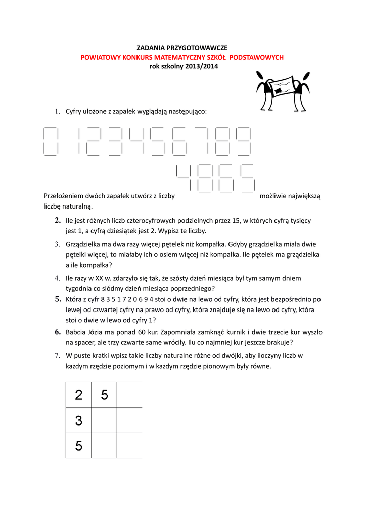 ZADANIA PRZYGOTOWAWCZE POWIATOWY KONKURS MATEMATYCZNY SZKÓŁ PODSTAWOWYCH rok szkolny 2013/2014 1. Cyfry ułożone z zapałek wyglądają następująco: Przełożeniem dwóch zapałek utwórz z liczby liczbę naturalną. możliwie największą 2. Ile jest różnych liczb czterocyfrowych podzielnych przez 15, w których cyfrą tysięcy jest 1, a cyfrą dziesiątek jest 2. Wypisz te liczby. 3. Grządzielka ma dwa razy więcej pętelek niż kompałka. Gdyby grządzielka miała dwie pętelki więcej, to miałaby ich o osiem więcej niż kompałka. Ile pętelek ma grządzielka a ile kompałka? 4. Ile razy w XX w. zdarzyło się tak, że szósty dzień miesiąca był tym samym dniem tygodnia co siódmy dzień miesiąca poprzedniego? 5. Która z cyfr 8 3 5 1 7 2 0 6 9 4 stoi o dwie na lewo od cyfry, która jest bezpośrednio po lewej od czwartej cyfry na prawo od cyfry, która znajduje się na lewo od cyfry, która stoi o dwie w lewo od cyfry 1? 6. Babcia Józia ma ponad 60 kur. Zapomniała zamknąć kurnik i dwie trzecie kur wyszło na spacer, ale trzy czwarte same wróciły. Ilu co najmniej kur jeszcze brakuje? 7. W puste kratki wpisz takie liczby naturalne różne od dwójki, aby iloczyny liczb w każdym rzędzie poziomym i w każdym rzędzie pionowym były równe. 8. O godzinie 8:30 wyjechała z miasta ciężarówka z prędkością 52 km/h. O godzinie 9:30 z tego samego miasta wyruszyła druga ciężarówka, w przeciwnym kierunku z prędkością 49 km/h. Jak daleko będą od siebie oba samochody o godzinie 11:30? 9. Turysta wyruszył w drogę z prędkością 5 km/h. W dwie godziny później wyruszył za nim rowerzysta z prędkością 250 m/min. W jakiej odległości od miejsca wymarszu i po jakim czasie rowerzysta dogoni turystę? 10. Jak długo pociąg jadący z prędkością 60 km/h będzie przejeżdżał przez wiadukt o długości 100m, jeśli sam pociąg ma długość 150m? 11. Trzy maszynistki pisały tekst komputerowy. Jedna pisała średnio w ciągu godziny 6 strony, druga 5, a trzecia 4 strony. Przepracowały jednakową liczbę godzin i napisały razem 193 strony. Ile stron napisała każda maszynistka ? 12. Samochód ma w baku 60 litrów paliwa. Samochód średnio pali 10 litrów paliwa na 80 km . Ile litrów paliwa zostanie w baku po przejechaniu 350 km? 13. Policjant zobaczył poszukiwanego złodzieja z odległości 150m , który zaczął uciekać . Złodziej biegł z prędkością 200m/min, a policjant 250m/min. Po ilu minutach policjant dogoni złodzieja? 14. Pani Dorota Kowalska powiedziała : „ Do chwili obecnej przeżyłam 66 lat, 66 miesięcy, 66tygodni, 66 dni i 66 godzin”. Ile lat ukończyła pani Dorota Kowalska? 15. Piotr zapomniał dokręcić do końca kran i dlatego co 3 sekundy kapie kropla wody. 1500 kropel daje 1litr. Ile wody wycieknie w ciągu 10 godzin? 16. W deltoidzie 2 sąsiednie boki mają długości 5 cm i 12 cm, zaś kąt miedzy tymi bokami wynosi 90 stopni. Oblicz pole deltoidu. 17. Jak zmieni się pole prostokąta, gdy jeden z jego boków zwiększymy czterokrotnie, a drugi zmniejszymy czterokrotnie? 18. Dłuższa podstawa trapezu równoramiennego ABCD o kącie ostrym 120, zaś krótsza podstawa stanowi wysokości trapezu. 19. Oblicz pole trójkąta trójkątów: ma długość długości dłuższej podstawy. Oblicz długość przedstawionego na poniższym rysunku mając dane pole oraz wiedząc, że . 20. W prostokącie o wymiarach 5 na 3, przedłużono boki z każdej strony o 2. Oblicz pole powstałego ośmioboku. 21. W równoległoboku GUZY suma długości przekątnych GZ i UY jest równa 18. Obwód trójkąta GUZ jest o 2 większy od obwodu trójkąta UZY. Oblicz długości przekątnych tego równoległoboku. 22. W trapezie jedna z podstaw ma długość trzykrotnie dłuższą od drugiej. Przekątna trapezu dzieli trapez na 2 trójkąty tak, że pole większego trójkąta wynosi 9 cm2. Oblicz pole trapezu. 23. Kolejne boki czworokąta wyrażone są liczbami: 2, a, b, c. Średnia arytmetyczna pierwszego i drugiego boku jest równa 3, a średnia arytmetyczna pierwszego, drugiego i trzeciego boku jest równa 4. Wyznacz długości wszystkich boków wiedząc, że jego obwód wynosi 20. 24. Bartek ma pewną ilość ołowianych żołnierzyków . Kiedy spróbował ustawić je w kolumnę czwórkami, to w ostatnim szeregu mógł ustawić tylko trzy. Gdy spróbował ustawić kolumnę trójkami, to zostawały mu dwa. Ile zostanie mu żołnierzyków, jeśli będzie swoje wojsko ustawiał w kolumnę szóstkami 25. Marek wybiera się w odwiedziny do kolegi. Wychodząc z domu po śniadaniu zauważył, że zegarek elektroniczny wskazuje godzinę symetryczną ( może to być na przykład 15: 51 lub 20: 02 ). Kiedy wrócił do domu po 350 minutach zauważył, że jego zegarek znów wskazuje godzinę symetryczną. O której godzinie Marek wyszedł z domu i o której wrócił? 26. Wiadomo, że x, y, z są liczbami pierwszymi oraz że 14 + x = 18 + y = 35 + z Znajdź te liczby. 27. Marek odpowiadał na 13 pytań. Za każdą poprawną odpowiedź uzyskał 4 punkty, a za każdą błędną nie uzyskiwał punktów i dodatkowo tracił jeszcze 3 punkty. Oblicz, na ile pytań Marek udzielił poprawnej odpowiedzi, jeżeli łącznie zdobył 17 punktów. 28. Dorysuj figury na pustych ścianach w taki sposób, by po sklejeniu otrzymać identyczne kostki. + ☼ X □ Δ + X 29. Stolarz wykonał szafkę w kształcie prostopadłościanu o wymiarach 3dm x 6 dm x 12 dm. Ile szuflad o wymiarach 3dm x 6 dm x 2 dm można umieścić w takiej szafce? 30. W czasie ulewnego deszczu grunt pokryła warstwa wody o grubości 10 mm. Ile litrów wody spadło na 60 – arową prostokątną działkę? Ile to wiader wody ? (pojemność wiadra to 12 litrów) 31. Akwarium o wymiarach 60cm x 40cm x 50cm wypełniono wodą do 0,6 jego wysokości. Ile litrów wody należy dolać, aby wypełnić objętości tego akwarium? 32. Pomalowany na zielono sześcian rozcięto na 64 jednakowe sześciany. Ile z nich nie 