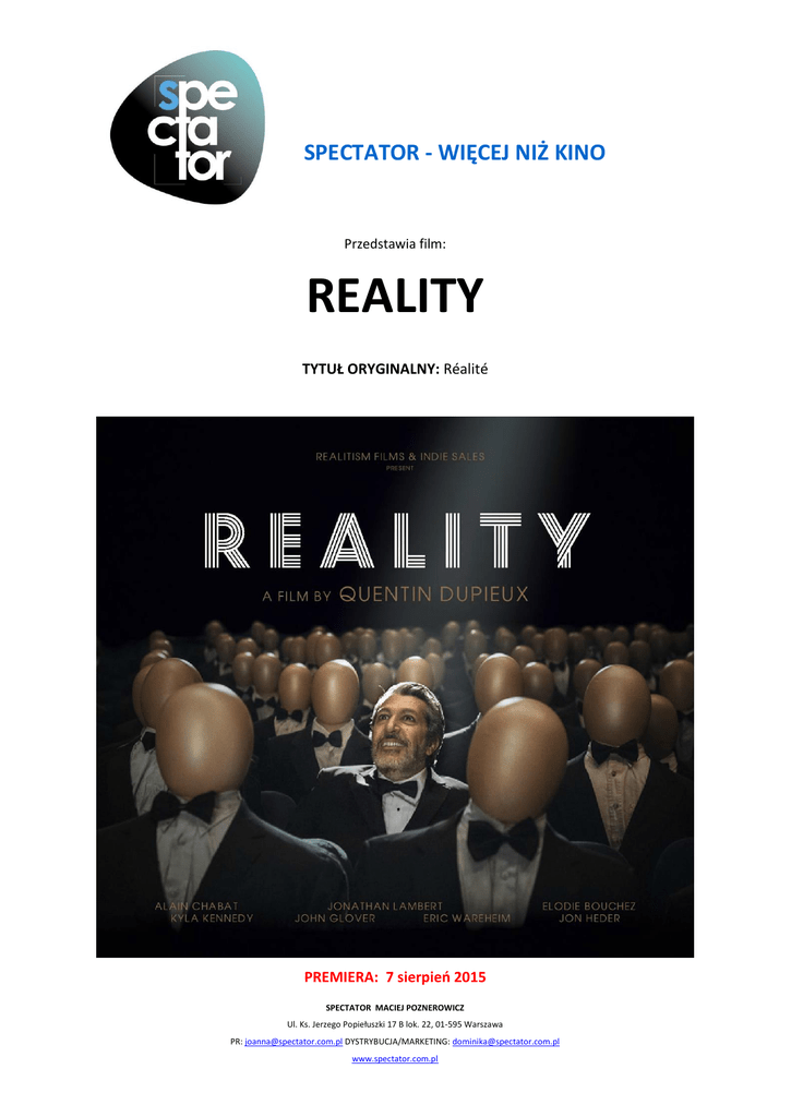 SPECTATOR - WIĘCEJ NIŻ KINO Przedstawia film: REALITY TYTUŁ ORYGINALNY: Réalité PREMIERA: 7 sierpień 2015 SPECTATOR MACIEJ POZNEROWICZ Ul. Ks. Jerzego Popiełuszki 17 B lok. 22, 01-595 Warszawa PR: [email protected] DYSTRYBUCJA/MARKETING: [email protected] www.spectator.com.pl REALITY Produkcja: Francja, Belgia, Stany Zjednoczone Czas : 95 min. TWÓRCY Reżyseria: Quentin Dupieux (Złe gliny, Mordercza opona, Wrong) Scenariusz: Quentin Dupieux Produkcja: Realitism Films (Lagerfeld od podszewki, Mordercza opona, Wrong, Złe gliny) Muzyka: Philip Glass (Music with Changing Parts, 1971) OBSADA Alain Chabat: Jason Tantra (Blue Indigo, Asterix i Obelix 2, Układ idealny) Jonathan Lambert: Bob Marsha (L'amour dure trois ans – Miłość trwa trzy lata) Élodie Bouchez: Alice Tantra (Happy Few, Wyśnione życie aniołów) Kyla Kennedy: Reality John Glover: Zog (Żona idealna – serial tv, Batman i Robin) Eric Wareheim: Henri (znany z duetu komediowego Tim i Eric) Jon Heder: Dennis (Napoleon Wybuchowiec, Ostrza chwały) SPECTATOR MACIEJ POZNEROWICZ Ul. Ks. Jerzego Popiełuszki 17 B lok. 22, 01-595 Warszawa PR: [email protected] DYSTRYBUCJA/MARKETING: [email protected] www.spectator.com.pl FESTIWALE 2015 Międzynarodowy Festiwal Filmowy w Rotterdamie New York Rendez-vous with French Cinema Międzynarodowy Festiwal Filmowy w Stambule CPH : PIX w Kopenhadze: sekcja „LONE STARS” 2014 Festiwal Filmowy w Wenecji: nominacja: Najlepszy Film w sekcji Nowe Horyzonty Bienne French Film Festival w Szwajcarii Festiwal Nowego Kina w Montrealu: sekcja „Temps Zero” Międzynarodowy Festiwal Filmowy w Katalonii: nagroda: José Luis Guarner Critic's Award dla Najlepszego Filmu Międzynarodowy Festiwal Filmowy w Tokio: sekcja „World Focus” Międzynarodowy Festiwal Filmowy w Ghent: nagroda: Youth Jury Award - Special Mention Międzynarodowy Festiwal Filmowy w Ghent: nominacja: Grand Prix dla Najlepszego Filmu Festiwal Filmów Fantastycznych Trieste AFI Fest w Stanach Zjednoczonych Festiwal Filmowy Mosaico we Włoszech Międzynarodowy Festiwal Filmowy w Sztokholmie: sekcja „Twilight Zone” SPECTATOR MACIEJ POZNEROWICZ Ul. Ks. Jerzego Popiełuszki 17 B lok. 22, 01-595 Warszawa PR: [email protected] DYSTRYBUCJA/MARKETING: [email protected] www.spectator.com.pl O FILMIE Jason, spokojny kamerzysta, marzy o wyreżyresowanieu swojego pierwszego filmu – horroru. Bob Marshal, zamożny producent, zgadza się sfinansować to dzieło pod jednym warunkiem: Jason w ciagu 48 godzin musi odnaleźć najdoskonalszy krzyk w historii kina… W czasie poszukiwań Jason zaczyna się gubić w koszmarach. RECENZJE Z ZAGRANICY „Reality” – pełna absurdu komedia, opowieść o snach i koszmarach rodem z filmów.” Ben Kenigsberg, The Ney York Times, 20.04.2015 Trudności w odczytaniu znaczenia arealistycznego filmu Quntina Dupieux (Mordercza opona, Wrong) zaczynają się już w momencie pojawienia się tytułu. Reality to bowiem tak naprawdę imię dziewczyny (Kyla Kenedy), która znajduje niebieską kasetę wideo w brzuchu świni, którą zastrzelił jej ojciec. Fakt, że świnia mogła zjeść taśmę – a nawet fakt, że wideo jest wciąż w użyciu – w tym komicznym dziele wydaje się mieć sens. Dla Dupieux granica pomiędzy snami SPECTATOR MACIEJ POZNEROWICZ Ul. Ks. Jerzego Popiełuszki 17 B lok. 22, 01-595 Warszawa PR: [email protected] DYSTRYBUCJA/MARKETING: [email protected] www.spectator.com.pl a rzeczywistością jest płynna, często posługuje się on techniką „film w filmie”, a realność w takim razie może być po prostu kolejną fabułą. Jason Tantra (Alain Chabat) – kamerzysta w programie kulinarnym, w którym prowadzący ubrany jest w kostium szczura (Jon Heder) – dostaje zielone światło na nakręcenie horroru. Jedynym warunkiem producenta (Jonathan Lambers) jest, żeby Jason stworzył przerażające charczenie, za które film zostanie nagrodzony Oscarem. Dziewczyna o imieniu Reality gra w innym filmie tego samego producenta. Pozwala to Dupieux na zapętlanie akcji raz za razem. Najbardziej zabawne sceny to te, w których Jasona mami wizja zdobycia nieistniejącej nagrody. W scenie wręczania Oscara występują Roxane Mesquida i Michel Hazanavicius, reżyser „Artysty”. W pewnym momencie Jason odkrywa, że film, którego jeszcze nie zrobił, już istnieje. Zaczyna on wtedy błagać publiczność, żeby nie oglądała tego dzieła. Każda luka w fabule coraz bardziej przeszkadza w łączeniu faktów w logiczną całość. Film zamiast tego czerpie siłę z dowcipu i wizualnego rozmachu. „Reality” jest zabawniejszym dziełem niż „Mordercza opona”, widzowie śmieją się nie tylko w myślach. „Reality” Quentina Dupieux namiesza wam w głowach.” Kaleem Aftab, Indiewire, 12.09.2014 Quentin Dupieux wydaje się błądzić po zakamarkach czasu. Jego najnowszy film, „Reality”, wygląda na nakręcony w 1974 roku i dopiero teraz wydobyty w jakiegoś paryskiego skarbca kinematografii. Nie jest to przypadek. „Reality”, podobnie jak komediowy horror „Mordercza opona”, to odważny hołd dla filmów klasy B – w szczególności tych opartych na absurdalnym pomyśle, odrobinie science fiction i przesadnym aktorstwie. Film składa się z kilku wątków, które ostatecznie łączą się jak elementy skomplikowanego orgiami. Rezultatem jest niezwykły finał. Młoda dziewczyna o imieniu Reality (Kyla Kenedy) widzi, jak jej ojciec, który jest myśliwym, rozcina brzuch zabitej świni. Pośród wnętrzności dostrzega kasetę wideo (kto je jeszcze SPECTATOR MACIEJ POZNEROWICZ Ul. Ks. Jerzego Popiełuszki 17 B lok. 22, 01-595 Warszawa PR: [email protected] DYSTRYBUCJA/MARKETING: [email protected] www.spectator.com.pl pamięta…). Wyobraża sobie, że przedmiot kryje w sobie tajemnicę. Jej zwariowani rodzice są natomiast przekonani, że ich córka konfabuluje. Jon Heder („Napoleon Wybuchowiec”) gra Denisa, prezentera telewizyjnego programu kulinarnego, który ubra