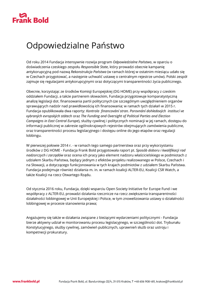 Odpowiedzialne Państwo Od roku 2014 Fundacja intensywnie rozwija program Odpowiedzialne Państwo, w oparciu o doświadczenia czeskiego zespołu Responsible State, który prowadzi obecnie kampanię antykorupcyjną pod nazwą Rekonstrukcja Państwa (w ramach której w ostatnim miesiącu udało się w Czechach przygotować, a następnie uchwalić ustawę o centralnym rejestrze umów). Polski zespół zajmuje się regulacjami antykorupcyjnymi oraz dotyczącymi transparentności życia publicznego. Obecnie, korzystając ze środków Komisji Europejskiej (DG HOME) przy współpracy z czeskim oddziałem Fundacji, a także partnerem słowackim, Fundacja przygotowuje komparatystyczną analizę legislacji dot. finansowania partii politycznych (ze szczególnym uwzględnieniem organów sprawujących nadzór nad prawidłowością ich finansowania; w ramach tych działań w 2015 r. Fundacja opublikowała dwa raporty: Kontrola financování stran. Porovnání dohledových institucí ve vybraných evropských státech oraz The Funding and Oversight of Political Parties and Election Campaigns in East Central Europe), służby cywilnej i politycznych nominacji w jej ramach, dostępu do informacji publicznej w zakresie ogólnokrajowych rejestrów obejmujących zamówienia publiczne, oraz transparentności procesu legislacyjnego i dostępu online do jego etapów oraz regulacji lobbingu. W pierwszej połowie 2014 r. - w ramach tego samego partnerstwa oraz przy wykorzystaniu środków z DG HOME - Fundacja Frank Bold przygotowała raport pt. Sposób doboru i kwalifikacji rad nadzorczych i zarządów oraz ocena ich pracy jako element nadzoru właścicielskiego w podmiotach z udziałem Skarbu Państwa, będący jednym z efektów projektu realizowanego w Polsce, Czechach i na Słowacji, a dotyczącego funkcjonowania w tych krajach podmiotów z udziałem Skarbu Państwa. Fundacja podejmuje również działania m. in. w ramach koalicji ALTER-EU, Koalicji CSR Watch, a także Koalicji na rzecz Otwartego Rządu. Od stycznia 2016 roku, Fundacja, dzięki wsparciu Open Society Initiative for Europe Fund i we współpracy z ALTER-EU, prowadzi działania rzecznicze na rzecz zwiększenia transparentności działalności lobbingowej w Unii Europejskiej i Polsce, w tym znowelizowania ustawy o działalności lobbingowej w procesie stanowienia prawa; Angażujemy się także w działania związane z bieżącymi wydarzeniami politycznymi - Fundacja bierze aktywny udział w monitorowaniu procesu legislacyjnego, w szczególności dot. Trybunału Konstytucyjnego, służby cywilnej, zamówień publicznych, uprawnień służb oraz ustroju i kompetnecji prokuratury.