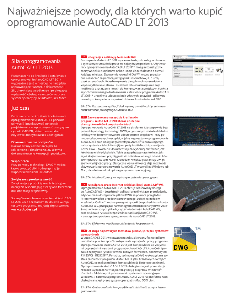 Najważniejsze powody, dla których warto kupić oprogramowanie AutoCAD LT 2013 Przeznaczone do kreślenia i detalowania oprogramowanie AutoCAD LT® 2013 wyposażone jest w niezbędne narzędzia usprawniające tworzenie dokumentacji 2D, ułatwiające współpracę i podnoszące wydajność, obsługiwane zarówno przez system operacyjny Windows® jak i Mac®. > Integracja z aplikacją Autodesk 360 Rozwiązanie Autodesk® 360 zapewnia dostęp do usług w chmurze, a tym samym umożliwia pracę na najwyższym poziomie. Użytkownicy oprogramowania AutoCAD LT 2013** mogą automatycznie zapisywać pliki projektowe online i mają do nich dostęp z niemal każdego miejsca. Dwuwymiarowe pliki DWF™ można przeglądać i oznaczać za pomocą przeglądarki internetowej lub urządzeń przenośnych. Przechowywanie danych w chmurze ułatwia współużytkowanie plików i śledzenie ich aktualizacji oraz daje możliwość zapraszania innych do komentowania projektów. Funkcja zsynchronizowanego dostosowania ustawień w programie AutoCAD LT 2013** umożliwia udostępnienie własnych ustawień i plików na dowolnym komputerze za pośrednictwem konta Autodesk 360. Już czas ZALETA: Rozszerzenie aplikacji desktopowej o możliwości przetwarzania w chmurze, jakie oferuje Autodesk 360. Przeznaczone do kreślenia i detalowania oprogramowanie AutoCAD LT pozwala uchwycić i przekazywać koncepcje projektowe oraz opracowywać precyzyjne rysunki CAD 2D, które można łatwo edytować, modyfikować i udostępniać. > Zaawansowane narzędzia kreślarskie programu AutoCAD LT 2013 teraz dostępne dla użytkowników komputerów Mac® Oprogramowanie AutoCAD LT 2013 na platformę Mac zapewnia bezpośrednią obsługę technologii DWG, a tym samym ułatwia dokładne i efektywne dokumentowanie i udostępnianie projektów. Przy pomocy rozbudowanych narzędzi, w jakie wyposażono oprogramowanie AutoCAD LT oraz intuicyjnego interfejsu Mac OS® X pozwalającego na korzystanie z takich funkcji jak: gesty Multi-Touch i przewijanie Cover Flow – tworzenie dokumentacji na wybranej platformie jest łatwiejsze niż kiedykolwiek. Takie oszczędzające czas funkcje, jak: szyki skojarzeniowe, przyciąganie do obiektów, obsługa odnośników zewnętrznych (w tym PDF) i Menedżer Projektu gwarantują zwiększenie wydajności pracy. Elastyczne warunki licencji dają możliwość aktywowania oprogramowania AutoCAD LT w wersji na Windows lub Mac, niezależnie od zakupionego systemu operacyjnego. Siła oprogramowania AutoCAD LT 2013 Dokumentowanie pomysłów Rozbudowany zestaw narzędzi do szkicowania i detalowania 2D ułatwia dokumentowanie koncepcji i projektów. Współpraca Przy pomocy technologii DWG™ można łatwo tworzyć pliki i udostępniać je współpracownikom i klientom. Zwiększona produktywność Zwiększające produktywność intuicyjne narzędzia wspomagają efektywne tworzenie dokumentacji projektowej. Szczegółowe informacje na temat AutoCAD LT 2013 oraz bezpłatna* 30-dniowa wersja testowa programu, znajdują się na stronie: www.autodesk.pl ZALETA: Możliwość pracy na wybranym systemie operacyjnym. > Współpraca przez Internet dzięki aplikacji AutoCAD® WS Oprogramowanie AutoCAD LT 2013 oferuje wbudowany dostęp do AutoCAD WS – bezpłatnej* aplikacji umożliwiającej przeglądanie, edytowanie i udostępnianie plików DWG za pomocą przeglądarki internetowej lub urządzenia przenośnego. Dzięki narzędziom w zakładce Online** można przesyłać rysunki bezpośrednio na konto AutoCAD WS, przeglądać harmonogram zmian dokonanych we wcześniej zamieszczonych plikach, czytać wiadomości AutoCAD WS, oraz drukować rysunki bezpośrednio z aplikacji AutoCAD WS – a wszystko z poziomu oprogramowania AutoCAD LT 2013. ZALETA: Efektywna współpraca z klientami i kooperantami. > Obsługa najnowszych formatów plików, sprzętu i systemów operacyjnych W AutoCAD LT 2013 wprowadzono zaktualizowany format plików umożliwiając w ten sposób zwiększenie wydajności pracy programu. Oprogramowanie AutoCAD LT 2013 jest kompatybilne ze wszystkimi poprzednimi wersjami programów AutoCAD LT i AutoCAD i pozwala zapisywać rysunki w wielu różnych formatach, począwszy od R14 DWG i R12 DXF™. Ponadto, technologia DWG wykorzystana została zarówno w programie AutoCAD LT jak i branżowych wersjach AutoCAD, co maksymalizuje kompatybilność i interoperacyjność. Oprogramowanie AutoCAD LT 2013 obsługiwane jest przez stacje robocze wyposażone w najnowszą wersję programu Windows®, również z 64-bitowymi procesorami i systemem operacyjnym Windows 7, natomiast program AutoCAD LT 2013 na platformę Mac obsługiwany jest przez system operacyjny Mac OS X Lion. ZALETA: Godna zaufania kompatybilność i stabilność sprzętu i oprogramowania. > Oprogramowanie przyjazne dla użytkownika Interfejs użytkownika w programie AutoCAD LT 2013 jest bardziej intuicyjny i łatwiejszy w obsłudze. Wielofunkcyjne uchwyty i kontekstowe zakładki wstążki sprawiają, że polecenia są na wyciągnięcie ręki. Po uruchomieniu konkretnych poleceń lub wybraniu konkretnych obiektów, polecenia te i obiekty automatycznie pojawiają się na górze ekranu. Nawet znajomy wiersz poleceń zapewnia obecnie lepszą funkcjonalność i więcej opcji konfiguracji – m. in. automatyczne uzupełnianie nazw poleceń i zmiennych systemowych oraz reagujące na kliknięcie opcje w ramach aktywnych poleceń. ZALETA: Wyszukiwanie poleceń i funkcji zajmuje mniej czasu. > Dodatkowa funkcjonalność oprogramowania AutoCAD® Oprogramowanie AutoCAD LT 2013 zawiera obecnie funkcje, które wcześniej były dostępne tylko w programie AutoCAD. Menedżer Zestawów Arkuszy (w AutoCAD LT 2013 na platformę Mac noszący nazwę Menedżer Projektu) porządkuje i aktualizuje zestawy rysunków. Ułatwia zarządzanie przy pomocy pojedynczej palety widokami układu, tytułami detali i skalą oraz nazwami i numerami arkuszy. Polecenie Usuń powtarzające się obiekty czyści rysun