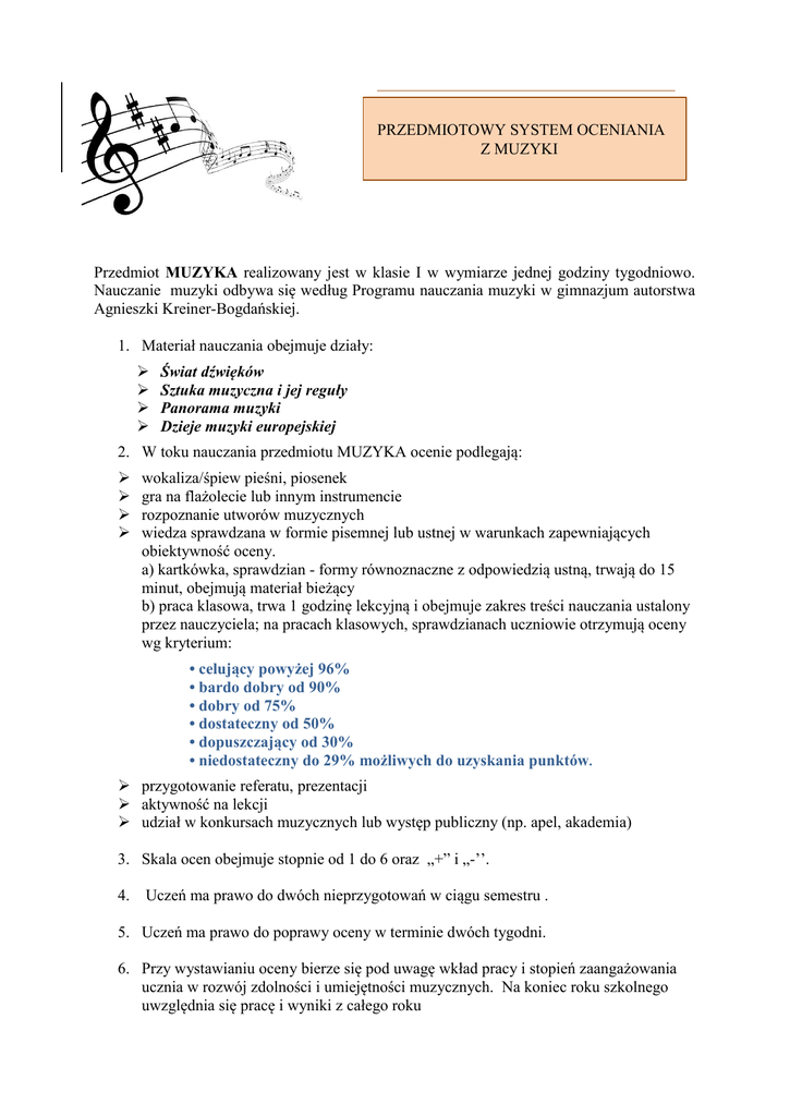 PRZEDMIOTOWY SYSTEM OCENIANIA Z MUZYKI Przedmiot MUZYKA realizowany jest w klasie I w wymiarze jednej godziny tygodniowo. Nauczanie muzyki odbywa się według Programu nauczania muzyki w gimnazjum autorstwa Agnieszki Kreiner-Bogdańskiej. 1. Materiał nauczania obejmuje działy: Świat dźwięków Sztuka muzyczna i jej reguły Panorama muzyki Dzieje muzyki europejskiej 2. W toku nauczania przedmiotu MUZYKA ocenie podlegają: wokaliza/śpiew pieśni, piosenek gra na flażolecie lub innym instrumencie rozpoznanie utworów muzycznych wiedza sprawdzana w formie pisemnej lub ustnej w warunkach zapewniających obiektywność oceny. a) kartkówka, sprawdzian - formy równoznaczne z odpowiedzią ustną, trwają do 15 minut, obejmują materiał bieżący b) praca klasowa, trwa 1 godzinę lekcyjną i obejmuje zakres treści nauczania ustalony przez nauczyciela; na pracach klasowych, sprawdzianach uczniowie otrzymują oceny wg kryterium: • celujący powyżej 96% • bardo dobry od 90% • dobry od 75% • dostateczny od 50% • dopuszczający od 30% • niedostateczny do 29% możliwych do uzyskania punktów. przygotowanie referatu, prezentacji aktywność na lekcji udział w konkursach muzycznych lub występ publiczny (np. apel, akademia) 3. Skala ocen obejmuje stopnie od 1 do 6 oraz „+” i „-’’. 4. Uczeń ma prawo do dwóch nieprzygotowań w ciągu semestru . 5. Uczeń ma prawo do poprawy oceny w terminie dwóch tygodni. 6. Przy wystawianiu oceny bierze się pod uwagę wkład pracy i stopień zaangażowania ucznia w rozwój zdolności i umiejętności muzycznych. Na koniec roku szkolnego uwzględnia się pracę i wyniki z całego roku KRYTERIA I WYMAGANIA NA POSZCZEGÓLNE STOPNIE Ocenę celującą otrzymuje uczeń, który: wyróżnia się wiedzą muzyczną wybiegająca poza program nauczania przedmiotu muzyka w gimnazjum reprezentuje wysoki poziom artystyczny, umiejętności wokalnych lub instrumentalnych zna terminologie muzyczną i sprawnie się nią posługuje bierze czynny udział w życiu muzycznym szkoły i środowiska lokalnego uczestniczy w konkursach i przeglądach muzycznych rozpoznaje, analizuje i interpretuje dzieła muzyczne Ocenę bardzo dobrą otrzymuje uczeń, który: opanował wiadomości i umiejętności przewidziane programem nauczania rozpoznaje dzieła muzyczne posiada umiejętności wokalne i instrumentalne zna i poprawnie stosuje terminologię muzyczną opanował pamięciowo teksty piosenek i melodie instrumentalne bierze czynny udział w lekcji Ocenę dobrą otrzymuje uczeń który: aktywnie pracuje w grupie i zespole opanował w znacznym stopniu wiadomości i umiejętności przewidziane programem nauczania zna terminologię muzyczną śpiewa piosenki podpierając się tekstem i gra na flażolecie przy pomocy nut Ocenę dostateczną otrzymuje uczeń, który: pracuje w grupie i zespole wybiórczo opanował wiadomości i umiejętności przewidziane programem nauczania słabo opanował terminologię muzyczną podczas śpiewu piosenek i gry na instrumencie popełnia błędy Ocenę dopuszczającą otrzymuje uczeń, który: ma braki w podstawowych wiadomościach i umiejętnościach muzycznych lecz z pomocą nauczyciela potrafi je nadrobić w pracy zespołowej oczekuje pomocy nauczyciela niewystarczająco opanował terminologię muzyczną podczas śpiewu i gry na flażolecie oczekuje pomocy nauczyciela Ocenę niedostateczną otrzymuje uczeń, który: nie opanował niezbędnych wiadomości i umiejętności potrzebnych do kontynuowania nauki. W szczególności: wykazuje brak chęci do indywidualnej pracy na lekcji nie pracuje w grupie i zespole mimo pomocy nauczyciela nie potrafi zaśpiewać piosenki ani zagrać na instrumencie poznanej melodii opracowała: mgr Grażyna Niemczynowska