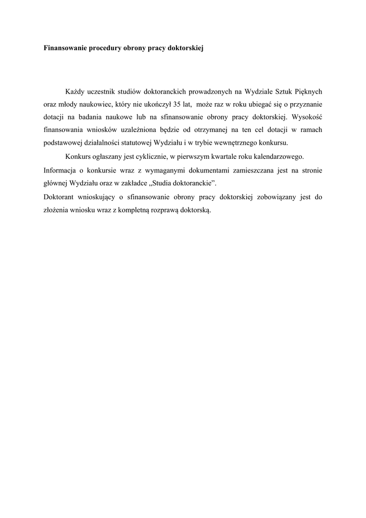 Finansowanie procedury obrony pracy doktorskiej Każdy uczestnik studiów doktoranckich prowadzonych na Wydziale Sztuk Pięknych oraz młody naukowiec, który nie ukończył 35 lat, może raz w roku ubiegać się o przyznanie dotacji na badania naukowe lub na sfinansowanie obrony pracy doktorskiej. Wysokość finansowania wniosków uzależniona będzie od otrzymanej na ten cel dotacji w ramach podstawowej działalności statutowej Wydziału i w trybie wewnętrznego konkursu. Konkurs ogłaszany jest cyklicznie, w pierwszym kwartale roku kalendarzowego. Informacja o konkursie wraz z wymaganymi dokumentami zamieszczana jest na stronie głównej Wydziału oraz w zakładce „Studia doktoranckie”. Doktorant wnioskujący o sfinansowanie obrony pracy doktorskiej zobowiązany jest do złożenia wniosku wraz z kompletną rozprawą doktorską.