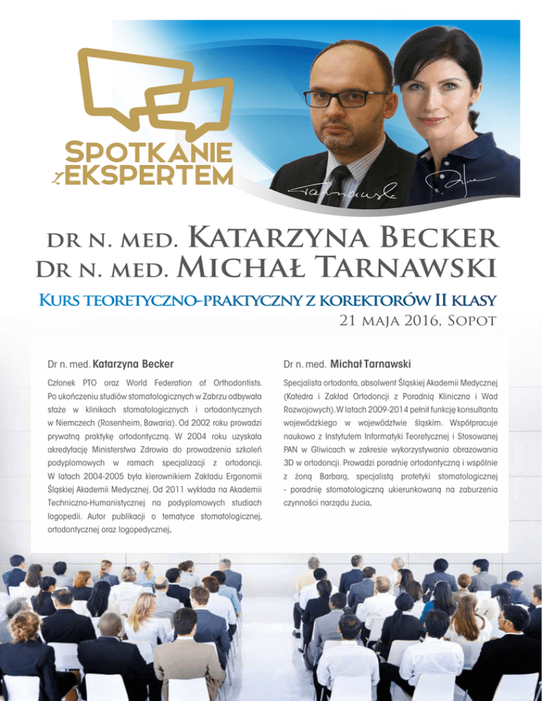 Z Spotkanie ekspertem dr n. med. Katarzyna Becker Dr n. med. Michał Tarnawski Kurs teoretyczno-praktyczny z korektorów II klasy 21 maja 2016, Sopot Dr n. med. Katarzyna Becker Dr n. med. Michał Tarnawski Członek PTO oraz World Federation of Orthodontists. Specjalista ortodonta, absolwent Śląskiej Akademii Medycznej Po ukończeniu studiów stomatologicznych w Zabrzu odbywała (Katedra i Zakład Ortodoncji z Poradnią Kliniczna i Wad staże w klinikach stomatologicznych i ortodontycznych Rozwojowych). W latach 2009-2014 pełnił funkcję konsultanta w Niemczech (Rosenheim, Bawaria). Od 2002 roku prowadzi wojewódzkiego w województwie śląskim. Współpracuje prywatną praktykę ortodontyczną. W 2004 roku uzyskała naukowo z Instytutem Informatyki Teoretycznej i Stosowanej akredytację Ministerstwa Zdrowia do prowadzenia szkoleń PAN w Gliwicach w zakresie wykorzystywania obrazowania podyplomowych w ramach specjalizacji z ortodoncji. 3D w ortodoncji. Prowadzi poradnię ortodontyczną i wspólnie W latach 2004-2005 była kierownikiem Zakładu Ergonomii z żoną Barbarą, specjalistą protetyki stomatologicznej Śląskiej Akademii Medycznej. Od 2011 wykłada na Akademii - poradnię stomatologiczną ukierunkowaną na zaburzenia Techniczno-Humanistycznej na podyplomowych studiach czynności narządu żucia. logopedii. Autor publikacji o tematyce stomatologicznej, ortodontycznej oraz logopedycznej. Cen kursua 890zł 21 maja 2016, Sopot Punkty edukacyjne: 7 Hotel Haffner ul. Jana Jerzego Haffnera 59, Sopot Kurs teoretyczno-praktyczny z korektorów II klasy Plan szczegółowy: 8.30-9.00 rejestracja 12.30-13.30 lunch 9.00-10.30 wykład 13.30-15.00 wykład 15.00-15.30 przerwa kawowa 11.00-12.30 wykład 15.30-17.40 wykład Diagnostyka różnicowa wad w II klasie Angle’a. Strategie leczenia Przypadki kliniczne - różnorodne zastosowanie Aparat Herbsta działanie i modyfikacje. Korzyści i trudności. Ćwiczenia na typodontach Esprit - nowoczesny korektor wad klasy II. Budowa, montaż Pytania, dyskusja Grand Ortho Sp. z o.o. | ul. Annopol 3, 03-236 Warszawa | tel.: 22 519 01 64 [email protected] | www.grandortho.pl/kursy/ Prosimy o wpłaty do 31.III.2016 r. na konto nr: 42 1140 1010 0000 3135 2600 1001 PROGRAM 10.30-11.00 przerwa kawowa
