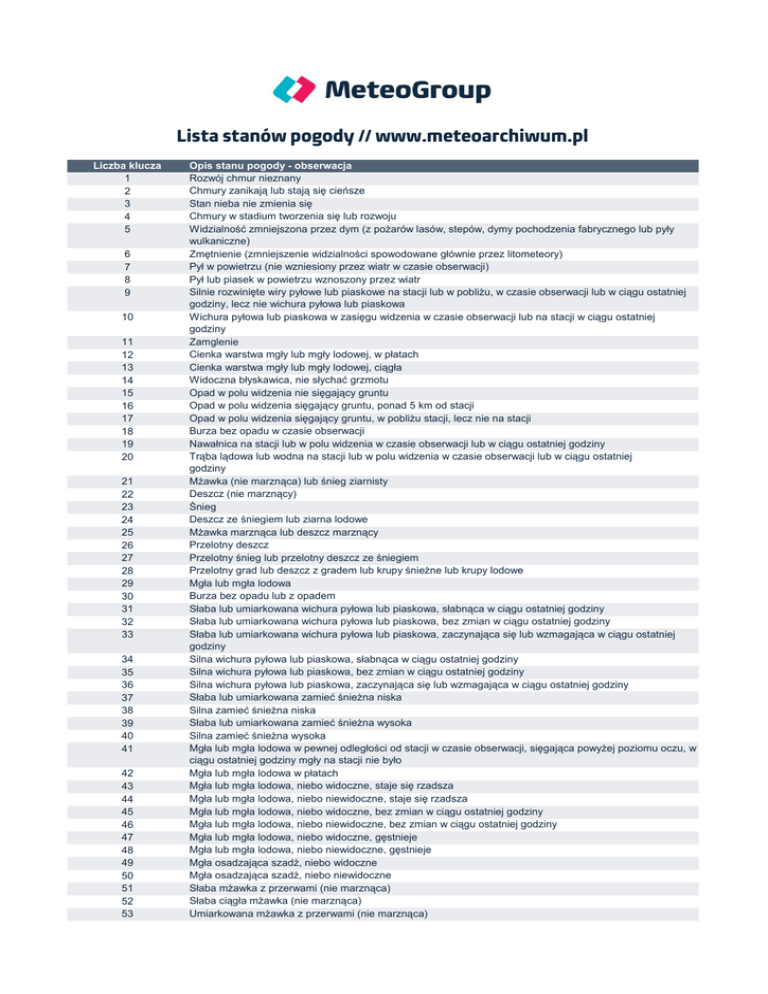 Lista stanów pogody // www.meteoarchiwum.pl Liczba klucza 1 2 3 4 5 6 7 8 9 10 11 12 13 14 15 16 17 18 19 20 21 22 23 24 25 26 27 28 29 30 31 32 33 34 35 36 37 38 39 40 41 42 43 44 45 46 47 48 49 50 51 52 53 Opis stanu pogody - obserwacja Rozwój chmur nieznany Chmury zanikają lub stają się cieńsze Stan nieba nie zmienia się Chmury w stadium tworzenia się lub rozwoju Widzialność zmniejszona przez dym (z pożarów lasów, stepów, dymy pochodzenia fabrycznego lub pyły wulkaniczne) Zmętnienie (zmniejszenie widzialności spowodowane głównie przez litometeory) Pył w powietrzu (nie wzniesiony przez wiatr w czasie obserwacji) Pył lub piasek w powietrzu wznoszony przez wiatr Silnie rozwinięte wiry pyłowe lub piaskowe na stacji lub w pobliżu, w czasie obserwacji lub w ciągu ostatniej godziny, lecz nie wichura pyłowa lub piaskowa Wichura pyłowa lub piaskowa w zasięgu widzenia w czasie obserwacji lub na stacji w ciągu ostatniej godziny Zamglenie Cienka warstwa mgły lub mgły lodowej, w płatach Cienka warstwa mgły lub mgły lodowej, ciągła Widoczna błyskawica, nie słychać grzmotu Opad w polu widzenia nie sięgający gruntu Opad w polu widzenia sięgający gruntu, ponad 5 km od stacji Opad w polu widzenia sięgający gruntu, w pobliżu stacji, lecz nie na stacji Burza bez opadu w czasie obserwacji Nawałnica na stacji lub w polu widzenia w czasie obserwacji lub w ciągu ostatniej godziny Trąba lądowa lub wodna na stacji lub w polu widzenia w czasie obserwacji lub w ciągu ostatniej godziny Mżawka (nie marznąca) lub śnieg ziarnisty Deszcz (nie marznący) Śnieg Deszcz ze śniegiem lub ziarna lodowe Mżawka marznąca lub deszcz marznący Przelotny deszcz Przelotny śnieg lub przelotny deszcz ze śniegiem Przelotny grad lub deszcz z gradem lub krupy śnieżne lub krupy lodowe Mgła lub mgła lodowa Burza bez opadu lub z opadem Słaba lub umiarkowana wichura pyłowa lub piaskowa, słabnąca w ciągu ostatniej godziny Słaba lub umiarkowana wichura pyłowa lub piaskowa, bez zmian w ciągu ostatniej godziny Słaba lub umiarkowana wichura pyłowa lub piaskowa, zaczynająca się lub wzmagająca w ciągu ostatniej godziny Silna wichura pyłowa lub piaskowa, słabnąca w ciągu ostatniej godziny Silna wichura pyłowa lub piaskowa, bez zmian w ciągu ostatniej godziny Silna wichura pyłowa lub piaskowa, zaczynająca się lub wzmagająca w ciągu ostatniej godziny Słaba lub umiarkowana zamieć śnieżna niska Silna zamieć śnieżna niska Słaba lub umiarkowana zamieć śnieżna wysoka Silna zamieć śnieżna wysoka Mgła lub mgła lodowa w pewnej odległości od stacji w czasie obserwacji, sięgająca powyżej poziomu oczu, w ciągu ostatniej godziny mgły na stacji nie było Mgła lub mgła lodowa w płatach Mgła lub mgła lodowa, niebo widoczne, staje się rzadsza Mgła lub mgła lodowa, niebo niewidoczne, staje się rzadsza Mgła lub mgła lodowa, niebo widoczne, bez zmian w ciągu ostatniej godziny Mgła lub mgła lodowa, niebo niewidoczne, bez zmian w ciągu ostatniej godziny Mgła lub mgła lodowa, niebo widoczne, gęstnieje Mgła lub mgła lodowa, niebo niewidoczne, gęstnieje Mgła osadzająca szadź, niebo widoczne Mgła osadzająca szadź, niebo niewidoczne Słaba mżawka z przerwami (nie marznąca) Słaba ciągła mżawka (nie marznąca) Umiarkowana mżawka z przerwami (nie marznąca) 54 55 56 57 58 59 60 61 62 63 64 65 66 67 68 69 70 71 72 73 74 75 76 77 78 79 80 81 82 83 84 85 86 87 88 89 90 91 92 93 94 95 96 97 98 99 Umiarkowana ciągła mżawka (nie marznąca) Intensywna mżawka z przerwami (nie marznąca) Intensywna ciągła mżawka (nie marznąca) Słaba marznąca mżawka Umiarkowana lub silna marznąca mżawka Słaba mżawka z deszczem Umiarkowana lub silna mżawka z deszczem Słaby deszcz z przerwami (nie marznąca) Słaby, ciągły deszcz (nie marznąca) Umiarkowany deszcz z przerwami (nie marznąca) Umiarkowany, ciągły deszcz (nie marznąca) Silny deszcz z przerwami (nie marznąca) Silny, ciągły deszcz (nie marznąca) Słaby marznący deszcz Umiarkowany lub silny marznący deszcz Słaby deszcz ze śniegiem Umiarkowany lub silny deszcz ze śniegiem Słaby śnieg z przerwami Słaby, ciągły śnieg Umiarkowany śnieg z przerwami Umiarkowany, ciągły śnieg Silny śnieg z przerwami Silny, ciągły śnieg Pył diamentowy Śnieg ziarnisty Oddzielne gwiazdki śniegu Ziarna lodowe Słaby przelotny deszcz Umiarkowany lub silny przelotny deszcz Gwałtowny przelotny deszcz Słaby przelotny deszcz ze śniegiem Umiarkowany lub silny przelotny deszcz ze śniegiem Słaby przelotny śnieg Umiarkowany lub silny przelotny śnieg Słabe przelotne krupy lodowe lub śnieżne Umiarkowane lub silne, przelotne krupy lodowe lub śnieżne Słaby przelotny grad Umiarkowany lub silny przelotny grad Burza w ciągu ostatniej godziny, w czasie obserwacji słaby deszcz Burza w ciągu ostatniej godziny, w czasie obserwacji umiarkowany lub silny deszcz Burza w ciągu ostatniej godziny, w czasie obserwacji słaby śnieg lub deszcz ze śniegiem Burza w ciągu ostatniej godziny, w czasie obserwacji umiarkowany lub silny śnieg lub deszcz ze śniegiem Słaba lub umiarkowana burza w czasie obserwacji Słaba lub umiarkowana burza z gradem w czasie obserwacji Silna burza Silna burza z wichurą pyłową lub piaskową