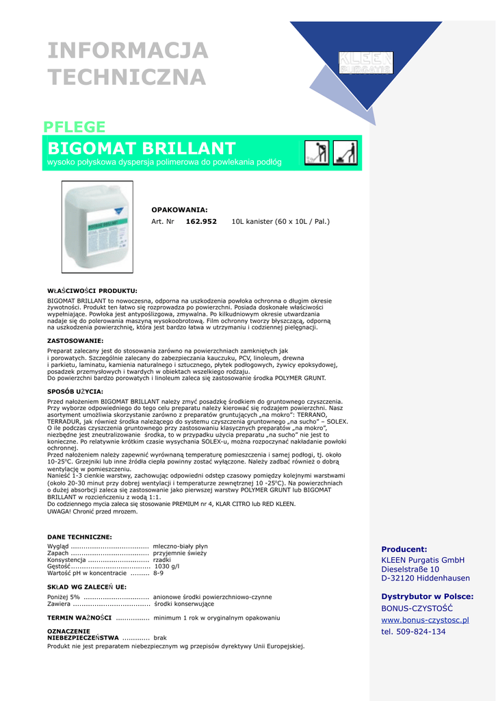 INFORMACJA TECHNICZNA PFLEGE BIGOMAT BRILLANT wysoko połyskowa dyspersja polimerowa do powlekania podłóg OPAKOWANIA: Art. Nr 162.952 10L kanister (60 x 10L / Pal.) WŁAŚCIWOŚCI PRODUKTU: BIGOMAT BRILLANT to nowoczesna, odporna na uszkodzenia powłoka ochronna o długim okresie żywotności. Produkt ten łatwo się rozprowadza po powierzchni. Posiada doskonałe właściwości wypełniające. Powłoka jest antypoślizgowa, zmywalna. Po kilkudniowym okresie utwardzania nadaje się do polerowania maszyną wysokoobrotową. Film ochronny tworzy błyszczącą, odporną na uszkodzenia powierzchnię, która jest bardzo łatwa w utrzymaniu i codziennej pielęgnacji. ZASTOSOWANIE: Preparat zalecany jest do stosowania zarówno na powierzchniach zamkniętych jak i porowatych. Szczególnie zalecany do zabezpieczania kauczuku, PCV, linoleum, drewna i parkietu, laminatu, kamienia naturalnego i sztucznego, płytek podłogowych, żywicy epoksydowej, posadzek przemysłowych i twardych w obiektach wszelkiego rodzaju. Do powierzchni bardzo porowatych i linoleum zaleca się zastosowanie środka POLYMER GRUNT. SPOSÓB UŻYCIA: Przed nałożeniem BIGOMAT BRILLANT należy zmyć posadzkę środkiem do gruntownego czyszczenia. Przy wyborze odpowiedniego do tego celu preparatu należy kierować się rodzajem powierzchni. Nasz asortyment umożliwia skorzystanie zarówno z preparatów gruntujących „na mokro”: TERRANO, TERRADUR, jak również środka należącego do systemu czyszczenia gruntownego „na sucho” – SOLEX. O ile podczas czyszczenia gruntownego przy zastosowaniu klasycznych preparatów „na mokro”, niezbędne jest zneutralizowanie środka, to w przypadku użycia preparatu „na sucho” nie jest to konieczne. Po relatywnie krótkim czasie wysychania SOLEX-u, można rozpoczynać nakładanie powłoki ochronnej. Przed nałożeniem należy zapewnić wyrównaną temperaturę pomieszczenia i samej podłogi, tj. około 10-25oC. Grzejniki lub inne źródła ciepła powinny zostać wyłączone. Należy zadbać również o dobrą wentylację w pomieszczeniu. Nanieść 1-3 cienkie warstwy, zachowując odpowiedni odstęp czasowy pomiędzy kolejnymi warstwami (około 20-30 minut przy dobrej wentylacji i temperaturze zewnętrznej 10 -25oC). Na powierzchniach o dużej absorbcji zaleca się zastosowanie jako pierwszej warstwy POLYMER GRUNT lub BIGOMAT BRILLANT w rozcieńczeniu z wodą 1:1. Do codziennego mycia zaleca się stosowanie PREMIUM nr 4, KLAR CITRO lub RED KLEEN. UWAGA! Chronić przed mrozem. DANE TECHNICZNE: Wygląd ..................................... Zapach ..................................... Konsystencja ............................. Gęstość ..................................... Wartość pH w koncentracie ......... mleczno-biały płyn przyjemnie świeży rzadki 1030 g/l 8-9 Producent: KLEEN Purgatis GmbH Dieselstraße 10 D-32120 Hiddenhausen SKŁAD WG ZALECEŃ UE: Poniżej 5% ............................... anionowe środki powierzchniowo-czynne Zawiera .................................... środki konserwujące TERMIN WAŻNOŚCI ................ minimum 1 rok w oryginalnym opakowaniu OZNACZENIE NIEBEZPIECZEŃSTWA ............. brak Produkt nie jest preparatem niebezpiecznym wg przepisów dyrektywy Unii Europejskiej. Dystrybutor w Polsce: BONUS-CZYSTOŚĆ Producent: www.bonus-czystosc.pl KLEEN Purgatis GmbH Dieselstraße 10 tel. 509-824-134 D-32120 Hiddenhausen Dystrybutor w Polsce: POLOR Sp. z o.o. ul. W adys awa IV 1 70-651 Szczecin tel. +48 (091) 8101250