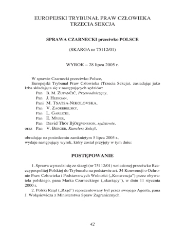 EUROPEJSKI TRYBUNAŁ PRAW CZŁOWIEKA TRZECIA SEKCJA SPRAWA CZARNECKI przeciwko POLSCE (SKARGA nr 75112/01) WYROK – 28 lipca 2005 r. W sprawie Czarnecki przeciwko Polsce, Europejski Trybunał Praw Człowieka (Trzecia Sekcja), zasiadając jako Izba składająca się z następujących sędziów: Pan B. M. ZUPANČIČ, Przewodniczący, Pan J. HEDIGAN, Pani M. TSATSA-NIKOLOVSKA, Pan V. ZAGREBELSKY, Pan L. GARLICKI, Pan E. MYJER, Pan David ThÓr BjÖrgvINSSON, sędziowie, oraz Pan V. BERGER, Kanclerz Sekcji, obradując na posiedzeniu zamkniętym 5 lipca 2005 r., wydaje następujący wyrok, który został przyjęty w tym dniu: POSTĘPOWANIE 1. Sprawa wywodzi się ze skargi (nr 75112/01) wniesionej przeciwko Rzeczypospolitej Polskiej do Trybunału na podstawie art. 34 Konwencji o Ochronie Praw Człowieka i Podstawowych Wolności („Konwencja”) przez obywatela polskiego, pana Marka Czarneckiego („skarżący”), w dniu 11 stycznia 2000 r. 2. Polski Rząd („Rząd”) reprezentowany był przez swojego Agenta, pana J. Wołąsiewicza z Ministerstwa Spraw Zagranicznych. 42 3. W dniu 16 marca 2004 r. Przewodniczący Trzeciej Sekcji zdecydował o zakomunikowaniu niniejszej skargi Rządowi. Na podstawie art. 29 § 3 Konwencji zdecydowano także o równoczesnym zbadaniu przedmiotu skargi i jej dopuszczalności. FAKTY I. OKOLICZNOŚCI SPRAWY 4. Skarżący urodził się w 1965 r. i mieszka w Lublinie, w Polsce. A. Tymczasowe aresztowanie 5. 3 stycznia 1996 r. skarżący został zatrzymany przez policję. 5 stycznia 1996 r. Prokurator Rejonowy w Lublinie przedstawił skarżącemu zarzuty zabójstwa i kradzieży oraz zastosował wobec niego tymczasowe aresztowanie. Według prokuratora tymczasowe aresztowanie skarżącego było konieczne, ponieważ istniało niebezpieczeństwo wywierania przez niego presji na świadków. Ponadto czyny zarzucane skarżącemu charakteryzowały się znaczną szkodliwością społeczną. 6. 22 lutego 1996 r. skarżący zwrócił się z wnioskiem o uchylenie tymczasowego aresztowania, ale jego wniosek został oddalony przez prokuratora w dniu 23 lutego 1996 r. 7. 13 listopada 1996 r. skarżącego postawiono w stan oskarżenia przed Sądem Wojewódzkim w Lublinie. 8. 27 października, 8 i 10 grudnia 1997 r. oraz 15 stycznia i 25 lutego 1998 r. Sąd Wojewódzki w Lublinie przeprowadził rozprawy w sprawie skarżącego. Podczas tych rozpraw sąd przedłużył tymczasowe aresztowanie wobec skarżącego. 9. 31 marca 1998 r. Sąd Wojewódzki w Lublinie wydał wyrok, w którym uznał skarżącego winnym zarzucanych mu czynów i skazał go na dwanaście lat pozbawienia wolności. 10. Skarżący wniósł apelację od tego wyroku i w dniu 13 sierpnia 1998 r. Sąd Apelacyjny w Lublinie uchylił wyrok skazujący i przekazał sprawę Sądowi Wojewódzkiemu w Lublinie do ponownego rozpatrzenia. 11. W dniach 15 września i 17 grudnia 1998 r. sąd pierwszej instancji przeprowadził rozprawy. 15 grudnia 1998 r. sąd ponownie przedłużył tymczasowe aresztowanie skarżącego, opierając się na mocnym podejrzeniu, że skarżący popełnił zarzucane mu czyny oraz na charakterze tych czynów. 12. 23 marca 1999 r. Sąd Okręgowy w Lublinie przedłużył tymczasowe aresztowanie skarżącego. Skarżący wniósł zażalenie na to postanowienie, jednak zostało ono oddalone w dniu 14 kwietnia 1999 r. przez Sąd Apelacyjny 43 w Lublinie. Sąd odwoławczy podał następujące uzasadnienie do swojego postanowienia: „Marek Czarnecki stoi pod zarzutem popełnienia zbrodni z art. 148 § 1 k.k. zagrożonej karą pozbawienia wolności, której górna granica przekracza 8 lat. Zatem zgodnie z treścią art. 258 § 2 k.p.k., w takiej sytuacji prawnej, potrzeba zastosowania tymczasowego aresztowania w celu zabezpieczenia prawidłowego toku postępowania może być uzasadniona grożącą oskarżonemu surową karą; nie jest więc wymagane w omawianych okolicznościach, aby dla zastosowania (czy dalszego stosowania) tymczasowego aresztowania było konieczne wykazywanie innych przesłanek np. w postaci obawy ukrywania się przez oskarżonego bądź utrudniania przez niego postępowania. Nie można też podzielić argumentacji skarżącego, że dowody dotychczas zebrane nie wskazują na duże prawdopodobieństwo popełnienia przez niego przestępstwa. Uchylenie skazującego wyroku przez Sąd Apelacyjny było następstwem uchybień procesowych, popełnionych przez Sąd I Instancji, które nie pozwalały na 100% pewne ustalenia, że oskarżony popełnił zarzucone mu przestępstwo. Czym innym jest jednak całkowita pewność – ta tylko bowiem może być podstawą skazania, a czym innym duże prawdopodobieństwo popełnienia przestępstwa. Dowody dotychczas zebrane wskazują, zdaniem Sądu Apelacyjnego, na istnienie dużego prawdopodobieństwa popełnienia przez oskarżonego zarzucanego mu czynu. Tym samym została też spełniona przesłanka z art. 249 § 1 k.p.k. Przy braku powodów do odstąpienia od tymczasowego aresztowania (art. 259 § 1 k.p.k.) należało orzec, jak na wstępie”. 13. Skarżący wniósł zażalenie na postanowienie z dnia 14 kwietnia 1999 r., ale zostało ono odrzucone w dniu 10 maja 1999 r. przez Prezesa Sądu Apelacyjnego w Lublinie, ponieważ nie było przewidziane przez prawo. Skarżący wniósł kolejne zażalenie do Sądu Najwyższego, ale w dniu 18 sierpnia 1999 r. zostało ono odrzucone z tego samego powodu co poprzednio. 14. Skarżący złożył nowy wniosek o uchylenie tymczasowego aresztowania, ale został on oddalony w dniu 14 września 1999 r. przez Sąd Okręgowy w Lublinie. Sąd przedstawił następujące uzasadnienie swego postanowienia: „Marek Czarnecki stoi pod zarzutem dokonania zbrodni z art. 148 § 1 k.k. We wniosku podnosi fakt przedłużającego się postępowania sądowego jak też konieczność roztoczenia opieki nad rodzicami. Zdaniem Sądu Okręgowego obie okoliczności podniesione przez oskarżonego nie zasługują na uwzględnienie. Nie z winy Sądu Okrę