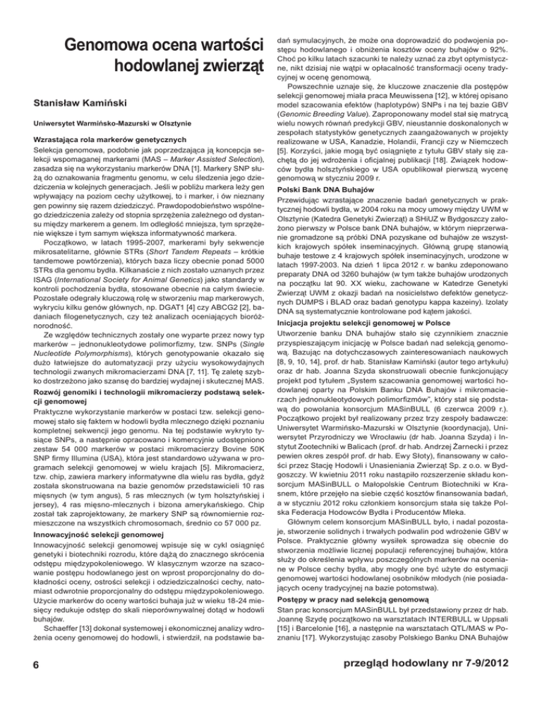 Genomowa ocena wartości hodowlanej zwierząt Stanisław Kamiński Uniwersytet Warmińsko-Mazurski w Olsztynie Wzrastająca rola markerów genetycznych Selekcja genomowa, podobnie jak poprzedzająca ją koncepcja selekcji wspomaganej markerami (MAS – Marker Assisted Selection), zasadza się na wykorzystaniu markerów DNA [1]. Markery SNP służą do oznakowania fragmentu genomu, w celu śledzenia jego dziedziczenia w kolejnych generacjach. Jeśli w pobliżu markera leży gen wpływający na poziom cechy użytkowej, to i marker, i ów nieznany gen powinny się razem dziedziczyć. Prawdopodobieństwo wspólnego dziedziczenia zależy od stopnia sprzężenia zależnego od dystansu między markerem a genem. Im odległość mniejsza, tym sprzężenie większe i tym samym większa informatywność markera. Początkowo, w latach 1995-2007, markerami były sekwencje mikrosatelitarne, głównie STRs (Short Tandem Repeats – krótkie tandemowe powtórzenia), których baza liczy obecnie ponad 5000 STRs dla genomu bydła. Kilkanaście z nich zostało uznanych przez ISAG (International Society for Animal Genetics) jako standardy w kontroli pochodzenia bydła, stosowane obecnie na całym świecie. Pozostałe odegrały kluczową rolę w stworzeniu map markerowych, wykryciu kilku genów głównych, np. DGAT1 [4] czy ABCG2 [2], badaniach filogenetycznych, czy też analizach oceniających bioróżnorodność. Ze względów technicznych zostały one wyparte przez nowy typ markerów – jednonukleotydowe polimorfizmy, tzw. SNPs (Single Nucleotide Polymorphisms), których genotypowanie okazało się dużo łatwiejsze do automatyzacji przy użyciu wysokowydajnych technologii zwanych mikromacierzami DNA [7, 11]. Tę zaletę szybko dostrzeżono jako szansę do bardziej wydajnej i skutecznej MAS. Rozwój genomiki i technologii mikromacierzy podstawą selekcji genomowej Praktyczne wykorzystanie markerów w postaci tzw. selekcji genomowej stało się faktem w hodowli bydła mlecznego dzięki poznaniu kompletnej sekwencji jego genomu. Na tej podstawie wykryto tysiące SNPs, a następnie opracowano i komercyjnie udostępniono zestaw 54 000 markerów w postaci mikromacierzy Bovine 50K SNP firmy Illumina (USA), która jest standardowo używana w programach selekcji genomowej w wielu krajach [5]. Mikromacierz, tzw. chip, zawiera markery informatywne dla wielu ras bydła, gdyż została skonstruowana na bazie genomów przedstawicieli 10 ras mięsnych (w tym angus), 5 ras mlecznych (w tym holsztyńskiej i jersey), 4 ras mięsno-mlecznych i bizona amerykańskiego. Chip został tak zaprojektowany, że markery SNP są równomiernie rozmieszczone na wszystkich chromosomach, średnio co 57 000 pz. Innowacyjność selekcji genomowej Innowacyjność selekcji genomowej wpisuje się w cykl osiągnięć genetyki i biotechniki rozrodu, które dążą do znacznego skrócenia odstępu międzypokoleniowego. W klasycznym wzorze na szacowanie postępu hodowlanego jest on wprost proporcjonalny do dokładności oceny, ostrości selekcji i odziedziczalności cechy, natomiast odwrotnie proporcjonalny do odstępu międzypokoleniowego. Użycie markerów do oceny wartości buhaja już w wieku 18-24 miesięcy redukuje odstęp do skali nieporównywalnej dotąd w hodowli buhajów. Schaeffer [13] dokonał systemowej i ekonomicznej analizy wdrożenia oceny genomowej do hodowli, i stwierdził, na podstawie ba- 6 dań symulacyjnych, że może ona doprowadzić do podwojenia postępu hodowlanego i obniżenia kosztów oceny buhajów o 92%. Choć po kilku latach szacunki te należy uznać za zbyt optymistyczne, nikt dzisiaj nie wątpi w opłacalność transformacji oceny tradycyjnej w ocenę genomową. Powszechnie uznaje się, że kluczowe znaczenie dla postępów selekcji genomowej miała praca Meuwissena [12], w której opisano model szacowania efektów (haplotypów) SNPs i na tej bazie GBV (Genomic Breeding Value). Zaproponowany model stał się matrycą wielu nowych równań predykcji GBV, nieustannie doskonalonych w zespołach statystyków genetycznych zaangażowanych w projekty realizowane w USA, Kanadzie, Holandii, Francji czy w Niemczech [5]. Korzyści, jakie mogą być osiągnięte z tytułu GBV stały się zachętą do jej wdrożenia i oficjalnej publikacji [18]. Związek hodowców bydła holsztyńskiego w USA opublikował pierwszą wycenę genomową w styczniu 2009 r. Polski Bank DNA Buhajów Przewidując wzrastające znaczenie badań genetycznych w praktycznej hodowli bydła, w 2004 roku na mocy umowy między UWM w Olsztynie (Katedra Genetyki Zwierząt) a SHiUZ w Bydgoszczy założono pierwszy w Polsce bank DNA buhajów, w którym nieprzerwanie gromadzone są próbki DNA pozyskane od buhajów ze wszystkich krajowych spółek inseminacyjnych. Główną grupę stanowią buhaje testowe z 4 krajowych spółek inseminacyjnych, urodzone w latach 1997-2003. Na dzień 1 lipca 2012 r. w banku zdeponowano preparaty DNA od 3260 buhajów (w tym także buhajów urodzonych na początku lat 90. XX wieku, zachowane w Katedrze Genetyki Zwierząt UWM z okazji badań na nosicielstwo defektów genetycznych DUMPS i BLAD oraz badań genotypu kappa kazeiny). Izolaty DNA są systematycznie kontrolowane pod kątem jakości. Inicjacja projektu selekcji genomowej w Polsce Utworzenie banku DNA buhajów stało się czynnikiem znacznie przyspieszającym inicjację w Polsce badań nad selekcją genomową. Bazując na dotychczasowych zainteresowaniach naukowych [8, 9, 10, 14], prof. dr hab. Stanisław Kamiński (autor tego artykułu) oraz dr hab. Joanna Szyda skonstruowali obecnie funkcjonujący projekt pod tytułem „System szacowania genomowej wartości hodowlanej oparty na Polskim Banku DNA Buhajów i mikromacierzach jednonukleotydowych polimorfizmów”, który stał się podstawą do powołania konsorcjum MASinBULL (6 czerwca 2009 r.). Początkowo projekt był realizowany przez trzy zespoły badawcze: Uniwersytet Warmińsko-Mazurski w Olsztynie (koordynacja), Uniwer