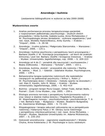 Anoreksja i bulimia (zestawienie bibliograficzne w wyborze za lata 2000-2008) Wydawnictwa zwarte 1. Analiza porównawcza procesu terapeutycznego pacjentek z rozpoznaniem jadłowstrętu psychicznego : studium dwóch przypadków / Anita Sumiła, Izabela Łucka, Anna Michalewska // W: Psychopatologia okresu dorastania : wybrane zagadnienia / pod red. nauk. Wioletty Radziwiłłowicz, Anity Sumiły. – Kraków : "Impuls", 2006. – S. 39-58 2. Anoreksja : trudne pytania / Małgorzata Starzomska. – Warszawa : "Impuls", 2006. – 125 s. 3. Anoreksja i bulimia psychiczna z perspektywy teorii przywiązania / Barbara Józefik // W: Koncepcja przywiązania : od teorii do praktyki klinicznej / pod red. Barbary Józefik i Grzegorza Iniewicza. – Kraków : Wydaw. Uniwersytetu Jagiellońskiego, cop. 2008. – S. 209-223 4. Anoreksja od A do Z : poradnik dla nauczycieli i wychowawców / Beata Ziółkowska. – Warszawa : "Scholar", 2005. – 103 s. 5. Anoreksja, bulimia, otyłość : przewodnik dla rodziców / Martha M. Jablow. – Wyd. 2. – Gdańsk : Gdańskie Wydaw. Psychologiczne, 2000. – 139 s. 6. Behawioralna terapia systemów rodzinnych dla nastolatków cierpiących na jadłowstręt psychiczny / Arthur L. Robin // W: Psychoterapia dzieci i młodzieży : metody oparte na dowodach / red. Alan E. Kazdin, John R. Weisz. – Kraków : Wydaw. Uniwersytetu Jagiellońskiego, 2006. – S. 402-419 7. Bulimia : program terapii Myra Cooper, Gillian Todd, Adrian Wells. – Poznań : Zysk i S-ka Wydaw., cop. 2005. – 250 s. 8. Etiologia anorexia nervosa z perspektywy funkcjonowania rodziny oraz relacji w diadzie matka-dziecko / Magdalena Muszalska // W: Wspomaganie rozwoju : psychostymulacja i psychokorekcja. T. 6 / red. Barbara Kaja. – Bydgoszcz : Wydaw. Akademii Bydgoskiej im. Kazimierza Wielkiego, 2004. – S. 73-102 9. Etiopatogeneza i terapia zaburzeń odżywiania się w perspektywie rodzinnej / Katarzyna Palus // W: Obrazy życia rodzinnego z perspektywy interdyscyplinarnej / red. nauk. Anna Michalska. – Poznań : Wydaw. Naukowe Uniwersytetu im. Adama Mickiewicza, 2007. – S. 235-253 10. Gotowość anorektyczna - zagrożenie współczesności? / Wioleta Chytra, Anna Kobieracka // W: Psychologia w życiu osobistym i zawodowym człowieka : praca zbiorowa / pod red. Joanny Rajang i Joanny Lessing-Pernak. – Bydgoszcz : Wydaw. Uniwersytetu Kazimierza Wielkiego, 2008. – S. 18-27 Materiały z ogólnopolskiej studenckiej konferencji naukowej, 22 maja 2007 r., Bydgoszcz 11. Jedzenie / Iwona Niewiadomska, Agnieszka Kulik, Agnieszka Hajduk Lublin : Wydaw. Katolickiego Uniwersytetu Lubelskiego : "Gaudium", 2005. – 278 s. 12. Materiały dydaktyczne do zajęć z wychowania zdrowotnego i promocji zdrowia / Katarzyna Sygit. – Szczecin : Wydaw. Naukowe Uniwersytetu Szczecińskiego, 2008. – S. 53-61: Zaburzenia w odżywianiu 13. Na obrzeżach społeczeństwa : samowykluczenie i wykluczenie ze społeczeństwa chorych na anorexia nervosa / Sabina Bieniecka // W: Ekskluzja i inkluzja społeczna : diagnoza, uwarunkowania, kierunki działań / red. nauk. Jolanta Grotowska-Leder, Krystyna Faliszek. – Toruń : "Akapit", 2005. – S. 175-192 14. Ocalić Ofelię od anoreksji : analiza kulturowych przyczyn zaburzeń jedzenia wśród dziewczynek i dziewcząt / Monika Ksieniewicz // W: Dziecko w świecie mediów i konsumpcji / pod red. Małgorzaty Boguni-Borowskiej. – Kraków : Wydaw. Uniwersytetu Jagiellońskiego, 2006. – S. 177-203 15. Patologie wśród dzieci i młodzieży : leczenie i profilaktyka / Stanisław Kozak. – Warszawa : "Difin", cop. 2007. – S. 23-28: Uzależnienia od odżywiania: anoreksja i bulimia 16. Pedagogiczna diagnoza i profilaktyka zaburzeń odżywiania się u młodzieży szkolnej / Marta Kowalczuk. – Kraków : "Impuls", 2008. – 216 s. 17. Podmiotowe i społeczno-kulturowe uwarunkowania anoreksji : wybrane zagadnienia / red. nauk. Anna Suchańska. – Poznań : Wydaw. Fundacji "Humaniora", 2000. – 288 s. 18. Poznawczy model bulimii / Daniel le Grange // W: Psychoterapia poznawcza w teorii i praktyce / red. Mark A. Reinecke, David A. Clark. – Gdańsk : Gdańskie Wydaw. Psychologiczne, 2005. – S. 323-346 19. Profilaktyka społeczna : rodzina, szkoła, środowisko lokalne / Monika Szpringer. – Kielce : Wydaw. Akademii Świętokrzyskiej, 2004. – S. 119-208: Rozmiary zjawisk patologii społecznej w Polsce i we Włoszech 20. Psychologia : mózg, człowiek, świat / Stephen M. Kosslyn, Robin S. Rosenberg. – Kraków : "Znak", 2006. – S. 622-671: Zaburzenia psychiczne 21. Psychopatologia / John D. Stirling, Jonathan S. E. Hellewell. – Gdańsk : Gdańskie Wydaw. Psychologiczne, 2005. – S. 112-122: Zaburzenia odżywiania 22. Pułapka anoreksji : dlaczego się choruje, jak wyzdrowieć / Valerio Albisetti. – Wyd. 2. – Kielce : "Jedność", 2003. – 171 s. 23. Relacje rodzinne w anoreksji i bulimii psychicznej / Barbara Józefik. – Kraków : Wydaw. Uniwersytetu Jagiellońskiego, cop. 2006. – 227 s. 24. Religijność i anoreksja - rola poradnictwa / Małgorzata Starzomska // W: Podstawowe zagadnienia psychologii religii : praca zbiorowa / pod red. Stanisława Głaza. – Kraków : Wydaw. WAM, 2006. – S. 546-561 25. Samotność globalnego nastolatka / Janusz Mastalski. – Kraków : Wydaw. Naukowe Papieskiej Akademii Teologicznej, 2007. – S. 383-400: Choroby XXI wieku 26. Stawić czoło uzależnieniom : alkohol, nikotyna, narkotyki, hazard / Charly Cungi. – Warszawa : "Pax", 2007. – S. 204-281: Różne rodzaje uzależnień 27. Stres w bulimii psychicznej - konfrontacja czy unikanie problemu? / Anna Brytek-Matera // W: Jakość życia współczesnego człowieka : wybrane problemy / pod red. nauk. Agnieszki Gawor i Alicji Głębockiej. – Kraków : "Impuls", 2008. – S. 49-58 28. Terapia nastolatków / Neil G. Ribner. – Gdańsk : Gdańskie Wydaw. Psychologiczne, 2005. – S. 47-73: Opis problemu Dot. zaburzeń emocjonalnych, zaburzeń zachowania, zagadni