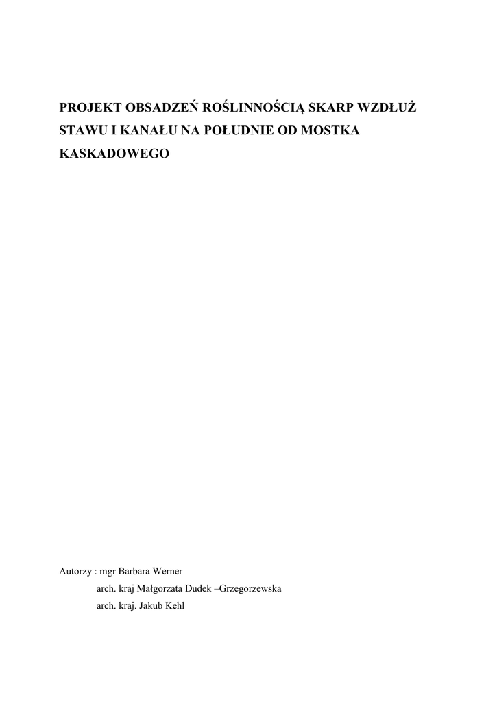 PROJEKT OBSADZEŃ ROŚLINNOŚCIĄ SKARP WZDŁUŻ STAWU I KANAŁU NA POŁUDNIE OD MOSTKA KASKADOWEGO Autorzy : mgr Barbara Werner arch. kraj Małgorzata Dudek –Grzegorzewska arch. kraj. Jakub Kehl CZĘŚĆ OPISOWA: 1. Informacje wstępne. 1.1. Dane podstawowe, 1.2. Przedmiot opracowania, 1.4. Lokalizacja terenu opracowania, 1.5. Ochrona zabytków, 2. Projektowana roślinność. 3. Wykazy gatunkowe i ilościowe projektowanych roślin. 4. Charakterystyka roślinności istniejącej CZĘŚĆ RYSUNKOWA: 1. Kompozycja i dobór gatunkowy roślinności, skala 1:500, rys. nr 01 1. Informacje wstępne 1.1. Dane podstawowe Obiekt: Muzeum Łazienki Królewskie w Warszawie ul. Agrykola 1, 00-460 Warszawa Inwestor: Muzeum Łazienki Królewskie w Warszawie ul. Agrykola 1, 00-460 Warszawa 1.2. Przedmiot opracowania Przedmiotem opracowania jest projekt doboru gatunkowego roślinności w strefie przybrzeżnej i części brzegowej oraz bagiennej stawu i kanału części Ogrodu Zmysłów i Żywiołów w Muzeum Łazienki Królewskie w Warszawie 1.3. Lokalizacja terenu opracowania Teren opracowania obejmuje częściowy obszar Ogrodu Zmysłów i Żywiołów zawarty pomiędzy: mostem kaskadowym, ogrodzeniem od strony ul. Gagarina, kanałem parkowym oraz alejką rozgraniczającą Ogród Nowej Oranżerii Granice opracowania przedstawiono graficznie na planie w skali 1:500, rys nr 01 1.3. Ochrona zbytków Zespół pałacowo- parkowy Łazienki Królewskie w Warszawie został wpisany do rejestru zabytków Miasta Stołecznego Warszawy pod nr rejestru 2/1 1 lipca 1965 r. na mocy Decyzji w Sprawie Wpisania Dobra Kultury do Rejestru Zabytków na podstawie art. 5 pkt 1 art. 8 ust.1 pkt. 2 i art. 14 ust. 1 pk.t 1 ustawy z dnia 15 lutego 1962 o ochronie dóbr kultury i o muzeach) Dz. U. nr 10, poz.48 i z 1983 r. nr 38, poz. 173) oraz art.104 kpa. 2. Projektowana roślinność. W projekcie opracowano kompozycję i dobory gatunkowe roślinności: wodnej i nadwodnej, kwiaty, runo parkowe, trawniki. Wykazy gatunkowe i ilościowe przedstawiono zachowując numerację ciągłą dla całości obszaru opracowania. Roślinność nadwodna/runa Roślinność projektowana jest w celu podnoszenia wartości estetycznych i biologicznych zbiorników wodnych. Przed wykonaniem nasadzeń roślinnych należy wzbogacić środowisko glebowe brzegów ziemią urodzajną, kompostową w celu poprawienia jej struktury. Wprowadza się obsadzenia odpowiednimi gatunkami roślin okrywowych mało wymagających, wytrzymałych na trudne warunki siedliskowe. Aby podkreślić charakter wnętrz oraz złagodzić alejową linię drzew w strefie brzegowej zastosowano rośliny ozdobne z liści o różnych odcieniach zieleni. Są to rośliny niskie i średnio wysokie. W celu uzyskania zamierzonego efektu zastosowano dostatecznie duże grupy bylin. Byliny niskie i średnio wysokie, sadzone w dużych grupach dadzą pożądany efekt. Byliny te dzięki ozdobnym liściom stwarzających wrażenie dużej masy zieleni, będą kwitły w różnych okresach. Rośliny wodne Ze względu na cenną właściwość roślin podwodnych jaką jest ich efektywność w wykorzystywaniu nadmiaru substancji odżywczych w wodzie wprowadza się określoną grupę roślin wodnych. Ułatwia to utrzymanie jej w czystości i ogranicza dostęp pokarmu glonom, odpowiedzialnym za zabarwianie wody na zielono tzw. zakwity oraz utrzymanie prawidłowej równowagi biologicznej. W celu szybszego i łatwiejszego ukorzenienia się roślinności wodnej należy zastosować koszyki lub worki jutowe z odpowiednio przygotowanym podłożem. Zastosowane podłoże powinno zawierać mieszankę gliny z piaskiem w stosunku 1:2. Wierzchnią warstwę podłoża w pojemniku należy dodatkowo zabezpieczyć czystym żwirem. ZESTAWIENIE POWIERZCHNI PROJEKTOWANYCH: - trawniki parkowe – 6 056,2 m2 - rośliny wodne – 532,5 m2 - rośliny nadwodne- 960,7 m2 - rośliny okrywowe – 2 808,6 m2 - rośliny wiosenne-132 m2 - rośliny cebulowe- 207,2 m2 WYKAZ MATERIAŁU ROŚLINNEGO: Ilość na nr wykazu nazwa polska nazwa łacińska odmiana Pow. w rozstawa m2 m2 40x40 7 87,5 40x40 7 110 40x40 7 167 0,25 168 rośliny wodne 1 Grzybieńczyk wodny Nymphoides peltata Sagittaria 2 Strzałka wodna sagittifolia 3 Grzybień biały Nymphaea alba 4 Grążel żółty Nuphar luteum White Sultan rośliny nadwodne 5 Funkia rozdęta Hosta ventricosa 30x40 9 264,3 ligularia dentata 40x60 4 288,2 30x30 11 172 25x25 16 31,3 Języczka 6 pomarańczowa Iris ensata 7 Kosacieć japoński Irys japonica 8 Mięta nadwodna Mentha aquatica Azure Menyanthes 9 Bobrek trójlistkowy trifoliata L 10x10 100 22,9 10 Czermień błotna Calla palustris 30x30 11 45,7 11 Kaczeniec błotny Caltha palustris 20x30 17 136,3 25x40 10 2420,8 Green Carpet 20x25 20 387,8 blue 15x20 32 100 alba 15x20 32 32 Duch Master 10x15 66 61,4 10x11 100 53,5 rośliny okrywowe kwiaty w kolorze 12 Barwinek mniejszy Vinca minor niebieskim Pachysandra 13 Rumianka japońska terminalis rośliny wiosenne 14 Niezapominajka leśna Myosotis sylvatica 15 Narcyz Narcissus 16 Cebulica syberyjska Scilla siberica Ispring Beauty ILOŚĆ ROŚLIN: 1. Grzybieńczyk wodny Nymphoides peltata- 875 szt. 2. Strzałaka wodna Sagittaria sagittifolia- 770 szt. 3. Grzybień biały Nymphaea alba ‘White Sultan’- 1 165 szt. 4. Grążel żółty Nuphar luteum- 46 szt. 5. Funkia rozdęta Hosta ventricosa- 2 379 szt. 6. Języczka pomarańczowa Ligularia dentata- 1 153 szt. 7. Kosacieć japoński Irys japonica ‘ensata Azure’- 1 892 szt. 8. Mieta nadwodna Mentha aquatica- 500 szt. 9. Bobrek trójlistkowy Menyanthes trifoliata L- 2 290 szt. 10. Czermień błotna Calla palustris- 503 szt. 11. Kaczeniec błotny Caltha palustris- 2 317 szt. 12. Barwinek mniejszy Vinca minor- 24 210 szt. 13. Rumianka japońska Pachysandra terminali ‘Green Carpet’- 7 753 szt. 14. Niezapominajka leśna Myosotis sylvatica ’Blue’- 3 200 szt. ‘ White’- 1 024 szt. 15. Narcyz trąbkowy Narcissus pseudonarcissus ‘Dutch Master’- 4 0