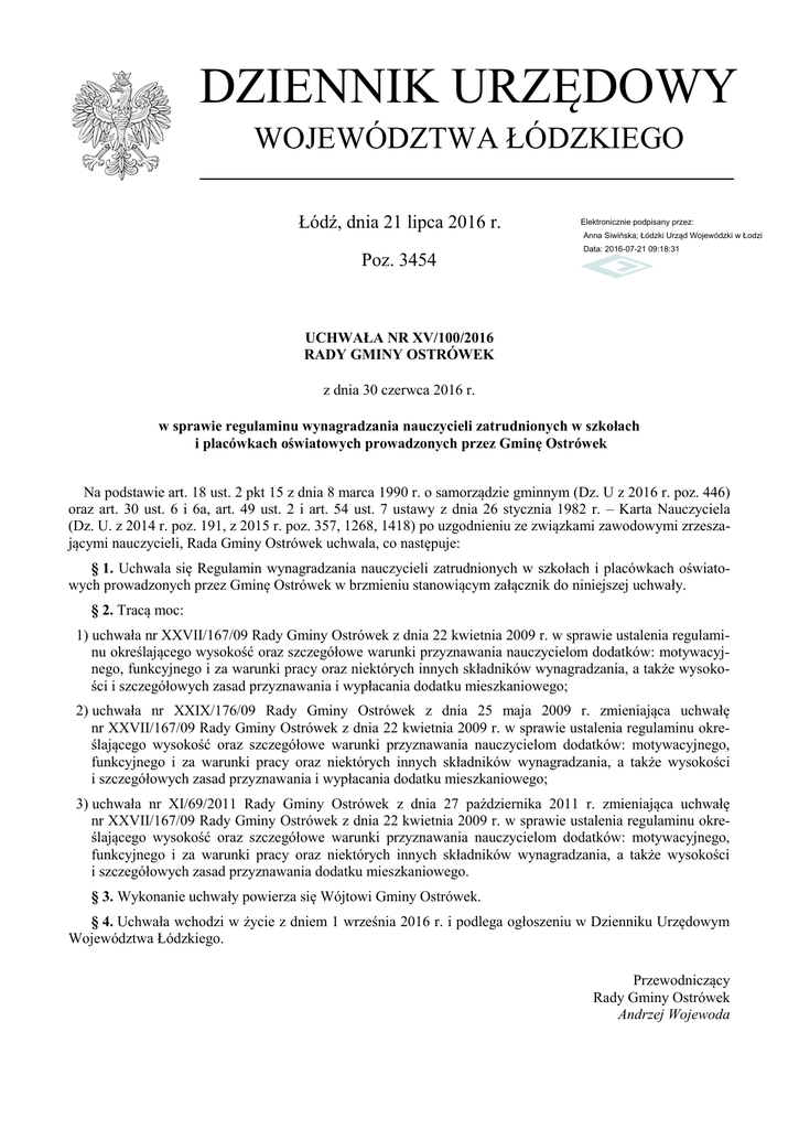 DZIENNIK URZĘDOWY WOJEWÓDZTWA ŁÓDZKIEGO Łódź, dnia 21 lipca 2016 r. Elektronicznie podpisany przez: Anna Siwińska; Łódzki Urząd Wojewódzki w Łodzi Poz. 3454 Data: 2016-07-21 09:18:31 UCHWAŁA NR XV/100/2016 RADY GMINY OSTRÓWEK z dnia 30 czerwca 2016 r. w sprawie regulaminu wynagradzania nauczycieli zatrudnionych w szkołach i placówkach oświatowych prowadzonych przez Gminę Ostrówek Na podstawie art. 18 ust. 2 pkt 15 z dnia 8 marca 1990 r. o samorządzie gminnym (Dz. U z 2016 r. poz. 446) oraz art. 30 ust. 6 i 6a, art. 49 ust. 2 i art. 54 ust. 7 ustawy z dnia 26 stycznia 1982 r. – Karta Nauczyciela (Dz. U. z 2014 r. poz. 191, z 2015 r. poz. 357, 1268, 1418) po uzgodnieniu ze związkami zawodowymi zrzeszającymi nauczycieli, Rada Gminy Ostrówek uchwala, co następuje: § 1. Uchwala się Regulamin wynagradzania nauczycieli zatrudnionych w szkołach i placówkach oświatowych prowadzonych przez Gminę Ostrówek w brzmieniu stanowiącym załącznik do niniejszej uchwały. § 2. Tracą moc: 1) uchwała nr XXVII/167/09 Rady Gminy Ostrówek z dnia 22 kwietnia 2009 r. w sprawie ustalenia regulaminu określającego wysokość oraz szczegółowe warunki przyznawania nauczycielom dodatków: motywacyjnego, funkcyjnego i za warunki pracy oraz niektórych innych składników wynagradzania, a także wysokości i szczegółowych zasad przyznawania i wypłacania dodatku mieszkaniowego; 2) uchwała nr XXIX/176/09 Rady Gminy Ostrówek z dnia 25 maja 2009 r. zmieniająca uchwałę nr XXVII/167/09 Rady Gminy Ostrówek z dnia 22 kwietnia 2009 r. w sprawie ustalenia regulaminu określającego wysokość oraz szczegółowe warunki przyznawania nauczycielom dodatków: motywacyjnego, funkcyjnego i za warunki pracy oraz niektórych innych składników wynagradzania, a także wysokości i szczegółowych zasad przyznawania i wypłacania dodatku mieszkaniowego; 3) uchwała nr XI/69/2011 Rady Gminy Ostrówek z dnia 27 października 2011 r. zmieniająca uchwałę nr XXVII/167/09 Rady Gminy Ostrówek z dnia 22 kwietnia 2009 r. w sprawie ustalenia regulaminu określającego wysokość oraz szczegółowe warunki przyznawania nauczycielom dodatków: motywacyjnego, funkcyjnego i za warunki pracy oraz niektórych innych składników wynagradzania, a także wysokości i szczegółowych zasad przyznawania dodatku mieszkaniowego. § 3. Wykonanie uchwały powierza się Wójtowi Gminy Ostrówek. § 4. Uchwała wchodzi w życie z dniem 1 września 2016 r. i podlega ogłoszeniu w Dzienniku Urzędowym Województwa Łódzkiego. Przewodniczący Rady Gminy Ostrówek Andrzej Wojewoda Dziennik Urzędowy Województwa Łódzkiego –2– Poz. 3454 Załącznik do uchwały nr XV/100/2016 Rady Gminy Ostrówek z dnia 30 czerwca 2016 r. REGULAMIN WYNAGRADZANIA NAUCZYCIELI ZATRUDNIONYCH W SZKOŁACH I PLACÓWKACH OŚWIATOWYCH PROWADZONYCH PRZEZ GMINĘ OSTRÓWEK Rozdział 1 Postanowienia ogólne § 1. 1. Regulamin wynagradzania nauczycieli zatrudnionych w szkołach i placówkach oświatowych prowadzonych przez Gminę Ostrówek, zwany dalej Regulaminem, określa: 1) wysokość stawek oraz szczegółowe zasady przyznawania dodatków do wynagrodzenia: a) za wysługę lat, b) motywacyjnego, c) funkcyjnego, d) za warunki pracy; 2) szczegółowe warunki obliczania i wypłacania wynagrodzenia za godziny ponadwymiarowe oraz za godziny doraźnych zastępstw. 2. Wysokość i warunki wypłacania nagród. 3. Dodatek mieszkaniowy. Rozdział 2 Dodatek za wysługę lat § 2. Dodatek za wysługę lat w wysokości i na zasadach określonych w Karcie Nauczyciela przysługuje: 1) od pierwszego dnia miesiąca, w którym nauczyciel nabył prawo do dodatku lub wyższej stawki dodatku, jeżeli nabycie prawa nastąpiło w ciągu miesiąca; 2) za dany miesiąc, jeżeli nabycie prawa do dodatku lub wyższej stawki dodatku nastąpiło pierwszego dnia miesiąca. Rozdział 3 Dodatek motywacyjny § 3. 1. Nauczycielowi, w tym nauczycielowi, któremu powierzono stanowisko dyrektora placówki, przyznaje się dodatek motywacyjny. 2. Warunkiem przyznania nauczycielowi dodatku motywacyjnego jest: 1) uzyskanie osiągnięć dydaktycznych, wychowawczych i opiekuńczych, a w szczególności: a) uzyskiwanie przez uczniów, z uwzględnieniem ich możliwości oraz warunków pracy nauczyciela, dobrych osiągnięć dydaktyczno-wychowawczych potwierdzonych wynikami klasyfikacji lub promocji, efektami egzaminów i sprawdzianów oraz sukcesami w konkursach, zawodach, olimpiadach, itp., b) umiejętne rozwiązywanie problemów wychowawczych uczniów we współpracy z ich rodzicami, c) pełne rozpoznanie środowiska wychowawczego uczniów, aktywne i efektywne działanie na rzecz uczniów potrzebujących szczególnej opieki; 2) jakość świadczonej pracy, w tym związanej z powierzonym stanowiskiem kierowniczym, dodatkowym zadaniem lub zajęciem, a w szczególności: a) systematyczne i efektywne przygotowanie się do przydzielonych obowiązków, Dziennik Urzędowy Województwa Łódzkiego –3– Poz. 3454 b) podnoszenie umiejętności zawodowych, c) wzbogacanie własnego warsztatu pracy, d) dbałość o estetykę i sprawność powierzonych pomieszczeń, pomocy dydaktycznych lub urządzeń szkolnych, e) w przypadku dyrektorów szkół i placówek oświatowych - prowadzenie racjonalnej polityki zatrudnienia, wykazywanie inicjatywy w zakresie pozyskiwania dodatkowych środków pozabudżetowych na rzecz szkoły; 3) zaangażowanie w realizację czynności i zajęć, o których mowa w art. 42 ust. 2 pkt 2 Karty Nauczyciela, a w szczególności: a) udział w organizowaniu imprez i uroczystości szkolnych, b) udział w komisjach przedmiotowych i innych, c) opiekowanie się samorządem uczniowskim lub innymi organizacjami uczniowskimi działającymi na terenie szkoły, d) prowadzenie lekcji koleżeńskich, przejawianie innych form aktywności w ramach wewnątrzszkolnego doskonalenia zawodowego nauczycieli, e) aktywny udział w realizowaniu innych zadań statutowych szkoły. § 4. 1. W