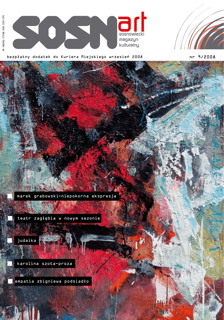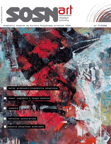 art SOSN JJ marek grabowski-niepokorna ekspresja JJ teatr zagłębia w nowym sezonie JJ judaika JJ karolina szota-proza JJempatia zbigniewa podsiadło sosnowiecki magazyn kulturalny grabowski marek Nazwisko Marka Grabowskiego niejako automatycznie wywołuje w mojej percepcji obraz złożony z ruchu i koloru, pulsujący, ekspresyjny i dynamiczny. Surowość materii, ciężka od farby struktura płótna, rozmach diagonalnych grubych kresek są elementami ukrytego kodu. Osobiście uważam, że przesłanie jakie się za tym kryje można by opisać militarnym nazewnictwem: opór, walka i chaos. Marek Grabowski walczy. Jest to rodzaj wysiłku skoncentrowany na zachowaniu artystycznego ego, wbrew tendencjom i modom. To niezłomne założenie, któremu artysta od lat jest wierny odnajdziemy także analizując działania artysty na polu rzeźby. Grabowski zrealizował między innymi metalowe rzeźby , których nie powstydzili by się ˝przedstawiciele awangardowego Dada. Tytuły jakie nadaje swym dziełom - enigmatyczne i poetyckie zarazem: „Wektory błądzące”, „Drabiny bezradne”, „Pomroczność niejasna” (w przypadku obrazów), czy „Kołyska grawitacji” (tytuł rzeźby) mają pozostać bez wyjaśnień, gdyż jak twierdzi sam artysta „Istotą sztuki jest walka i tajemnica (…)”. Niech Pan zatem walczy i tworzy Panie Marku. Adriana Zimnowoda Kozioł ofiarny Uzurpator Marek Grabowski urodził się w Sosnowcu. Jest absolwentem PWSSP w Poznaniu, członkiem ZPAP oraz Stowarzyszenia Pastelistów Polskich. Zdobywca Grand Prix na I Ogólnopolskim Biennale Pasteli w 1996 roku. Oprócz działalności na polu malarstwa, rysunku i rzeźby zajmuje się poezją*. Wystawa prac Marka Grabowskiego w najbliższym czasie odbędzie się w Sosnowcu. *mamy nadzieję, że niebawem Marek Grabowski udostępni swoje teksty poetyckie dla SOSNartu. Eskalacje 04 na okładce: Przewrotność purpury Kołyska grawitacji W padam do Teatru Zagłębia. Mam szczęście, bilety jeszcze są mimo, że często należy je rezerwować ze sporym wyprzedzeniem. Siedzę na sali teatralnej, która zaczyna powoli wypełniać się po brzegi. Trzeci dzwonek. Rozmowy ustają. Cisza. Czas jakby zaczął płynąć wolniej. Odczuwam narastającą ciekawość co za chwilę wydarzy się tam po drugiej stronie sceny. Gasną światła, kurtyna w górę, zaczyna się sztuka. Przenoszę się na kilka w chwil do innej rzeczywistości przepełnionej tysiącem emocji… Antrakt. Rozglądam się dookoła. Widownia wielopokoleniowa - od małolatów po emerytów. To ciekawe, na kilkadziesiąt minut tworzą jedną, zgodną grupę mimo, że dzieli przepaść - dorastali w innych czasach, inne mają ideały, marzenia i spojrzenie na świat. Z całą pewnością Teatr Zagłębia ma to „coś”, co przyciąga ludzi w każdym wieku… Teatr Zagłębia łączy pokolenia Podstawę repertuaru stanowi wielka - polska i światowa klasyka oraz najwybitniejsze pozycje współczesnej dramaturgii. W ciągu ostatnich dziesięciu lat inscenizacje prezentowane na deskach Teatru Zagłębia uznawane były za spektakle roku. Wieloma osiągnięciami może pochwalić się także kadra aktorska - wielokrotnie odznaczana nagrodami Złotej Maski, Ministra Kultury i Dziedzictwa Narodowego oraz Wojewody Śląskiego w dziedzinie upowszechniania kultury. Sosnowiecki teatr współpracuję z licznymi scenami śląskimi prowadząc wymianę repertuarową. Obecnie zatrudnia 21 aktorów. Dziś trudno jest sobie wyobrazić Teatr Zagłębia bez: Marii Bieńkowskiej, Ewy Kopczyńskiej, Krystyny Gawrońskiej, Elżbiety Laskiewicz, Adama Kopciuszewskiego, Wojciecha Leśniaka, Zbigniewa Leraczyka czy Andrzeja Śleziaka. Na szczególne wyróżnienie zasługuje także charyzmatyczny Przemysław Kania, znany ze spektakli: „Niech żyje Bal”, „Ania z Zielonego Wzgórza” czy „Kubuś Fatalista i jego Pan”, który działa jak magnes na żeńską część widowni. Teatr Zagłębia może się także poszczycić współpracą z wybitnymi polskimi reżyserami m.in. z Janem Szurmiejem, Krzysztofem Jasińskim, Cezarym Domagałą, Julią Wernio, czy Jerzym Fedorowiczem. ”Kartoteka” Premiera: 24.11.07 reż. Julia Wernio, scen. Elżbieta Wernio Na zdjęciu: Grzegorz Kwas, Wojciech Leśniak Zastanawiam się na czym polega magia Teatru Zagłębia, że z każdym dniem przybywa grono wiernych widzów, a bilety trzeba rezerwować z dużym wyprzedzeniem? Z pewnością renoma sosnowieckiego teatru budowana była przez kilkadziesiąt lat. Przyjrzyjmy się zatem jego historii. Kto wie, że został założony zanim jeszcze Sosnowiec uzyskał prawa miejskie? Był szóstym teatrem w Królestwie Polskim. Zaprojektowany został przez architekta Karola Steczkowskiego, który w planach miał także stworzenie „Teatru Zimowego“ wraz z pokojami gościnnymi pod nazwą „Hotel Saski“ oraz drewnianego „Teatru Letniego“. Ten ostatni uruchomiony został w lipcu 1897 roku i działał aż do 1918 r. Budynek teatru był wielokrotnie przebudowywany. Również nazwa ulegała zmianom. Od 1955 figuruje jako Teatr Zagłębia ale znany był również jako Teatr Polski (1920) czy Teatr Miejski (1927). Obecną formę zawdzięcza modernizacji przeprowadzonej w latach 1976-1978 oraz rozbudowie dokonanej w 1992 roku. Nie zachowały się niestety elementy pierwotnego wystroju i wyposażenia wnętrz. Oficjalna inauguracja sosnowieckiej sceny odbyła się 6 lutego 1897 roku podczas której zaprezentowano „Zemstę” Aleksandra Fredry. Każdego miesiąca Teatr Zagłębia zaskakuje nas bogatą ofertą repertuarową. Aktualnie wystawiane są inscenizacje: „Ania z Zielonego Wzgórza” (reż. Jan Szurmiej), „Balladyna” (reż. Katarzyna Deszcz), „Biznes” (reż. Jerzy Federowicz), „Bóg” (reż. Grzegorz Kempinsky), „Kartoteka” (reż. Julia Wernio), Krzesiwo” (reż. Katarzyna Deszcz), „Niech żyje bal” (reż. Cezary Domagała), „Pamiętnik Narkomanki” (reż. Henryk Rozen), „Sztuka 