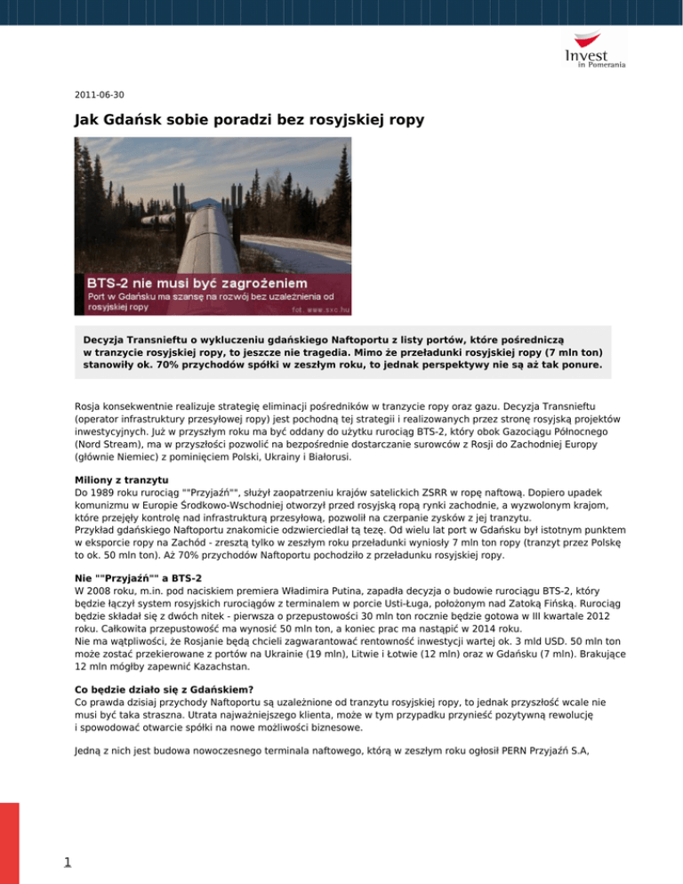 2011-06-30 Jak Gdańsk sobie poradzi bez rosyjskiej ropy Decyzja Transnieftu o wykluczeniu gdańskiego Naftoportu z listy portów, które pośredniczą w tranzycie rosyjskiej ropy, to jeszcze nie tragedia. Mimo że przeładunki rosyjskiej ropy (7 mln ton) stanowiły ok. 70% przychodów spółki w zeszłym roku, to jednak perspektywy nie są aż tak ponure. Rosja konsekwentnie realizuje strategię eliminacji pośredników w tranzycie ropy oraz gazu. Decyzja Transnieftu (operator infrastruktury przesyłowej ropy) jest pochodną tej strategii i realizowanych przez stronę rosyjską projektów inwestycyjnych. Już w przyszłym roku ma być oddany do użytku rurociąg BTS-2, który obok Gazociągu Północnego (Nord Stream), ma w przyszłości pozwolić na bezpośrednie dostarczanie surowców z Rosji do Zachodniej Europy (głównie Niemiec) z pominięciem Polski, Ukrainy i Białorusi. Miliony z tranzytu Do 1989 roku rurociąg ""Przyjaźń"", służył zaopatrzeniu krajów satelickich ZSRR w ropę naftową. Dopiero upadek komunizmu w Europie Środkowo-Wschodniej otworzył przed rosyjską ropą rynki zachodnie, a wyzwolonym krajom, które przejęły kontrolę nad infrastrukturą przesyłową, pozwolił na czerpanie zysków z jej tranzytu. Przykład gdańskiego Naftoportu znakomicie odzwierciedlał tą tezę. Od wielu lat port w Gdańsku był istotnym punktem w eksporcie ropy na Zachód - zresztą tylko w zeszłym roku przeładunki wyniosły 7 mln ton ropy (tranzyt przez Polskę to ok. 50 mln ton). Aż 70% przychodów Naftoportu pochodziło z przeładunku rosyjskiej ropy. Nie ""Przyjaźń"" a BTS-2 W 2008 roku, m.in. pod naciskiem premiera Władimira Putina, zapadła decyzja o budowie rurociągu BTS-2, który będzie łączył system rosyjskich rurociągów z terminalem w porcie Usti-Ługa, położonym nad Zatoką Fińską. Rurociąg będzie składał się z dwóch nitek - pierwsza o przepustowości 30 mln ton rocznie będzie gotowa w III kwartale 2012 roku. Całkowita przepustowość ma wynosić 50 mln ton, a koniec prac ma nastąpić w 2014 roku. Nie ma wątpliwości, że Rosjanie będą chcieli zagwarantować rentowność inwestycji wartej ok. 3 mld USD. 50 mln ton może zostać przekierowane z portów na Ukrainie (19 mln), Litwie i Łotwie (12 mln) oraz w Gdańsku (7 mln). Brakujące 12 mln mógłby zapewnić Kazachstan. Co będzie działo się z Gdańskiem? Co prawda dzisiaj przychody Naftoportu są uzależnione od tranzytu rosyjskiej ropy, to jednak przyszłość wcale nie musi być taka straszna. Utrata najważniejszego klienta, może w tym przypadku przynieść pozytywną rewolucję i spowodować otwarcie spółki na nowe możliwości biznesowe. Jedną z nich jest budowa nowoczesnego terminala naftowego, którą w zeszłym roku ogłosił PERN Przyjaźń S.A, 1 spółka-matka Naftoportu. Gigantyczna inwestycja, o wartości 1 mld PLN, ma być ukończona na przełomie 2013 i 2014 roku. Terminal będzie świadczył zróżnicowane usługi logistyczne na rzecz firm z branży naftowej, paliwowej i chemicznej. W jego skład mają wchodzić zbiorniki o pojemności 400 tys. metrów sześciennych na ropę naftową oraz 300 tys. na produkty paliwowe oraz chemiczne. Przychody terminala mają kształtować się na poziomie ok. 200 mln PLN rocznie. Klientów PERN chce szukać wśród międzynarodowych koncernów handlujących ropą i paliwami. Będzie im oferować możliwość nie tylko przeładunku towarów na tankowce, kolej lub autocysterny, ale również usługi polegające na magazynowaniu i uszlachetnianiu produktów. PERN planuje również zainteresować swoją ofertą krajowe rafinerie. Zwłaszcza Grupa Lotos, która ukończyła realizację Programu 10+ i znacznie zwiększyła swoje możliwości produkcyjne, może być zainteresowana możliwością eksportu swoich produktów. Po drugie, w niedzielę, spółka Lotos E&P Norge, wchodząca w skład Grupy Lotos, ukończyła posadowienie platformy produkcyjnej na złożu ropy naftowej YME na Morzu Północnym. Z tego źródła, Lotos planuje pozyskiwać 400 tys. ton ropy rocznie, która mogłaby trafiać do rafinerii w Gdańsku właśnie przez Naftoport lub przez nowy terminal PERN. Po trzecie, dzięki rozbudowie możliwości przeładunku ropy w gdańskim porcie zwiększą się możliwości zdywersyfikowania źródeł zaopatrzenia Polski w ropę. W 2010 roku Naftoport obsłużył 3 zbiornikowce klasy VLCC (o wyporności od 200 do 320 tys. DWT). Ta liczba może znacznie wzrosnąć w przyszłości, dzięki czemu więcej ropy trafi do Polski z krajów arabskich czy z Norwegii. Co więcej, wraz z opróżnieniem rurociągu Przyjaźń z rosyjska ropą, pojawi się szansa dla PERN na rewers ropy np. z portu w Gdańsku na Ukrainę. Odessa-Brody-Gdańsk zagrożony Jedyną inwestycją, która może stracić sens istnienia, jest przedłużenie rurociągu Odessa-Brody do Gdańska. Jego budowa jest planowana od 2001 roku, kiedy ukończono ukraiński odcinek. Pierwotnie rurociąg miał służyć tranzytowi ropy z krajów położonych nad Morzem Kaspijskim do Europy. Obecnie jednak jest głównie wykorzystywany do przesyłu rosyjskiej ropy z rurociągu Przyjaźń nad Morze Czarne. Rurociąg Odessa-Brody-Gdańsk miał służyć zaopatrywaniu polskich rafinerii w kaspijską ropę oraz dalszemu jej eksportowi przez port w Gdańsku. Niestety, obecnie bardziej prawdopodobne jest, że ropa z Morza Kaspijskiego będzie płynąć przez BTS-2, zwłaszcza że integracja Kazachstanu, jej głównego producenta, z Rosją systematycznie się umacnia. Jej wyrazem jest utworzona w lipcu zeszłego roku unia celna zrzeszająca Białoruś, Kazachstan i Rosję. Pierwszą ""ofiarą"" nowego ugrupowania była Ukraina, która na początku czerwca br. została objęta barierami w handlu zagranicznym, po tym jak odmówiła przystąpienia do unii celnej. Podsumowanie Chociaż na dzień dzisiejszy sytuacja w gdańskim porcie wydaje się niewesoła, to jednak istnieje szansa, że przyniesie 