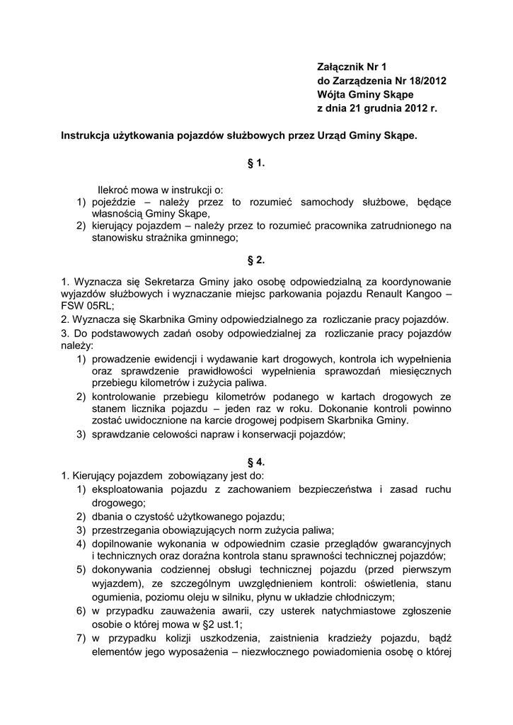 Załącznik Nr 1 do Zarządzenia Nr 18/2012 Wójta Gminy Skąpe z dnia 21 grudnia 2012 r. Instrukcja użytkowania pojazdów służbowych przez Urząd Gminy Skąpe. § 1. Ilekroć mowa w instrukcji o: 1) pojeździe – należy przez to rozumieć samochody służbowe, będące własnością Gminy Skąpe, 2) kierujący pojazdem – należy przez to rozumieć pracownika zatrudnionego na stanowisku strażnika gminnego; § 2. 1. Wyznacza się Sekretarza Gminy jako osobę odpowiedzialną za koordynowanie wyjazdów służbowych i wyznaczanie miejsc parkowania pojazdu Renault Kangoo – FSW 05RL; 2. Wyznacza się Skarbnika Gminy odpowiedzialnego za rozliczanie pracy pojazdów. 3. Do podstawowych zadań osoby odpowiedzialnej za rozliczanie pracy pojazdów należy: 1) prowadzenie ewidencji i wydawanie kart drogowych, kontrola ich wypełnienia oraz sprawdzenie prawidłowości wypełnienia sprawozdań miesięcznych przebiegu kilometrów i zużycia paliwa. 2) kontrolowanie przebiegu kilometrów podanego w kartach drogowych ze stanem licznika pojazdu – jeden raz w roku. Dokonanie kontroli powinno zostać uwidocznione na karcie drogowej podpisem Skarbnika Gminy. 3) sprawdzanie celowości napraw i konserwacji pojazdów; § 4. 1. Kierujący pojazdem zobowiązany jest do: 1) eksploatowania pojazdu z zachowaniem bezpieczeństwa i zasad ruchu drogowego; 2) dbania o czystość użytkowanego pojazdu; 3) przestrzegania obowiązujących norm zużycia paliwa; 4) dopilnowanie wykonania w odpowiednim czasie przeglądów gwarancyjnych i technicznych oraz doraźna kontrola stanu sprawności technicznej pojazdów; 5) dokonywania codziennej obsługi technicznej pojazdu (przed pierwszym wyjazdem), ze szczególnym uwzględnieniem kontroli: oświetlenia, stanu ogumienia, poziomu oleju w silniku, płynu w układzie chłodniczym; 6) w przypadku zauważenia awarii, czy usterek natychmiastowe zgłoszenie osobie o której mowa w §2 ust.1; 7) w przypadku kolizji uszkodzenia, zaistnienia kradzieży pojazdu, bądź elementów jego wyposażenia – niezwłocznego powiadomienia osobę o której mowa w §2 ust.1, a w przypadku wypadku drogowego niezwłocznego powiadomienia policji; 8) należytego przechowywania kluczy do pojazdu, a także dokumentów pojazdu; 9) bieżącego dokonywania wpisów w kartach drogowych; 10) rozliczanie kart drogowych 11) sporządzanie miesięcznych rozliczeń zakupu i zużycia paliwa. 2. Kierującemu pojazdem zabrania się udostępniania pojazdu osobom trzecim. 3. Po zakończonej pracy pojazd parkowany jest w miejscu do tego wyznaczonym lub po uzyskaniu zgody osoby o której mowa w § 2 ust. 1 - w miejscu zamieszkania kierującego pojazdem, bądź innym miejscu odpowiednio do tego przygotowanym i zabezpieczonym. § 5. 1. Ewidencjonowanie przejazdów pojazdu prowadzone jest przez kierujących pojazdami na ponumerowanych kartach drogowych z zachowaniem ciągłości zapisów w kolejnych dniach miesiąca, z wyszczególnieniem celu przejazdu - w rozliczeniu miesięcznym. 2. Pracownika, który przyjął pojazd obowiązują następujące zasady: 1) pracownik ma obowiązek rzetelnie i zgodnie z rzeczywistością dokumentować fakt przejazdu pojazdem; 2) pracownik może używać pojazd wyłącznie do podróży służbowych; 3) każdorazowe korzystanie z pojazdu powinno być dokumentowane przez kierującego pojazdem wpisem do karty drogowej – z podaniem celu wyjazdu; 4) gdy przejazd poza granicami administracyjnymi gminy jest wykonywany z pasażerem - wykonaną jazdę powinien potwierdzić pasażer pojazdu (w sposób umożliwiający późniejszą identyfikację). 5) przy jazdach w granicach administracyjnych gminy należy wpisywać w karcie drogowej adnotację "jazda po gminie", bez wpisywania celu przejazdu 3. Fakt zatankowania paliwa należy odnotować w karcie drogowej pojazdu z podaniem ilości zatankowanego paliwa i datą tankowania. 4. Osoba tankująca ma obowiązek każdorazowo potwierdzić prawidłowość tankowanego paliwa: ilość i rodzaju zatankowanego paliwa. 5. Kierujący pojazdem przed otrzymaniem karty drogowej w kolejnym miesiącu ma obowiązek zdać osobie odpowiedzialnej za rozliczanie pracy pojazdu wypełnione miesięczne rozliczenie zakupu i zużycia paliwa wraz ze wszystkimi wypełnionymi kartami drogowymi z rozliczanego miesiąca. §6. 1. Rozliczanie zakupu i zużycia paliwa dokonywane jest w okresach kwartalnych poprzez „Kwartalne rozliczenie zakupu i zużycia paliwa” na podstawie wypełnionych kart drogowych. 2. Kwartalne rozliczenie zakupu i zużycia paliwa wypełnia kierujący pojazdem; 3. Kierujący pojazdem niezwłocznie po zakończeniu okresu rozliczeniowego przedkłada osobie odpowiedzialnej za rozliczanie pracy pojazdu kwartalne rozliczenie zakupu i zużycia paliwa. 4. Pojazd przekraczający ustaloną normę zakładową z powodu technicznej niesprawności, powinien natychmiast być przywrócony do stanu technicznego zapewniającego zużycie paliwa w granicach ustalonych norm. 5. W przypadkach awaryjnych np. pęknięcia zbiornika lub przewodu paliwowego, wycieku z układu zasilania należy ten fakt każdorazowo odnotować w karcie drogowej pojazdu oraz powiadomić osobę o której mowa w §2 ust.1. 6. W celu prawidłowego rozliczenia zużytego paliwa zobowiązuje się kierującego pojazdem do tankowania ostatniego dnia każdego kwartału do pełna z wpisaniem aktualnego stanu licznika w czasie tankowania i rozliczenia zużycia paliwa od ostatniego tankowania do pełna celem stwierdzenia czy pojazd mieści się w ustalonej normie, czy też posiada przepał lub oszczędność. Dopuszcza się odstępstwo od obowiązku tankowania ostatniego dnia każdego kwartału do pełna jeżeli w danym kwartale nie zostało wykonanych ponad 100 km, bądź awaria pojazdu to uniemożliwia. Rozliczenie ww. przypadku może nastąpić po ustaniu przyczyny. 7. Rozliczenie kierujących pojazdami z pobranego paliwa należy dokonywać na następujących zasadach: 1) okresem rozliczeniowym jest miesią