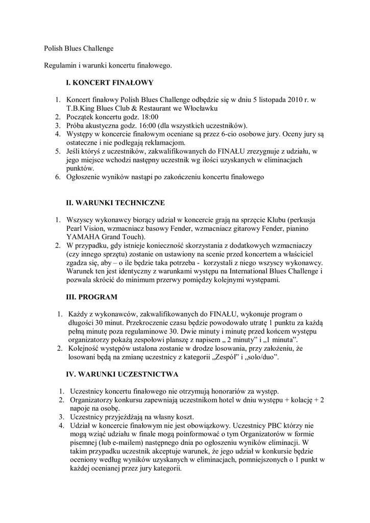 Polish Blues Challenge Regulamin i warunki koncertu finałowego. I. KONCERT FINAŁOWY 1. Koncert finałowy Polish Blues Challenge odbędzie się w dniu 5 listopada 2010 r. w T.B.King Blues Club & Restaurant we Włocławku 2. Początek koncertu godz. 18:00 3. Próba akustyczna godz. 16:00 (dla wszystkich uczestników). 4. Występy w koncercie finałowym oceniane są przez 6-cio osobowe jury. Oceny jury są ostateczne i nie podlegają reklamacjom. 5. Jeśli któryś z uczestników, zakwalifikowanych do FINAŁU zrezygnuje z udziału, w jego miejsce wchodzi następny uczestnik wg ilości uzyskanych w eliminacjach punktów. 6. Ogłoszenie wyników nastąpi po zakończeniu koncertu finałowego II. WARUNKI TECHNICZNE 1. Wszyscy wykonawcy biorący udział w koncercie grają na sprzęcie Klubu (perkusja Pearl Vision, wzmacniacz basowy Fender, wzmacniacz gitarowy Fender, pianino YAMAHA Grand Touch). 2. W przypadku, gdy istnieje konieczność skorzystania z dodatkowych wzmacniaczy (czy innego sprzętu) zostanie on ustawiony na scenie przed koncertem a właściciel zgadza się, aby – o ile będzie taka potrzeba - korzystali z niego wszyscy wykonawcy. Warunek ten jest identyczny z warunkami występu na International Blues Challenge i pozwala skrócić do minimum przerwy pomiędzy kolejnymi występami. III. PROGRAM 1. Każdy z wykonawców, zakwalifikowanych do FINAŁU, wykonuje program o długości 30 minut. Przekroczenie czasu będzie powodowało utratę 1 punktu za każdą pełną minutę poza regulaminowe 30. Dwie minuty i minutę przed końcem występu organizatorzy pokażą zespołowi planszę z napisem „ 2 minuty” i „1 minuta”. 2. Kolejność występów ustalona zostanie w drodze losowania, przy założeniu, że losowani będą na zmianę uczestnicy z kategorii „Zespół” i „solo/duo”. IV. WARUNKI UCZESTNICTWA 1. Uczestnicy koncertu finałowego nie otrzymują honorariów za występ. 2. Organizatorzy konkursu zapewniają uczestnikom hotel w dniu występu + kolację + 2 napoje na osobę. 3. Uczestnicy przyjeżdżają na własny koszt. 4. Udział w koncercie finałowym nie jest obowiązkowy. Uczestnicy PBC którzy nie mogą wziąć udziału w finale mogą poinformować o tym Organizatorów w formie pisemnej (lub e-mailem) następnego dnia po ogłoszeniu wyników eliminacji. W takim przypadku uczestnik akceptuje warunek, że jego udział w konkursie będzie oceniony według wyników uzyskanych w eliminacjach, pomniejszonych o 1 punkt w każdej ocenianej przez jury kategorii. 5. Zwycięzcami w obu kategoriach zostają wykonawcy, którzy zdobyli największą ilość punktów. W przypadku remisu, decyduje losowanie. 6. W składzie zwycięzców w obu kategoriach nie mogą występować te same osoby. W przypadku gdy w wyniku oceny jury zdarzy się, że w obu kategoriach znajdzie się chociaż jeden ten sam wykonawca jest on zobowiązany zadecydować, w której kategorii chce jechać na IBC w Memphis, a na jego miejsce w drugiej kategorii wchodzi następny wykonawca (zgodnie ze zdobytą punktacją). Warunek ten wynika z regulaminu International Blues Challenge. Komitet Organizacyjny P.B.C.