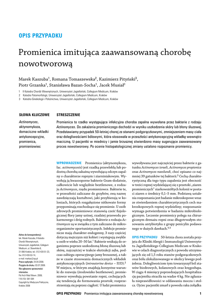 opis przypadku Promienica imitująca zaawansowaną chorobę nowotworową Marek Kaszuba1, Romana Tomaszewska2 , Kazimierz Pityński3 , Piotr Grzanka1, Stanisława Bazan-Socha1, Jacek Musiał1 1 II Katedra Chorób Wewnętrznych, Uniwersytet Jagielloński, Collegium Medicum, Kraków 2 Katedra Patomorfologii, Uniwersytet Jagielloński, Collegium Medicum, Kraków 3 Katedra Ginekologii i Położnictwa, Uniwersytet Jagielloński, Collegium Medicum, Kraków Słowa kluczowe Streszczenie Actinomyces, aktynomykoza, domaciczne wkładki antykoncepcyjne, promienica, promieniowiec Promienica to rzadko występująca infekcyjna choroba zapalna wywołana przez bakterie z rodzaju Actinomyces. Do zakażenia promieniczego dochodzi w wyniku uszkodzenia skóry lub błony śluzowej. Przedstawiamy przypadek 50-letniej chorej ze stanami podgorączkowymi, zmniejszeniem masy ciała oraz dolegliwościami bólowymi, która stosowała w przeszłości antykoncepcyjną wkładkę wewnątrzmaciczną. U pacjentki w miednicy i jamie brzusznej stwierdzono masy sugerujące zaawansowany proces nowotworowy. Po ocenie histopatologicznej zmiany ustalono rozpoznanie promienicy. Adres do korespondencji: lek. Marek Kaszuba, II Katedra Chorób Wewnętrznych, Uniwersytet Jagielloński, Collegium Medicum, ul. Skawińska 8, 31-066 Kraków, tel.: 012-430-51-23, fax: 012-430-53-14, e-mail: [email protected] Praca wpłynęła: 24.04.2008. Przyjęta do druku: 03.07.2008. Nie zgłoszono sprzeczności interesów. Pol Arch Med Wewn. 2008; 118 (10): 581-584 Copyright by Medycyna Praktyczna, Kraków 2008 Wprowadzenie Promienica (aktynomykoza, łac. actinomycosis) jest rzadką przewlekłą lub podostrą chorobą zakaźną wywołującą odczyn zapalny o charakterze ropnym i ziarniniakowym. Wywołują ją kwasooporne bakterie Gram-dodatnie, całkowicie lub względnie beztlenowe, z rodzaju Actinomyces, rzędu promieniowce. Bakterie te, w przeszłości zaliczane do grzybów, swą nazwę zawdzięczają kształtowi, jaki przybierają w koloniach, których rozgałęzione nitkowate formy przypominają rozchodzące się promienie. U osób zdrowych promieniowce stanowią cześć fizjologicznej flory jamy ustnej, rzadziej przewodu pokarmowego i dróg rodnych. Bakterie z rodzaju Ac‑ tinomyces są w związku z tym zaliczane do mikroorganizmów oportunistycznych. Infekcje promienicze mają charakter endogenny, 3 razy częściej dotyczą mężczyzn niż kobiet i występują zwykle u osób w wieku 20–50 lat.1 Bakterie wnikają do organizmu poprzez uszkodzoną błonę śluzową lub skórę, najczęściej w trakcie ekstrakcji zęba, podczas zabiegu operacyjnego jamy brzusznej, a także w czasie stosowania domacicznych wkładek antykoncepcyjnych (intrauterine device – IUD).2 W miejscu, w którym znajdują korzystne warunki do rozwoju (środowisko beztlenowe), promieniowce wywołują powstanie ropni, cechujących się tendencją do formowania przetok; rozprzestrzeniają się poprzez ciągłość. U ludzi promienica wywoływana jest najczęściej przez bakterie z gatunku Actinomyces israeli, Actinomyces propionica oraz Actinomyces naeslundi, choć opisano co najmniej 39 gatunków tej bakterii.3 Cechą charakterystyczną dla tego typu zapalenia jest obecność w treści ropnej wydzielającej się z przetoki „ziaren promieniczych” siarkowożółtych kolonii w postaci ziaren o średnicy 0,1–5 mm. Podstawą ustalenia rozpoznania jest badanie mikroskopowe wraz ze stwierdzeniem charakterystycznych cech makroskopowych ropnej wydzieliny; rozpoznanie wymaga potwierdzenia w badaniu mikrobiologicznym. Leczenie promienicy polega na chirurgicznym drenażu ropni oraz długotrwałym stosowaniu antybiotyku z grupy penicylin podawanego w dużych dawkach.4,5 Opis przypadku 50-letnia chora została przyjęta do Kliniki Alergii i Immunologii Uniwersytetu Jagiellońskiego Collegium Medicum w Krakowie w celach diagnostycznych z powodu utrzymujących się od 1,5 roku stanów podgorączkowych oraz bólu zlokalizowanego w okolicy lewego podżebrza. Dolegliwościom tym towarzyszył ból stawów biodrowych, kolanowych oraz kręgosłupa. W ciągu 4 miesięcy poprzedzających hospitalizację pacjentka straciła na wadze 4 kg. Nie zgłaszała nieprawidłowości w oddawaniu moczu i stolca. Ojciec pacjentki zmarł z powodu raka żołądka OPIS PRZYPADKU Promienica imitująca zaawansowaną chorobę nowotworową 1 RYCINA 1 Tomografia komputerowa miednicy – w anatomicznej lokalizacji prawego jajnika widoczny jest silnie wzmacniający, niejednorodny naciek guzowaty średnicy około 4 cm (strzałka) RYCINA 2 Tomografia komputerowa jamy brzusznej – w zakresie ściany jamy brzusznej w obrębie lewego podżebrza widoczny jest naciek na przekroju poprzecznym, około 10 × 4 cm, niejednorodnie, silnie wzmacniający po podaniu środka cieniującego, rozciągający się na długości około 10 cm (strzałka) w 49. roku życia. Przed 26 laty chorej usunięto pęcherzyk żółciowy z powodu kamicy. W badaniu fizykalnym w okolicy lewego podżebrza stwierdzono opór o nieostrych granicach i średnicy około 5–10 cm. W miejscu tym występowała nieznaczna bolesność uciskowa. Poza tym na skórze lewego podudzia zaobserwowano pojedynczą wybroczynę o średnicy około 3 mm, a na skórze kończyn siność siatkowatą. Drobne wybroczyny na kończynach oraz twarzy chora obserwowała już wcześniej; ustępowały samoistnie. W badaniach laboratoryjnych wykonanych przed hospitalizacją obserwowano zwiększenie markerów stanu zapalnego: OB 128 mm/h, białko C‑reaktywne (C‑reactive protein – CRP) 23 mg/l (norma: <8 mg/l) oraz nadpłytkowość – liczba płytek krwi 519 000/mm3 (norma: <440 000/mm3). W gastroskopii stwierdzono jedynie przepuklinę rozworu przełykowego. RYCINA 3 Materiał pobrany drogą biopsji aspiracyjnej cienkoigłowej – wśród treści ropnej widoczne są charakterystyczne kolonie promieniowca (barwienie hematoksylina–eozyna; powiększenie 100 ×) 2 W badaniu kolonoskopowy