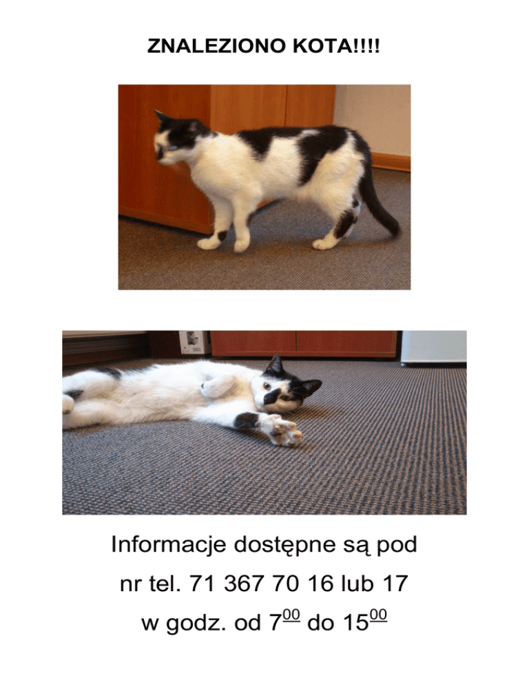 ZNALEZIONO KOTA!!!! Informacje dostępne są pod nr tel. 71 367 70 16 lub 17 00 w godz. od 7 do 15 00
